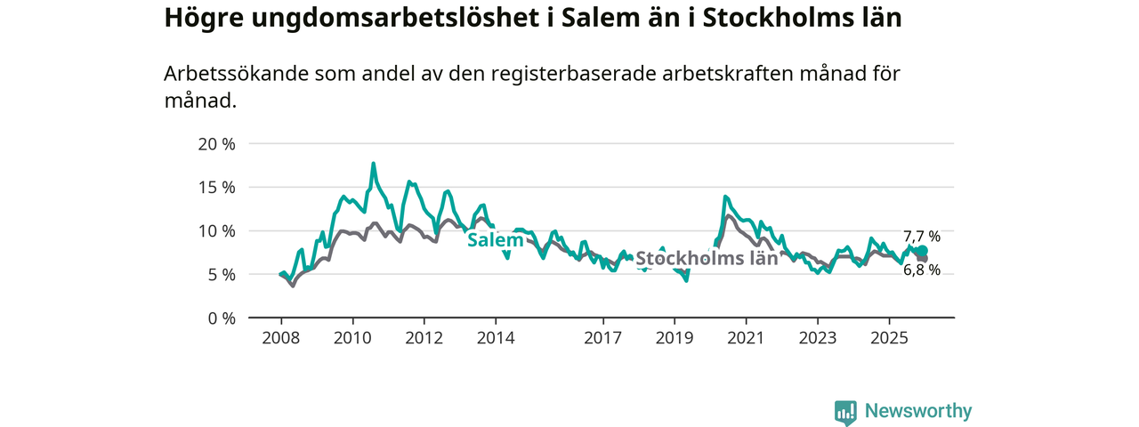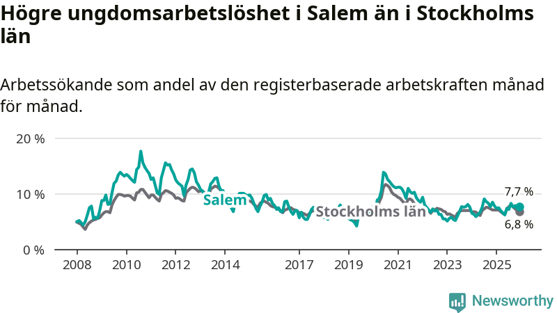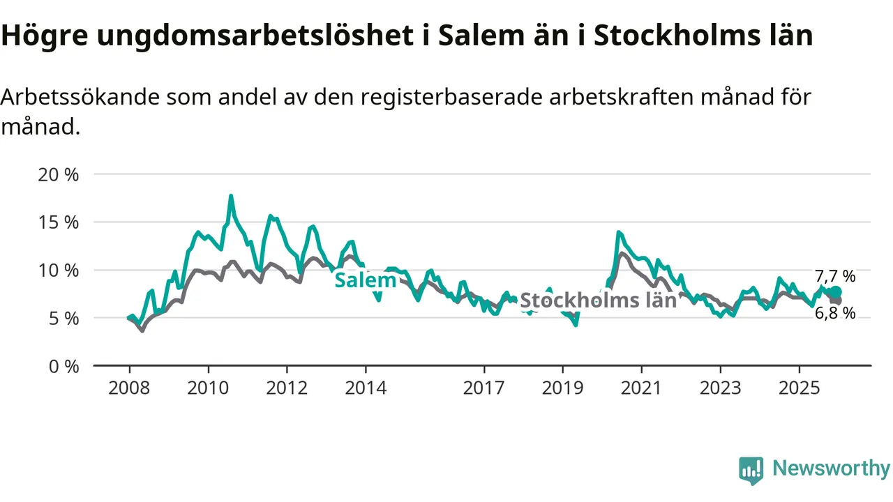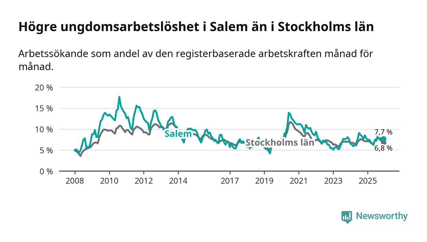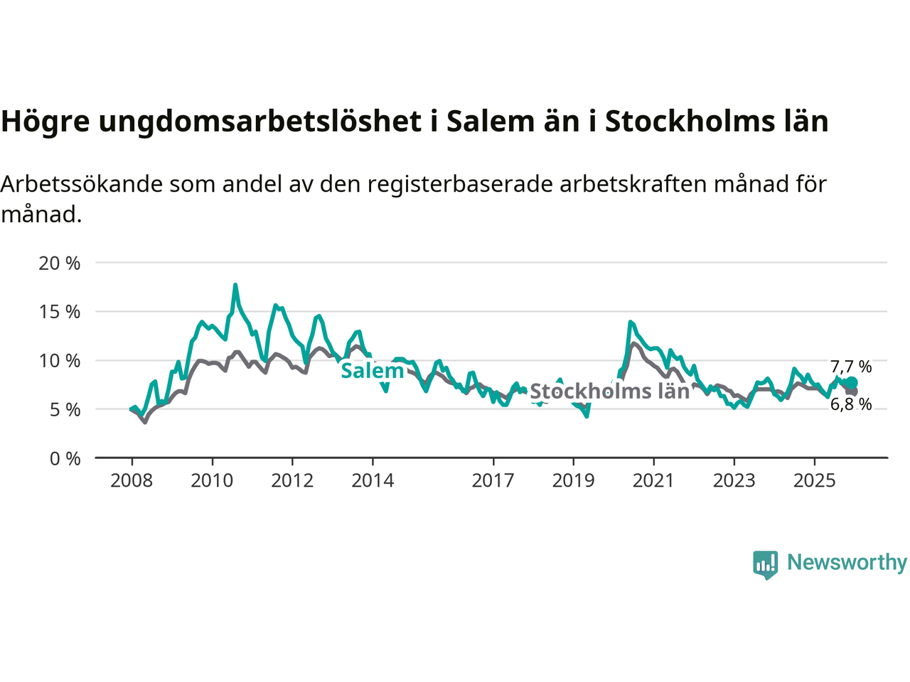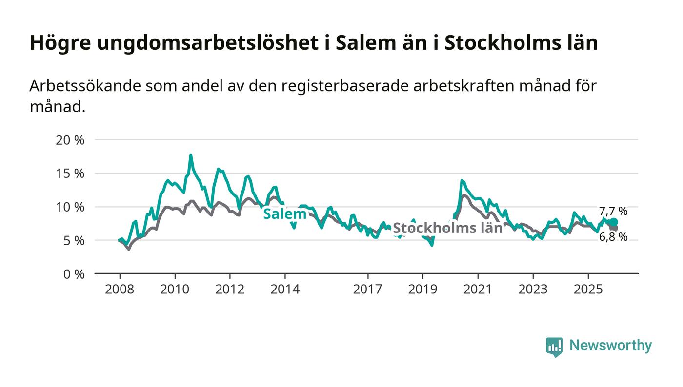 Medan Salem har lägre total arbetslöshet än Stockholms län, ligger ungdomsarbetslösheten 0,9 procentenheter högre i Salem.