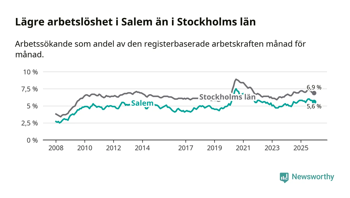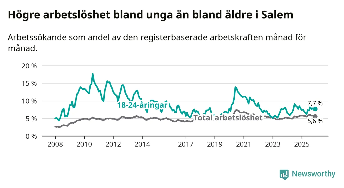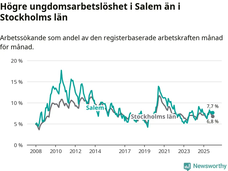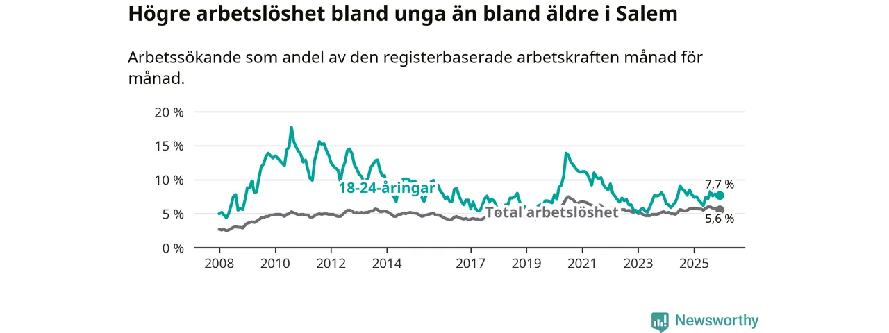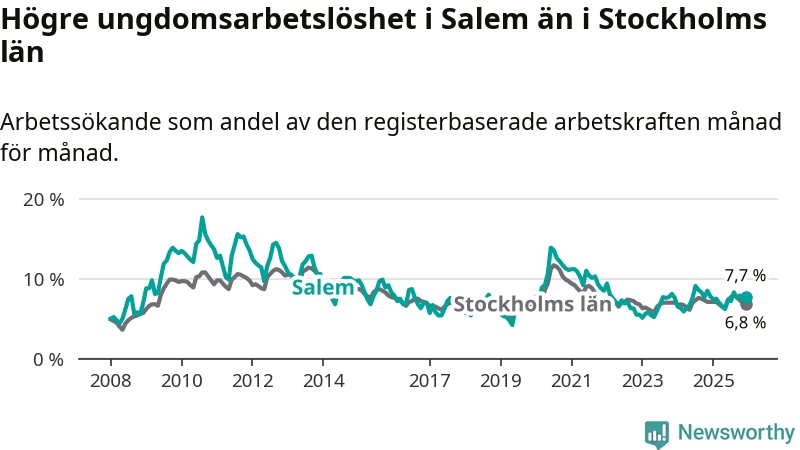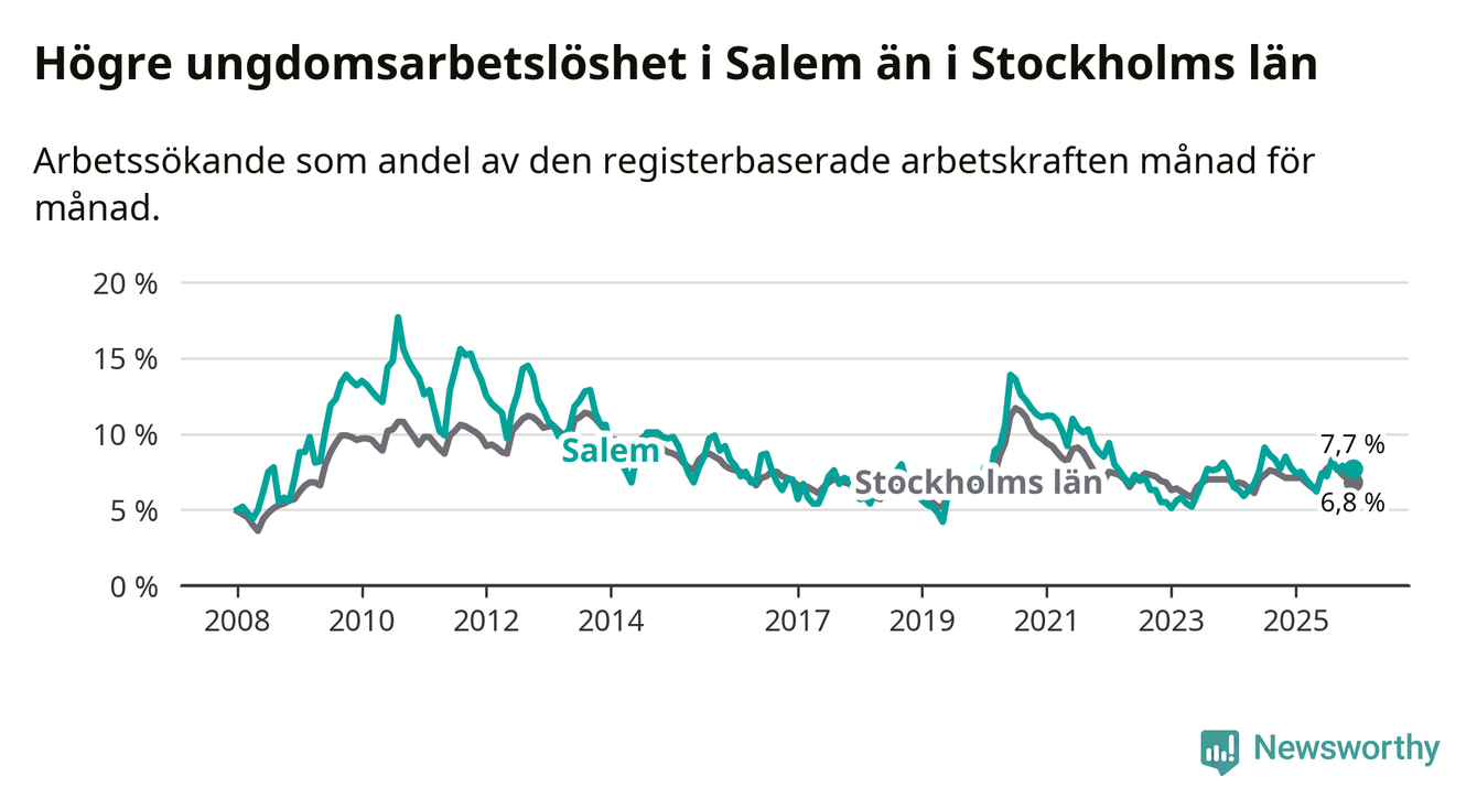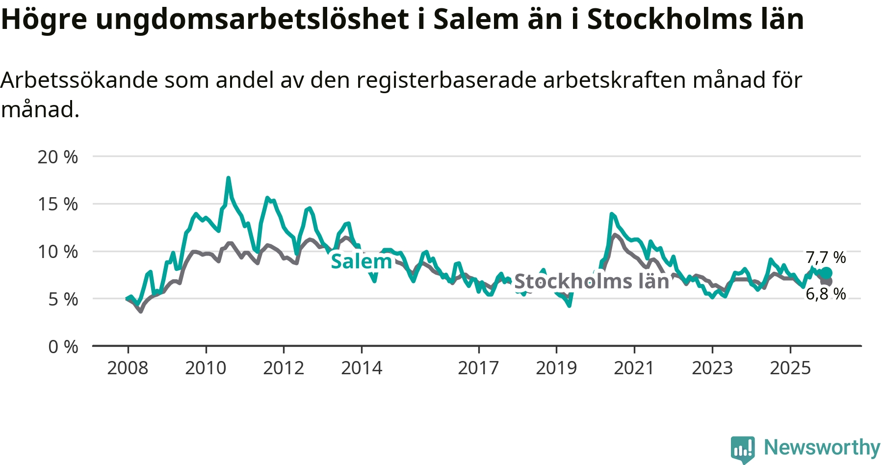 Medan Salem har lägre total arbetslöshet än Stockholms län, ligger ungdomsarbetslösheten 0,9 procentenheter högre i Salem.