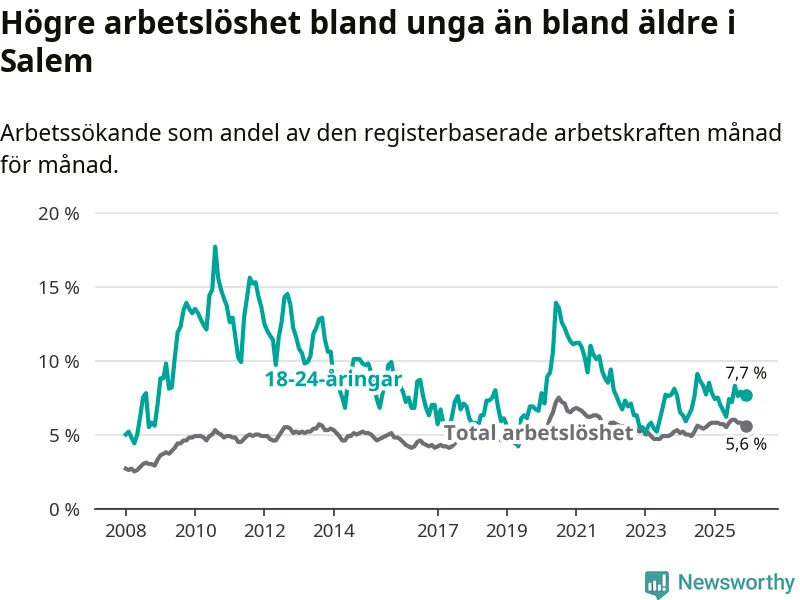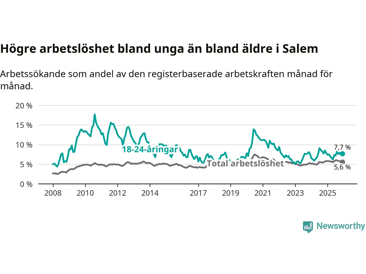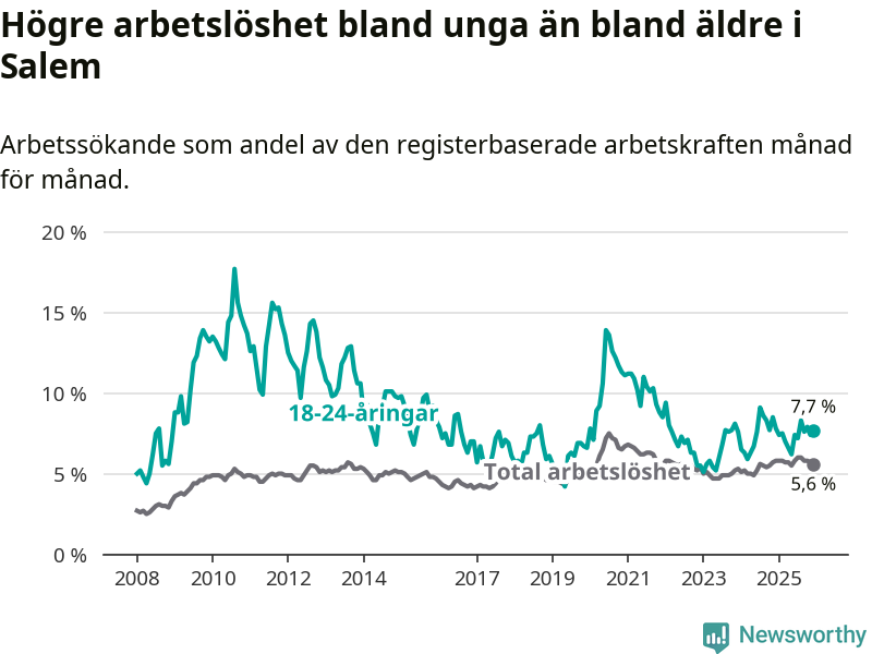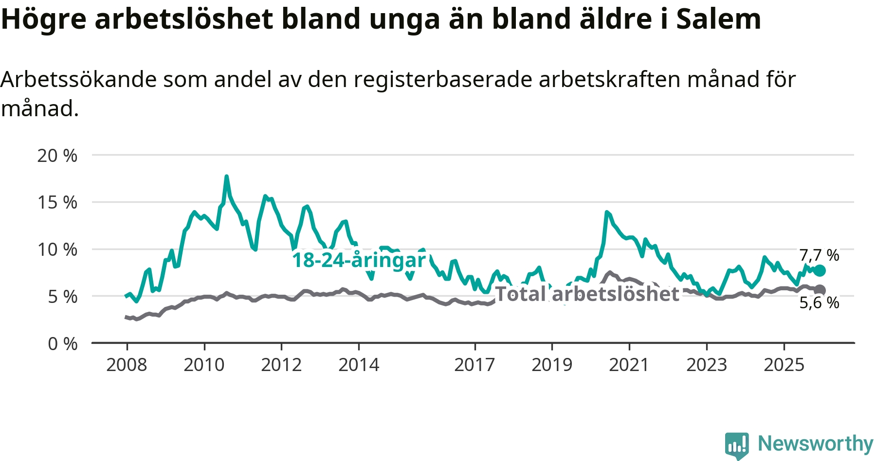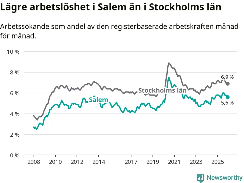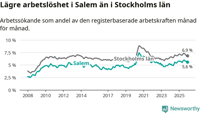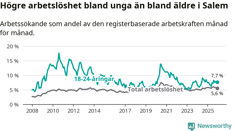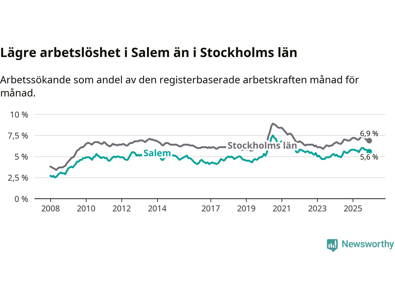 Medan Salem har lägre total arbetslöshet än Stockholms län, ligger ungdomsarbetslösheten 0,9 procentenheter högre i Salem.