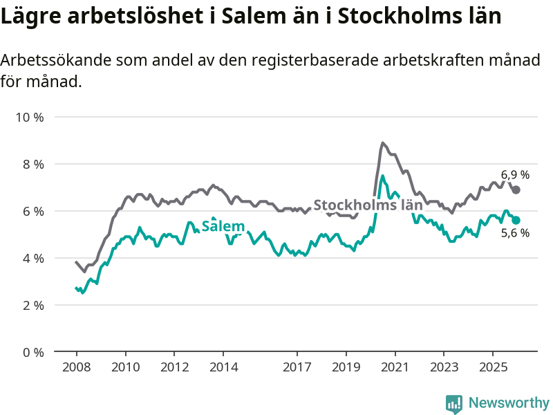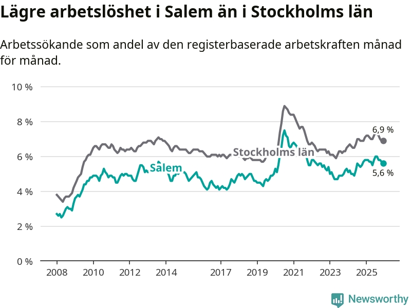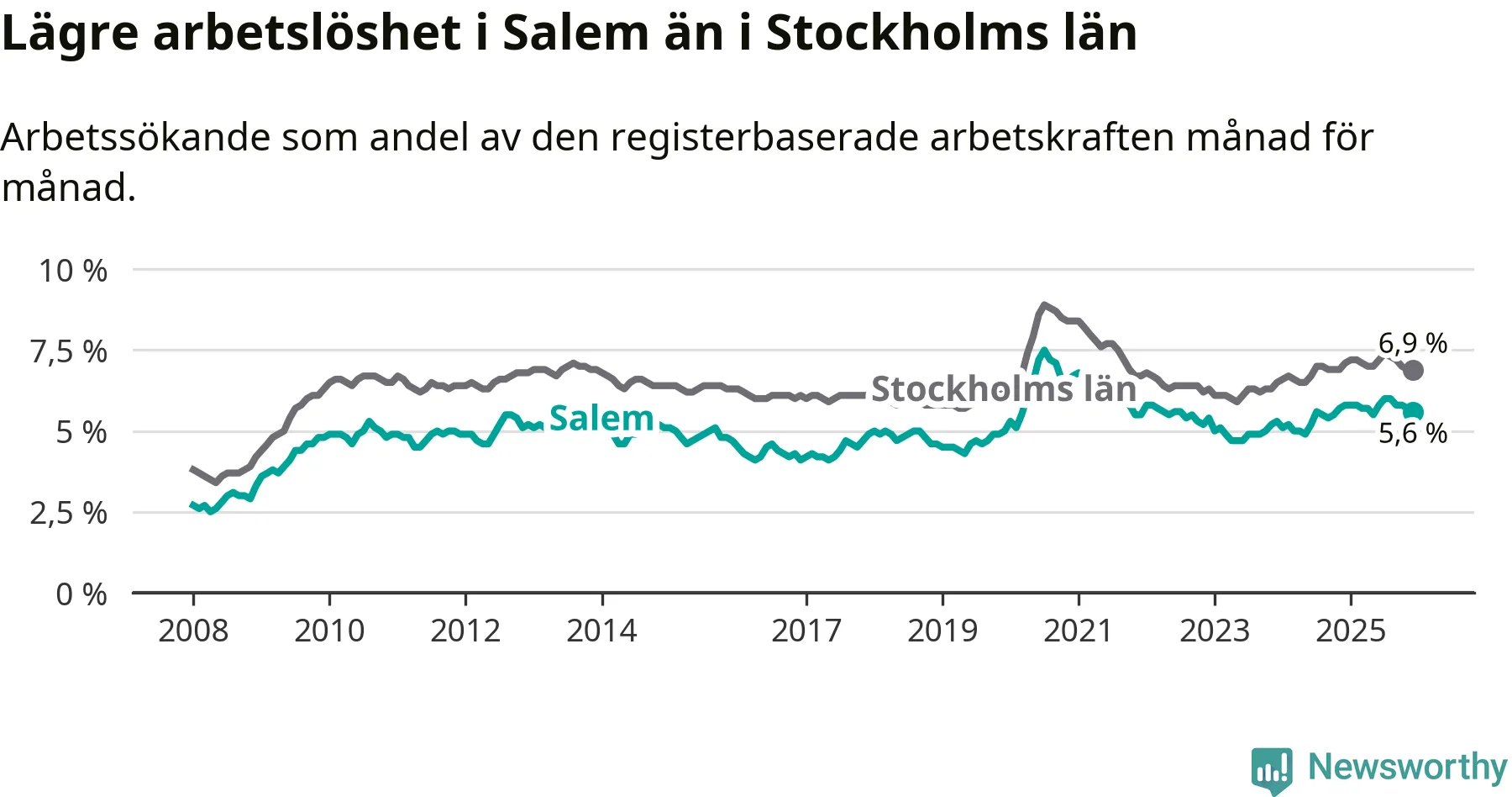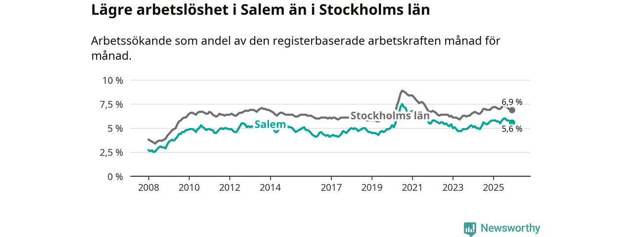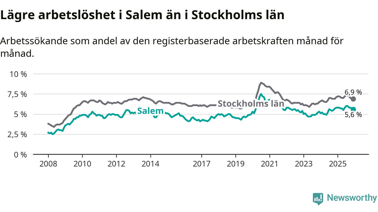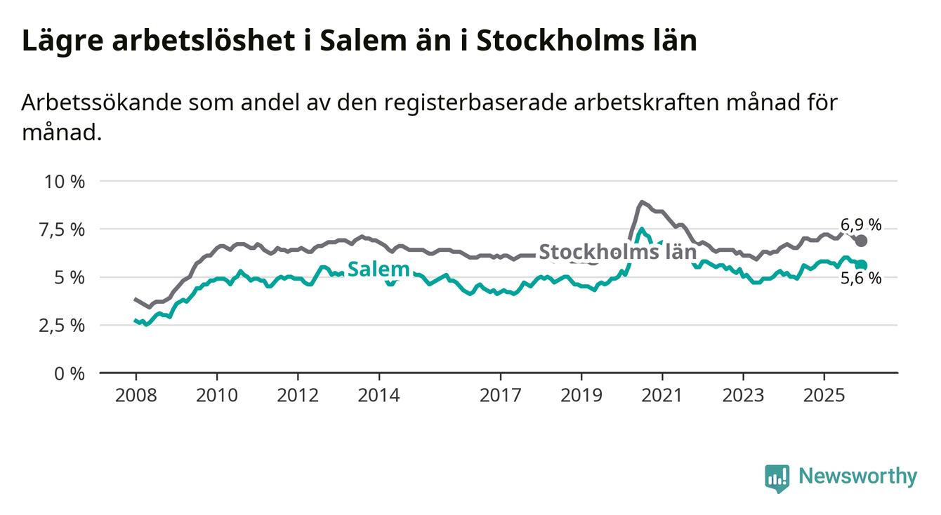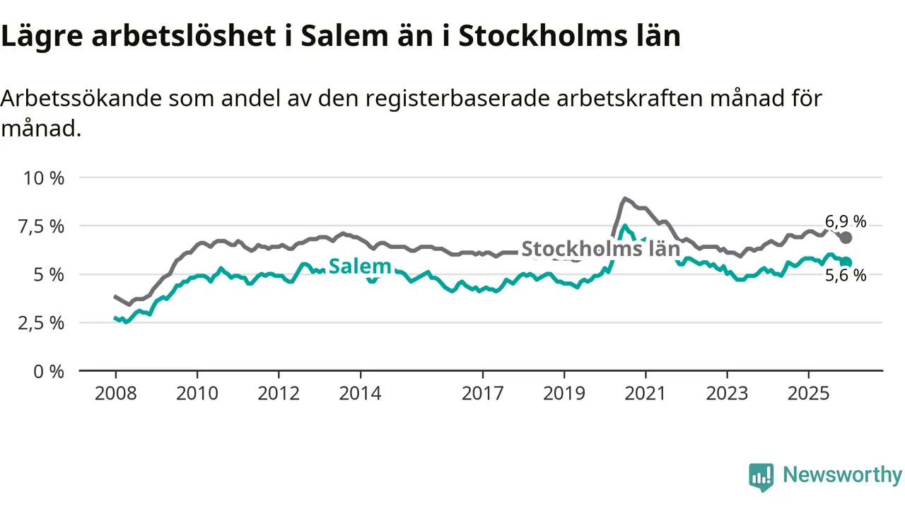 Graf: Arbetslöshet i Salems kommun och Stockholms län