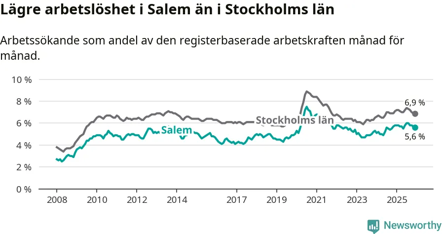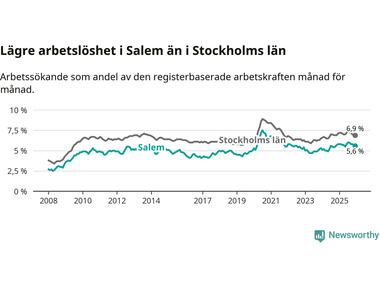 Under december månad rapporterade Salems kommun en total arbetslöshet på 5,6 procent. Det är en minskning jämfört med samma tidpunkt i fjol (−0,2 procentenheter). Även i Stockholms län sjunker arbetslösheten något.