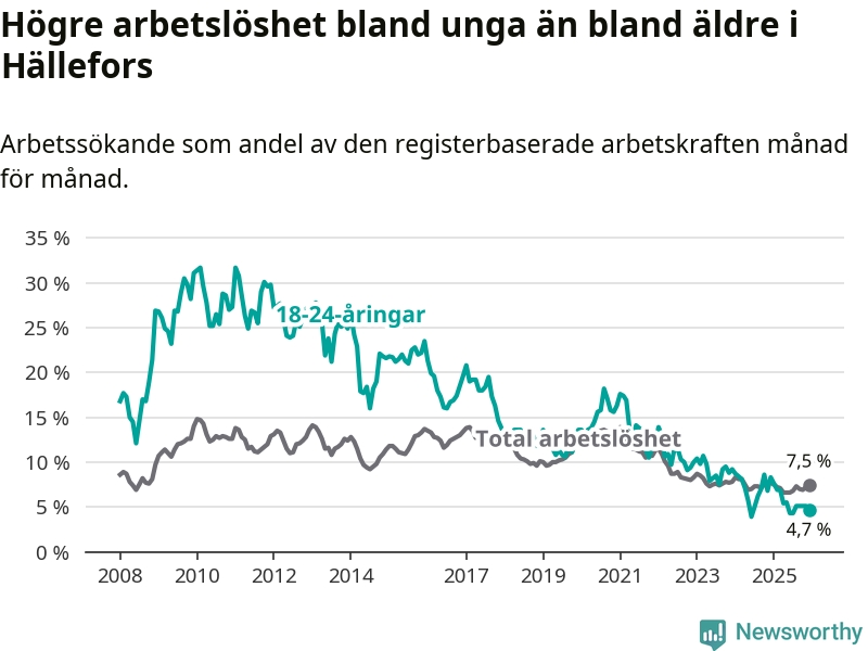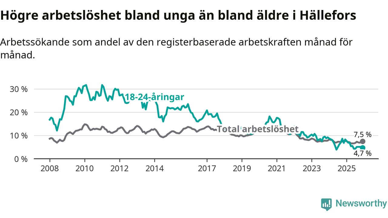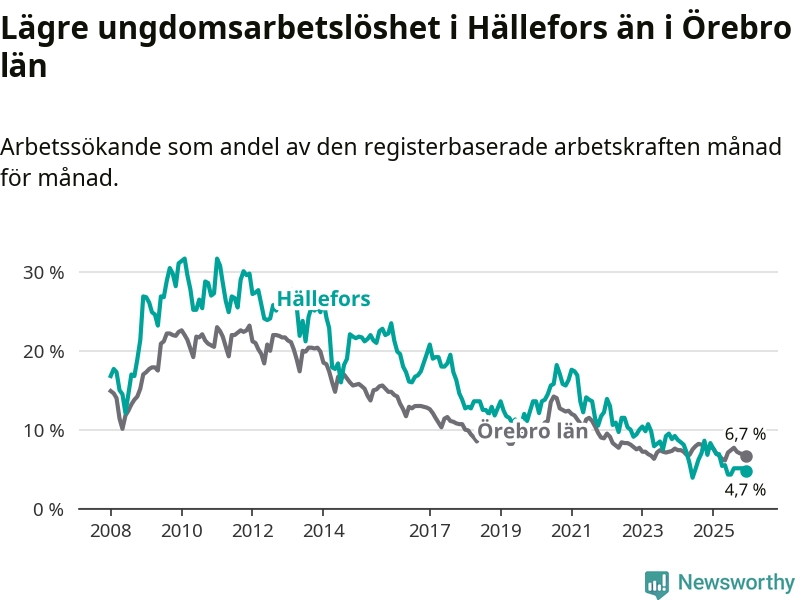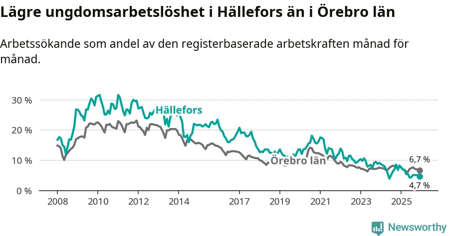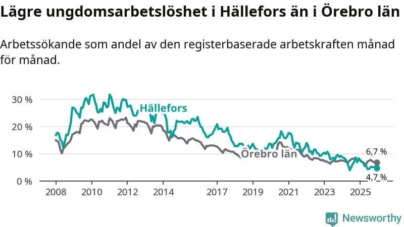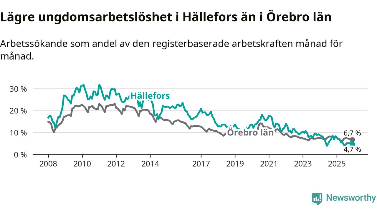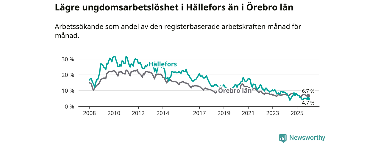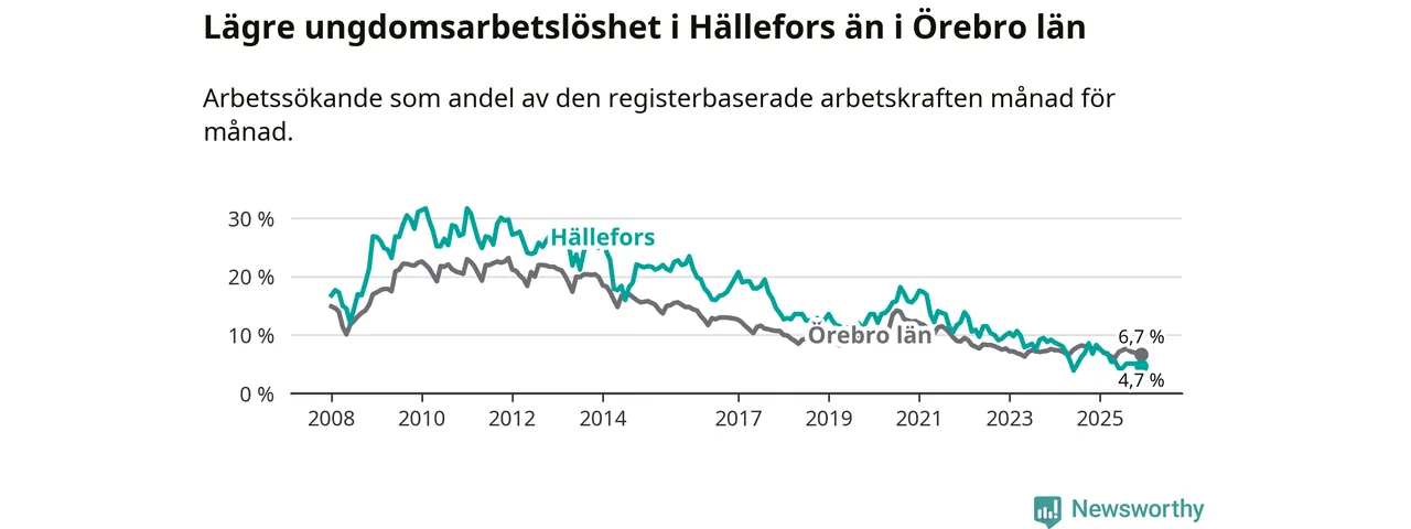 Medan Hällefors har högre total arbetslöshet än Örebro, ligger ungdomsarbetslösheten 2,0 procentenheter lägre i Hällefors.