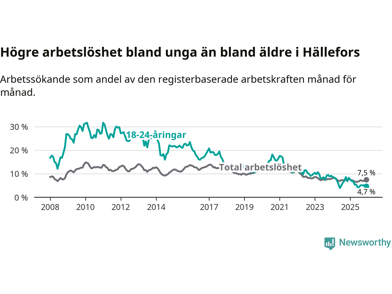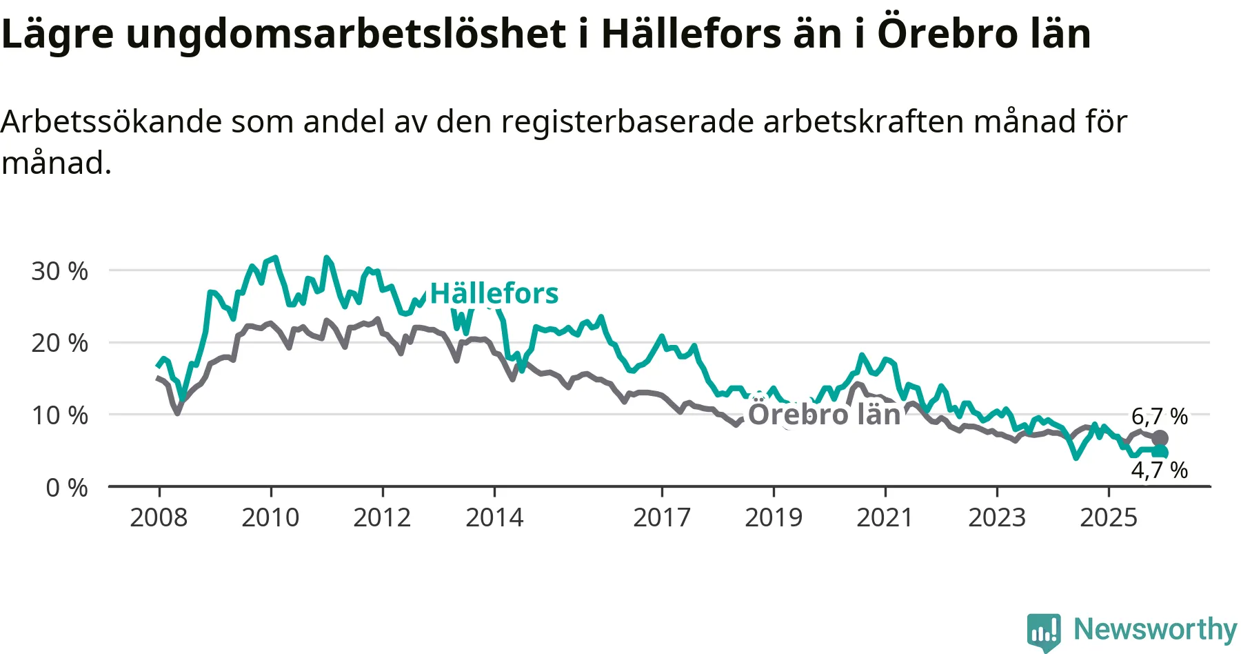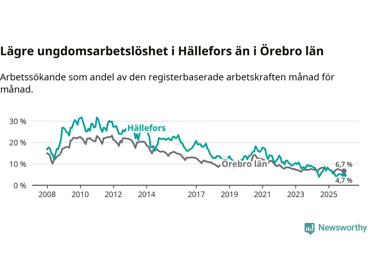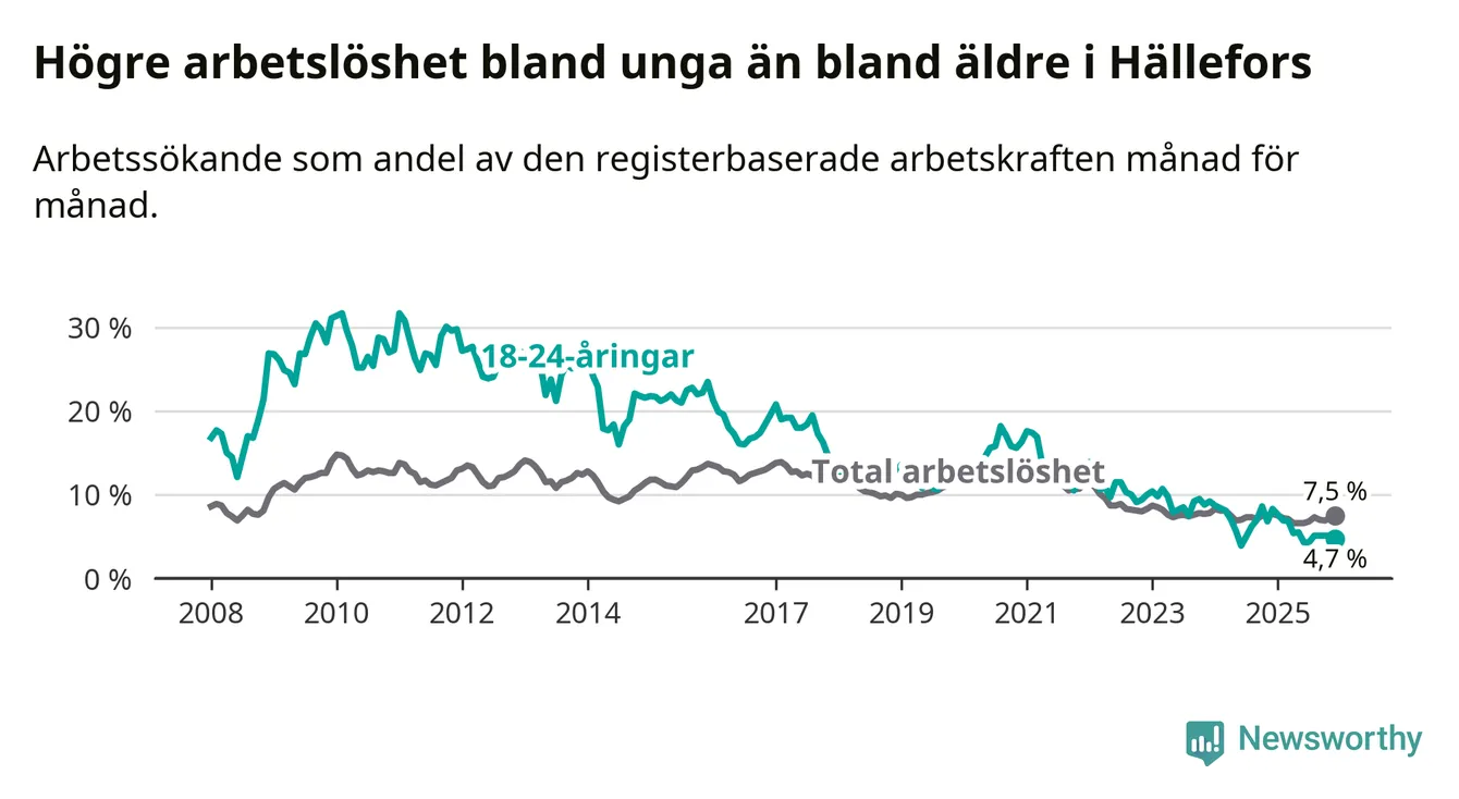 Medan Hällefors har högre total arbetslöshet än Örebro, ligger ungdomsarbetslösheten 2,0 procentenheter lägre i Hällefors.