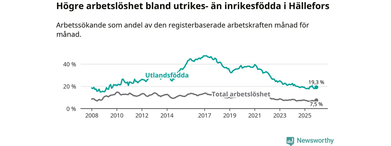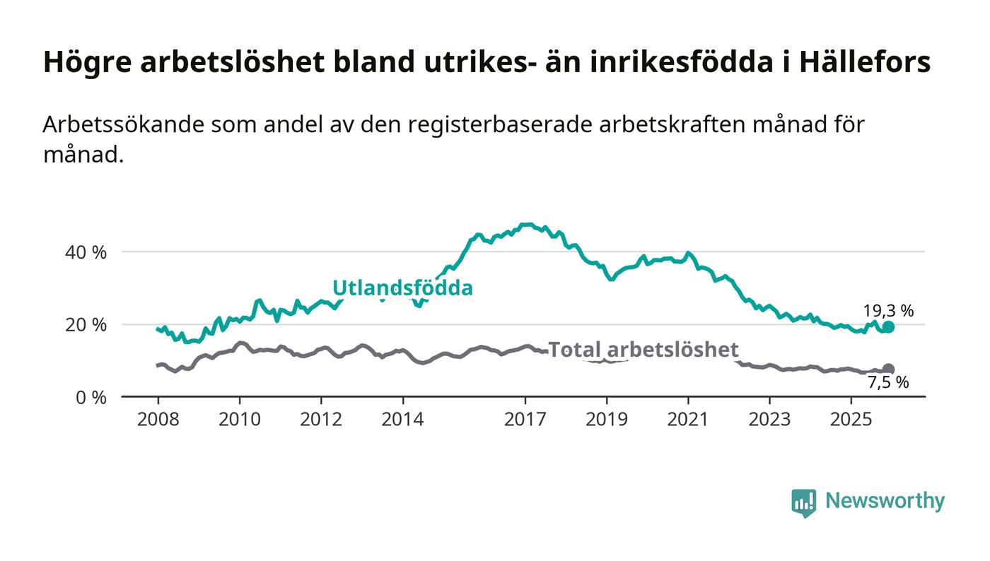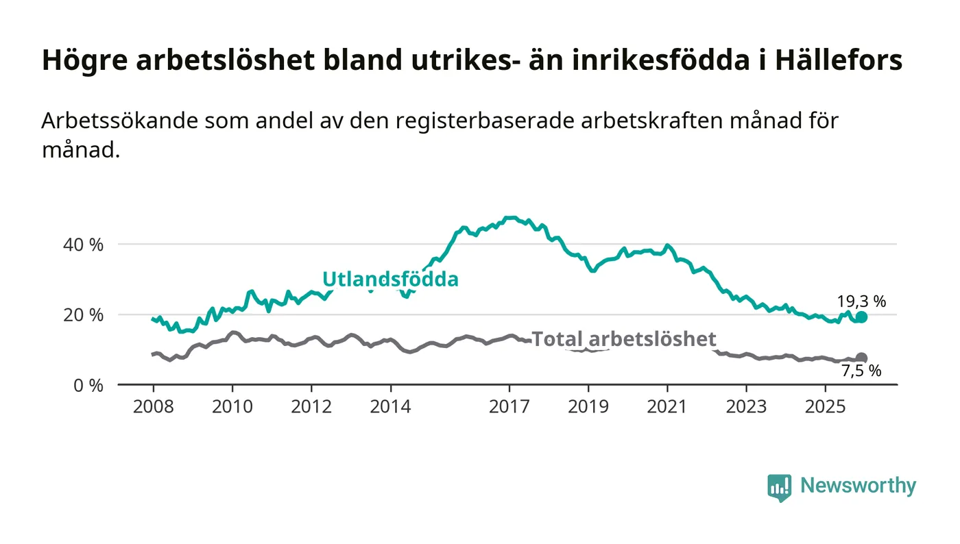 Arbetslösheten bland utlandsfödda var 19,3 procent i Hällefors under december månad, motsvarande 88 av 456 personer. Det är 0,1 procentenheter färre än vid samma tidpunkt i fjol (−10 om man räknar personer).
