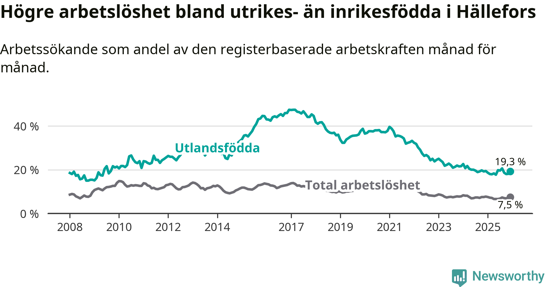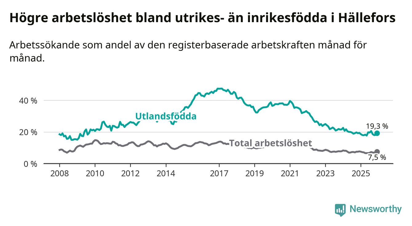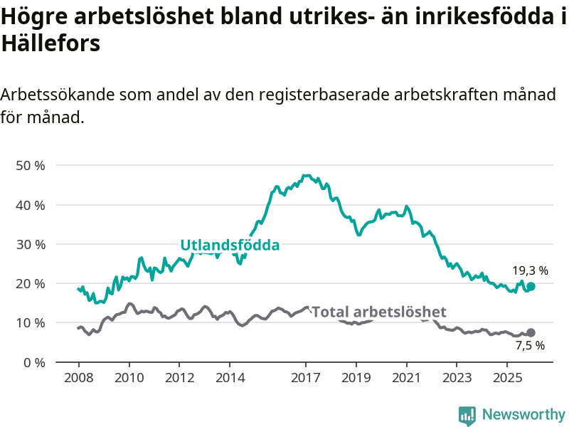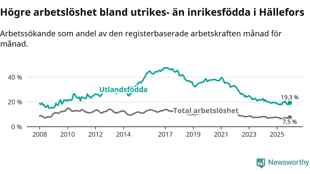 Arbetslösheten bland utlandsfödda var 19,3 procent i Hällefors under december månad, motsvarande 88 av 456 personer. Det är 0,1 procentenheter färre än vid samma tidpunkt i fjol (−10 om man räknar personer).