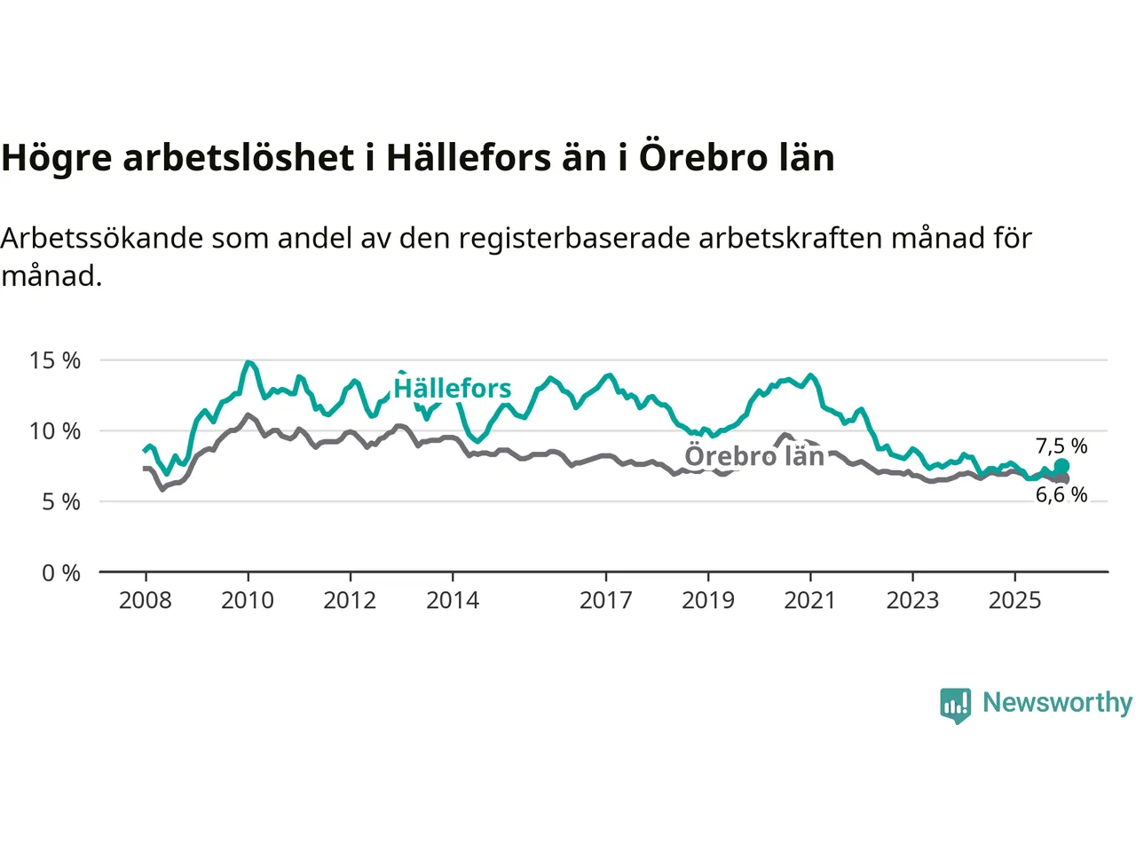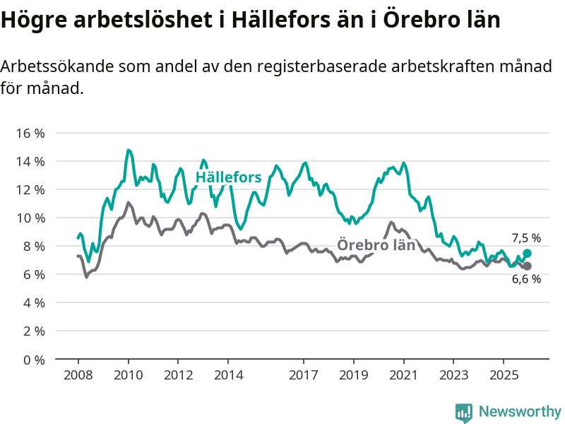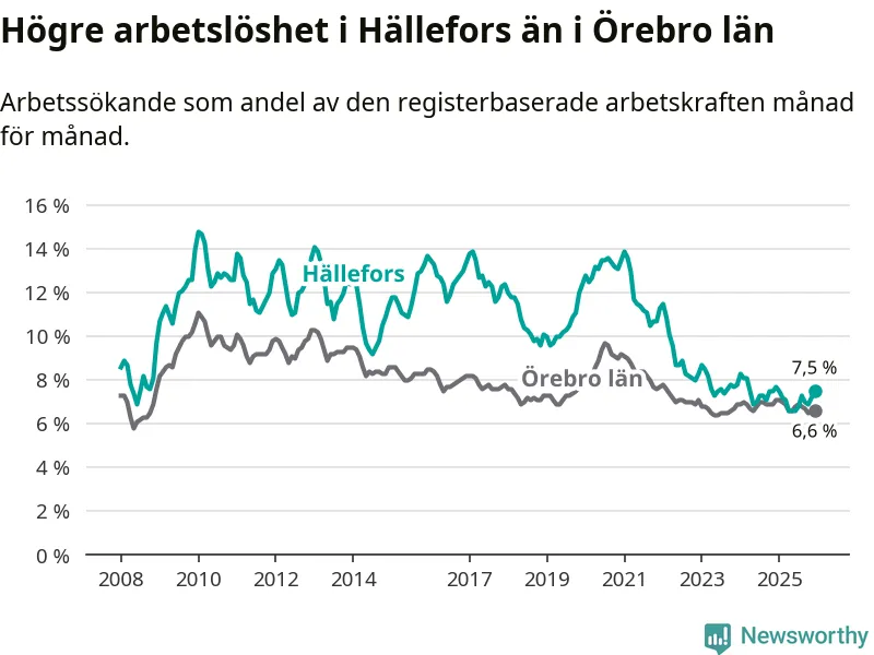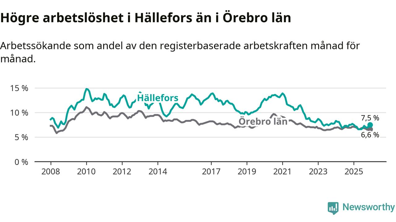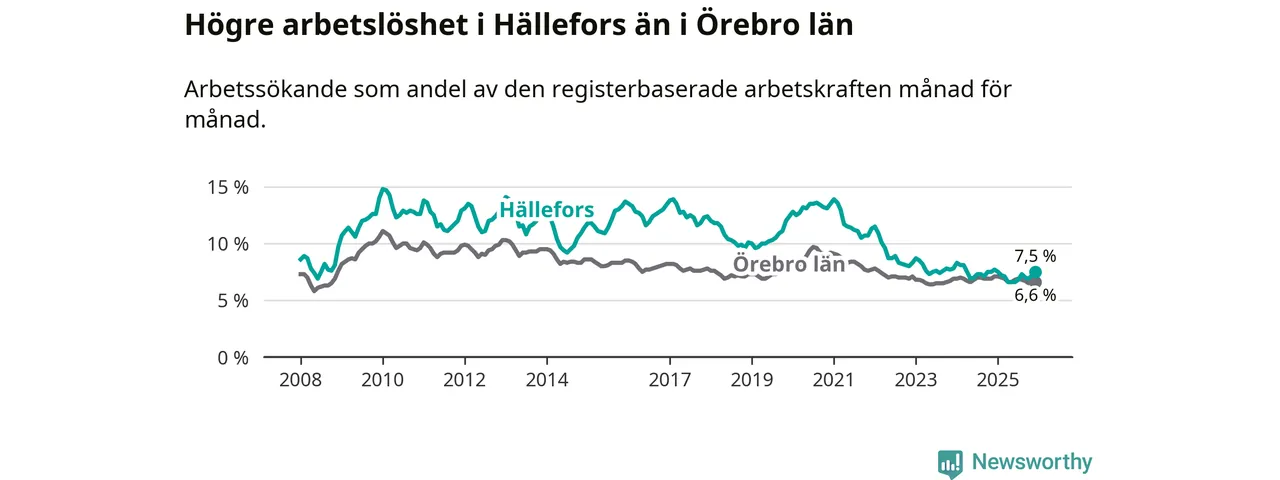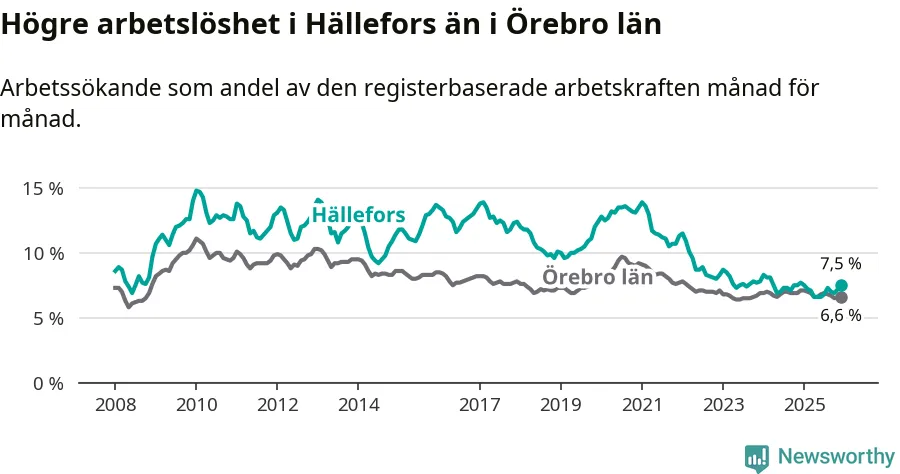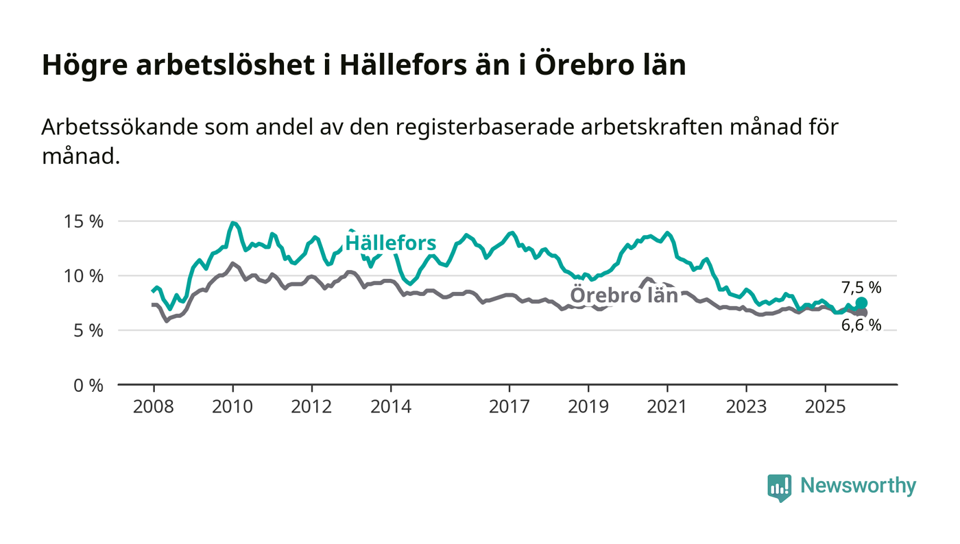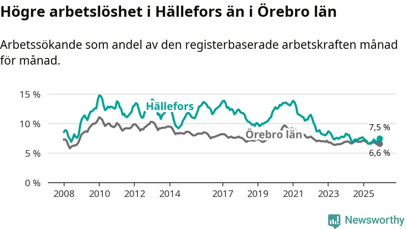Även om arbetslösheten i Hällefors alltså minskar, så ligger den fortfarande över snittet i hela Örebro län (7,5 procent i kommunen, jämfört med 6,6 procent i hela länet). Hällefors har därmed även den högsta arbetslöshetsnivån i länet. Askersund har den lägsta (4,0 procent). För att Hällefors skulle komma ner i samma arbetslöshetsnivå som Askersund skulle 91 personer behöva sysselsättas.