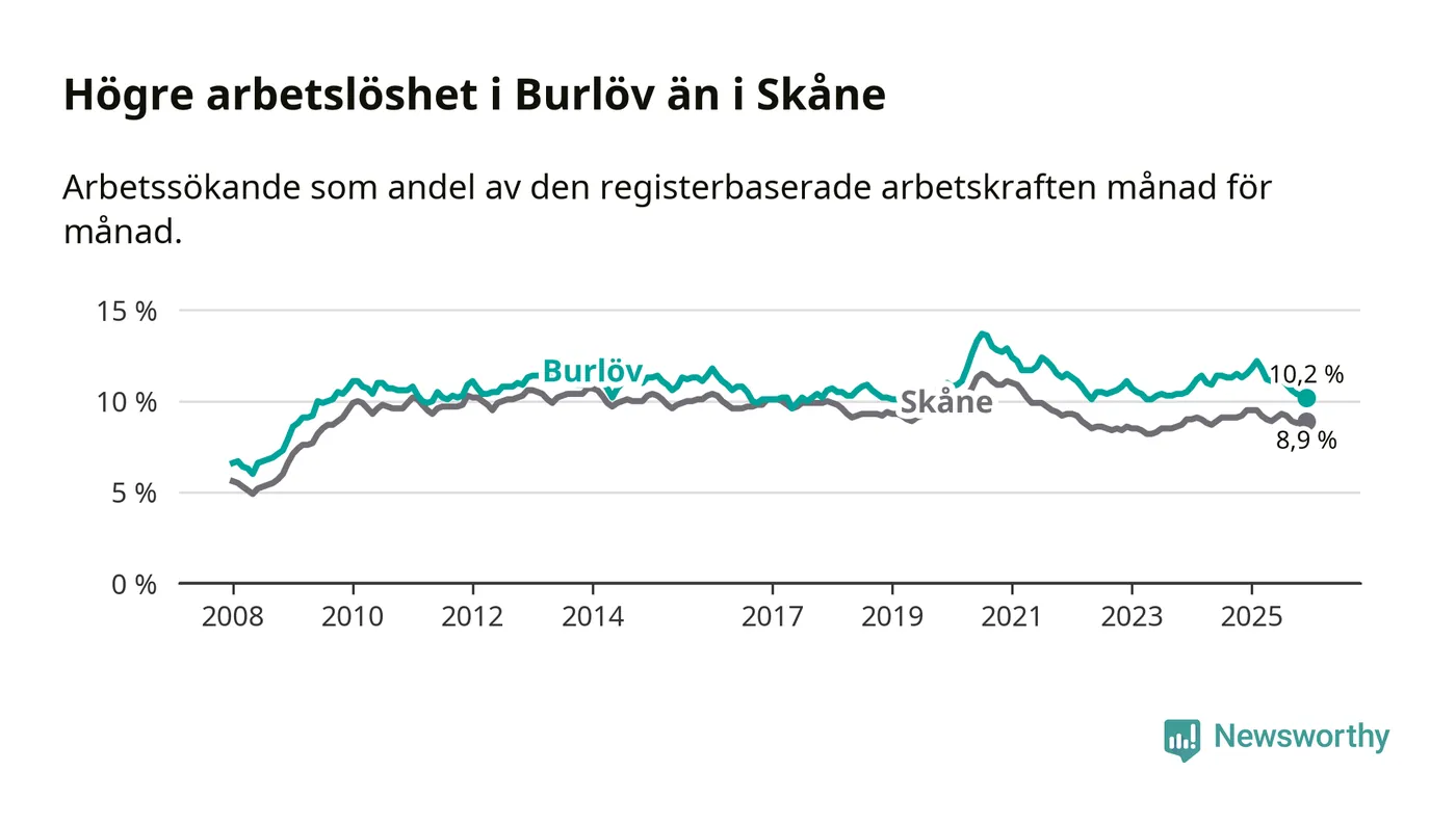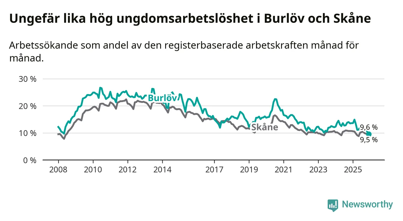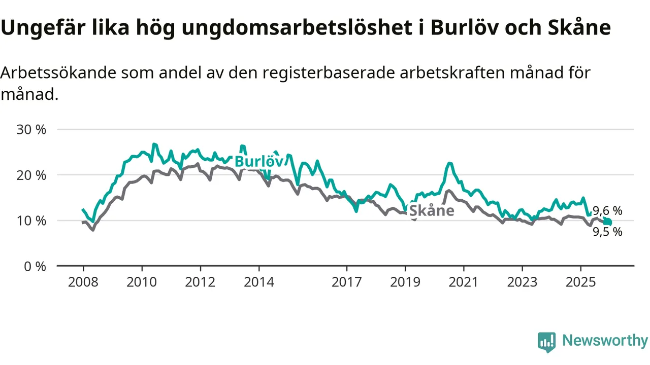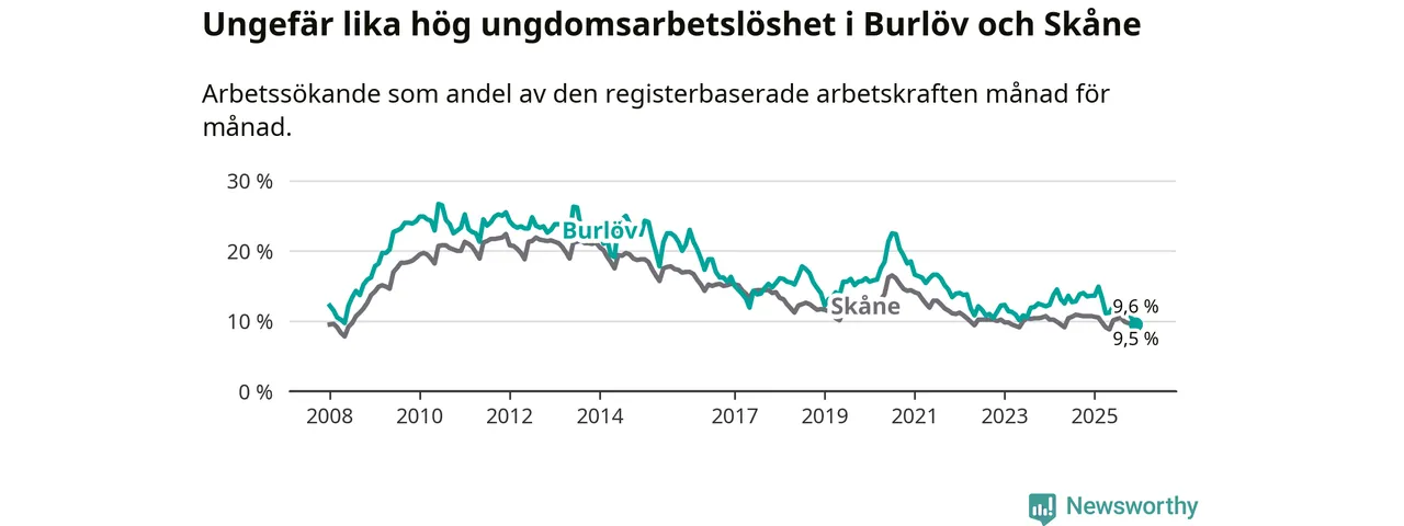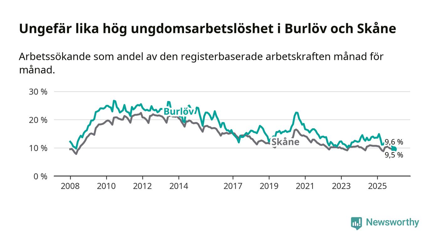 Medan Burlöv har högre total arbetslöshet än Skåne, ligger ungdomsarbetslösheten på i stort sett samma nivå.