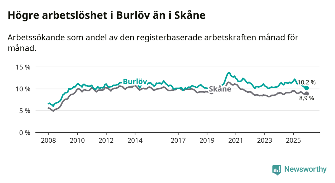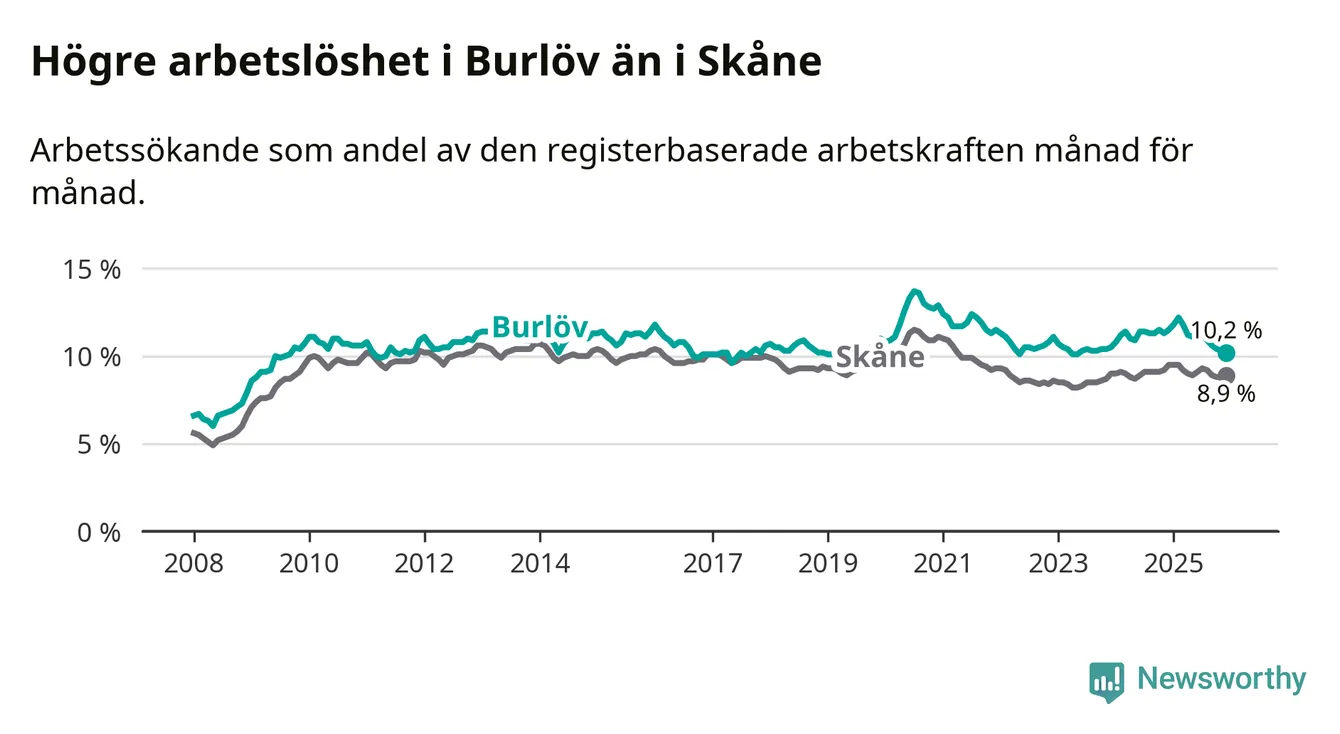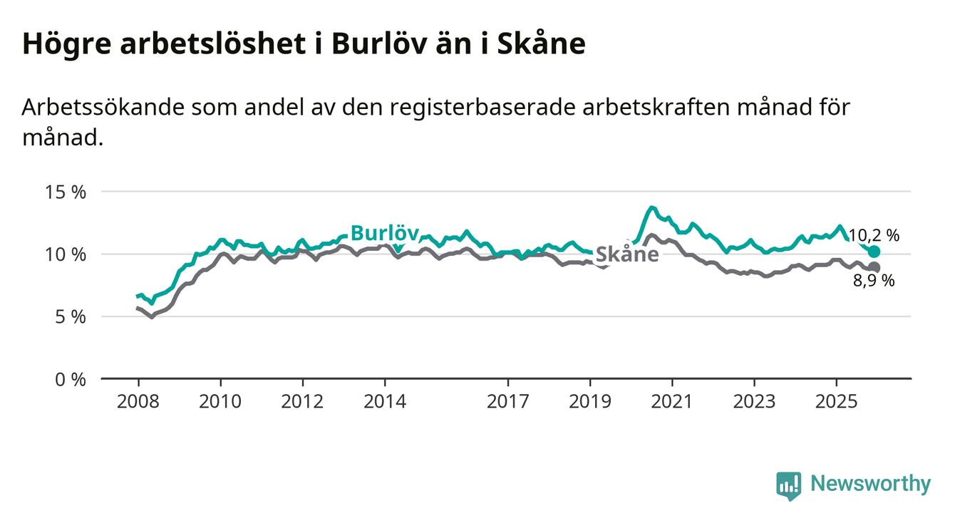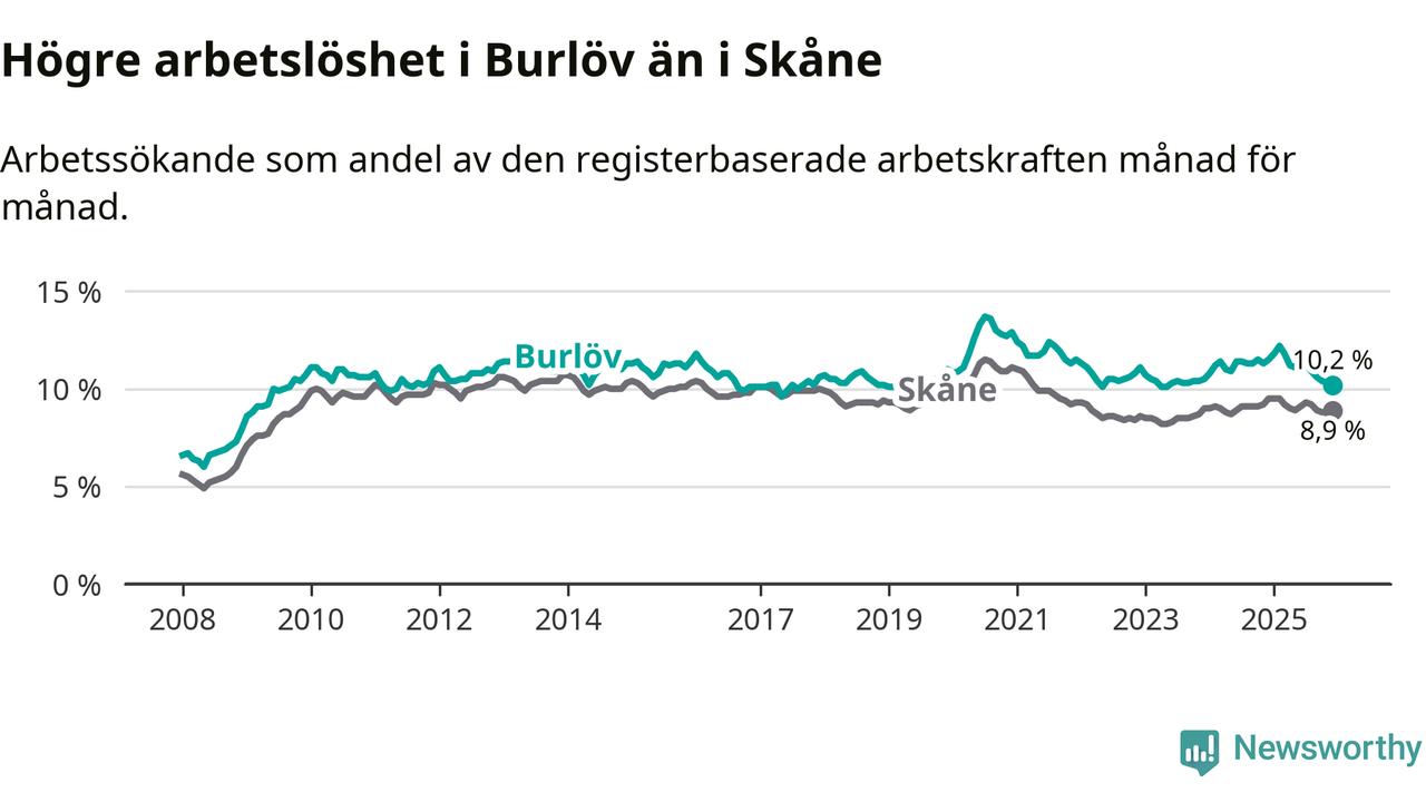 Medan Burlöv har högre total arbetslöshet än Skåne, ligger ungdomsarbetslösheten på i stort sett samma nivå.