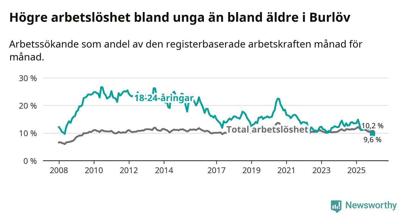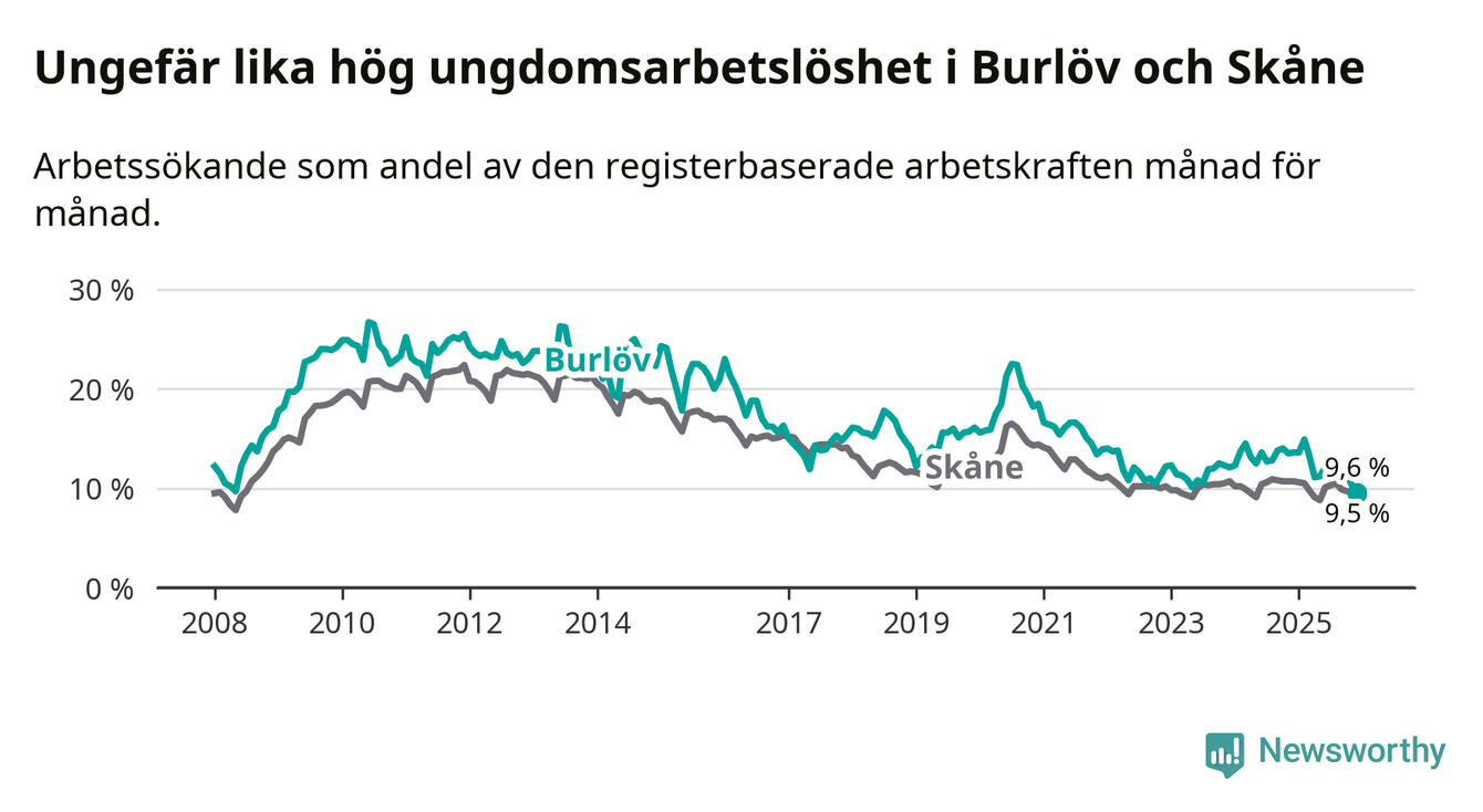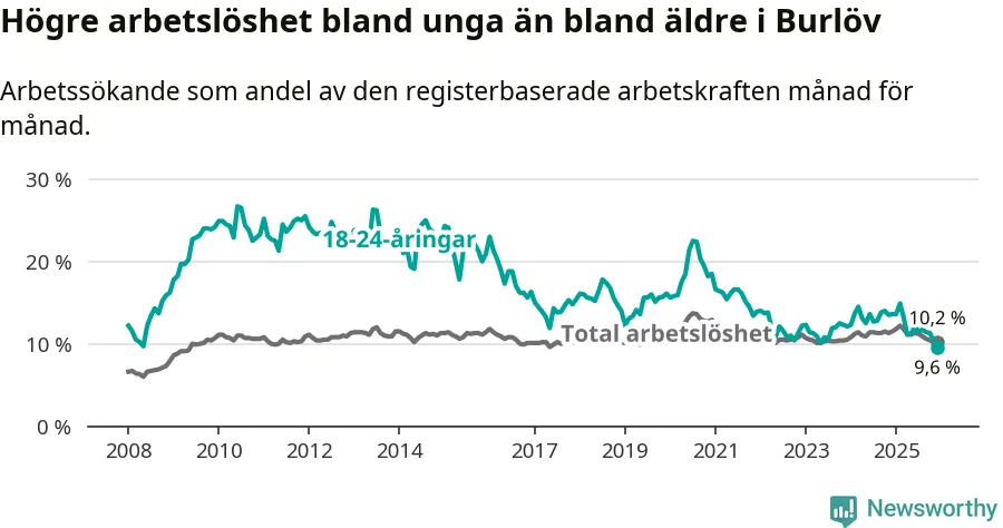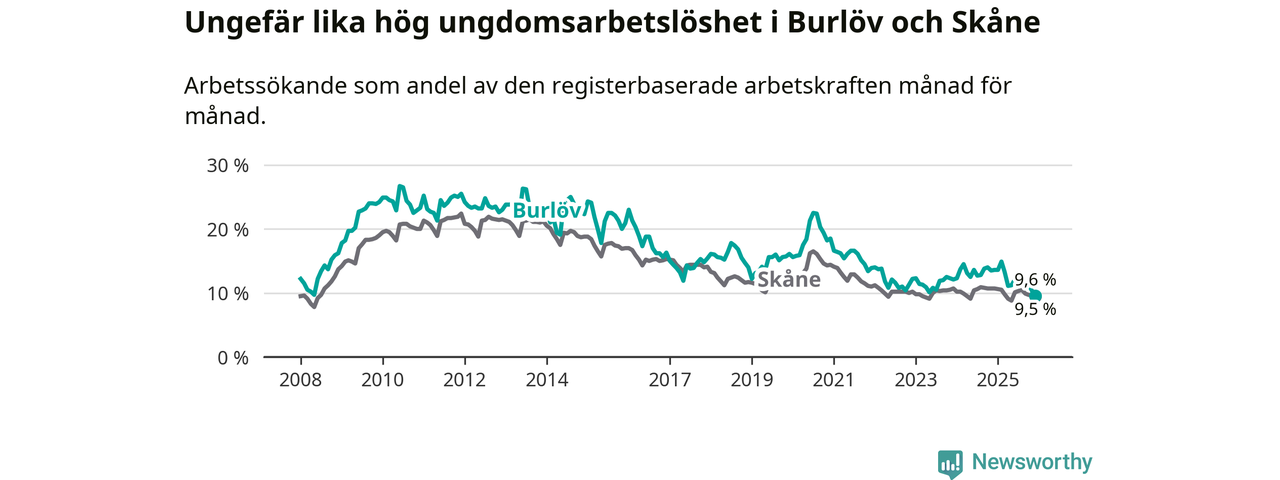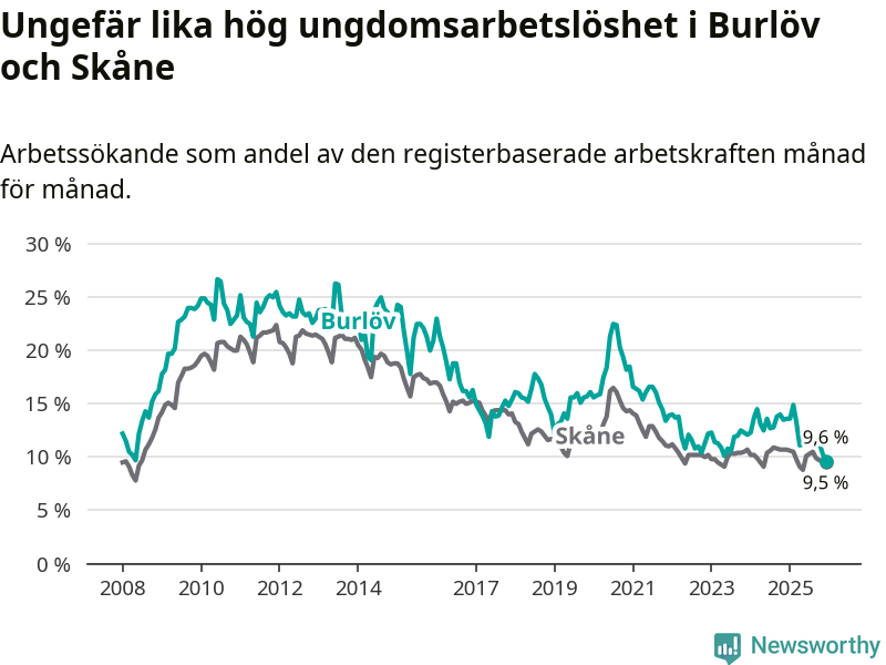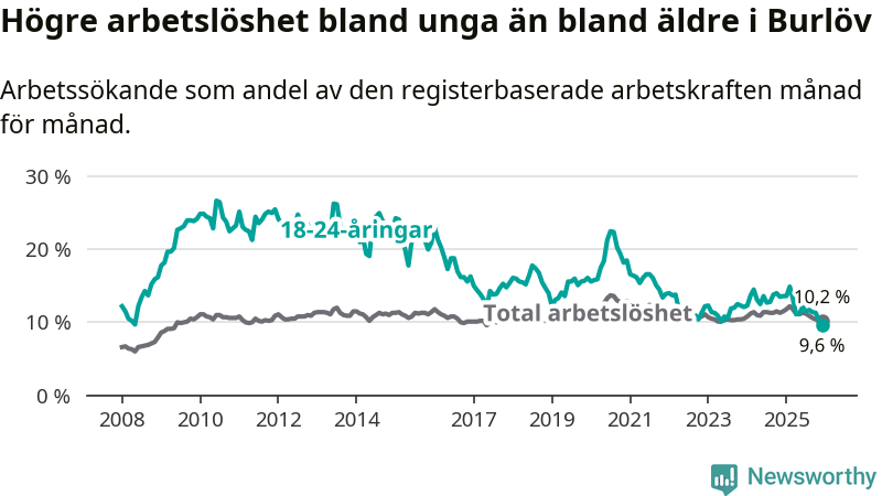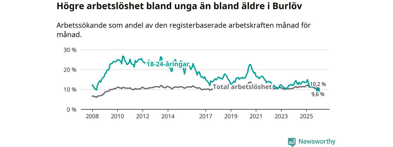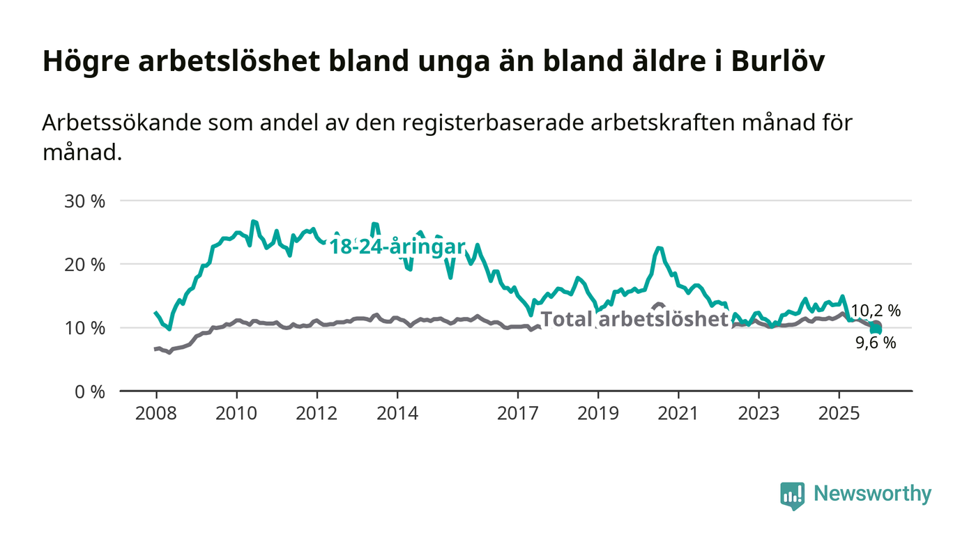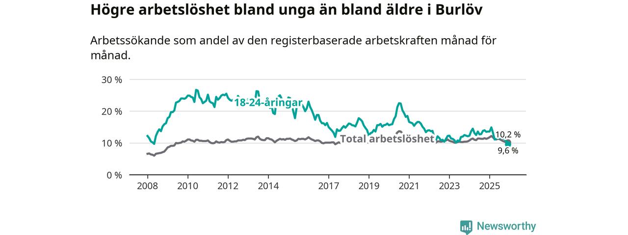 I och med den senaste månadens nedgång har de ungas arbetslöshet i Burlöv sjunkit tio månader i följd (ner från 14,9 procent i februari 2025 till 9,6 procent nu). Den nuvarande arbetslöshetsnivån är den lägsta sedan januari 2008.