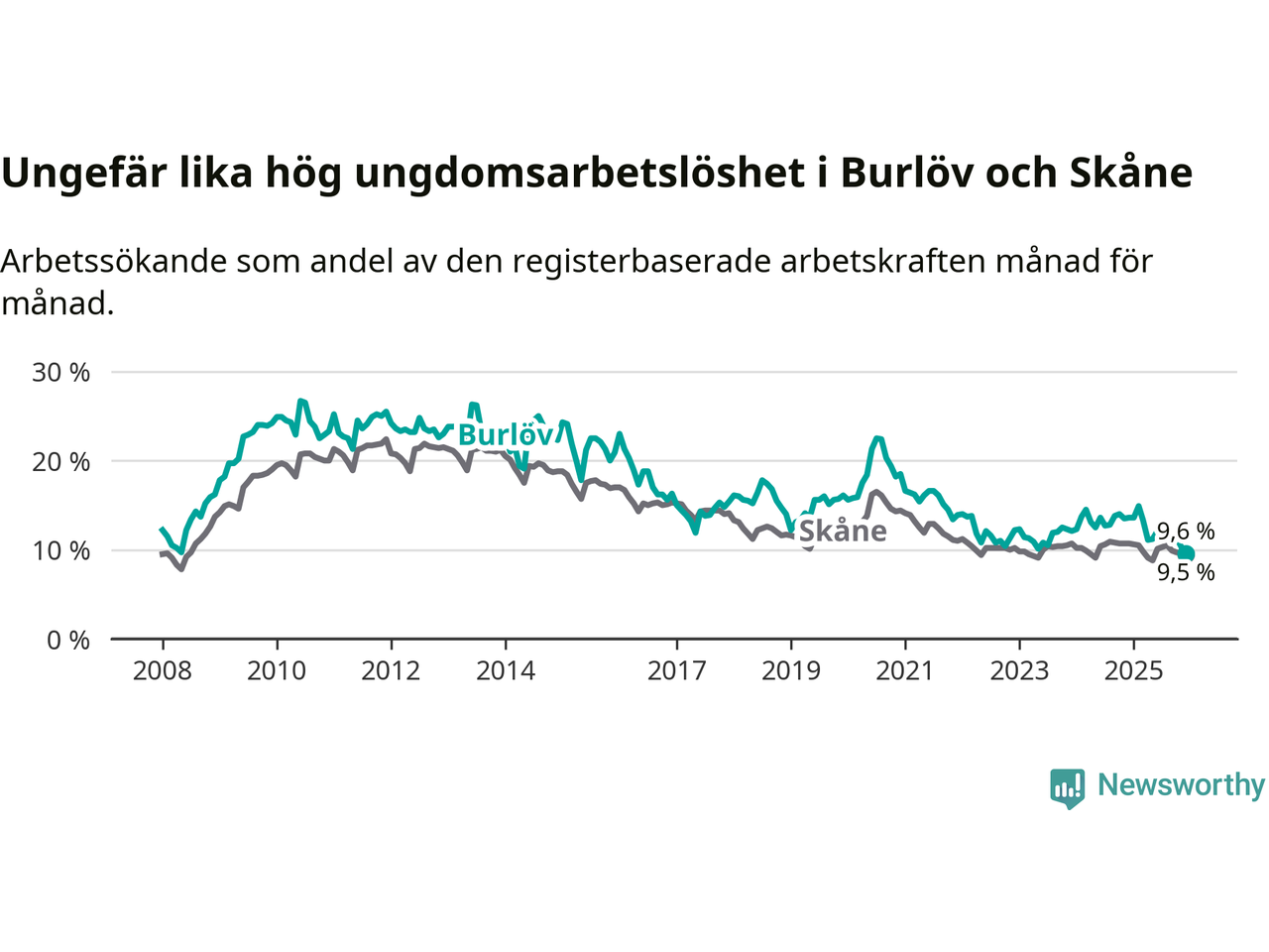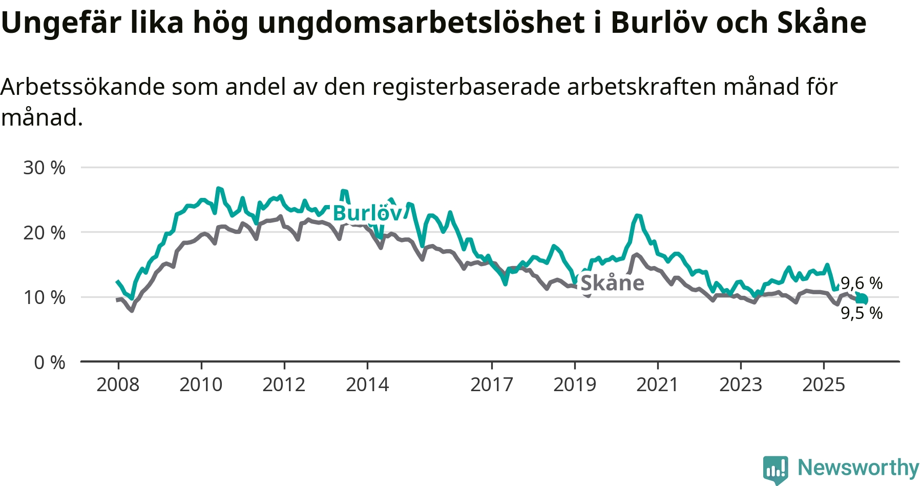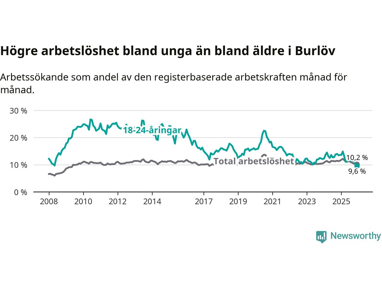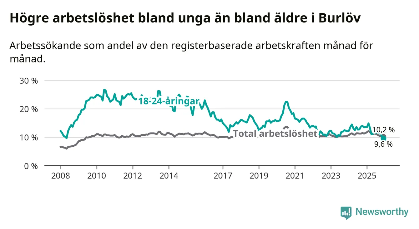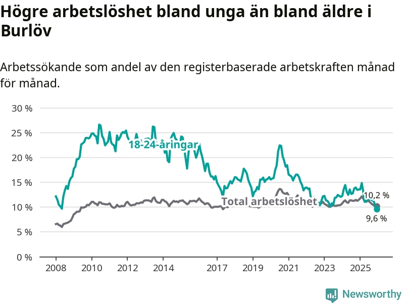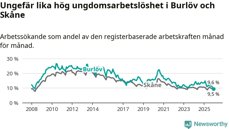 I och med den senaste månadens nedgång har de ungas arbetslöshet i Burlöv sjunkit tio månader i följd (ner från 14,9 procent i februari 2025 till 9,6 procent nu). Den nuvarande arbetslöshetsnivån är den lägsta sedan januari 2008.
