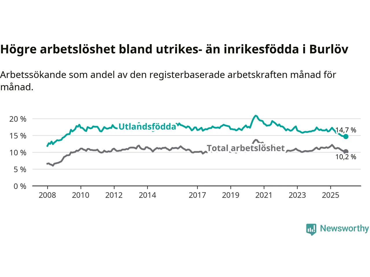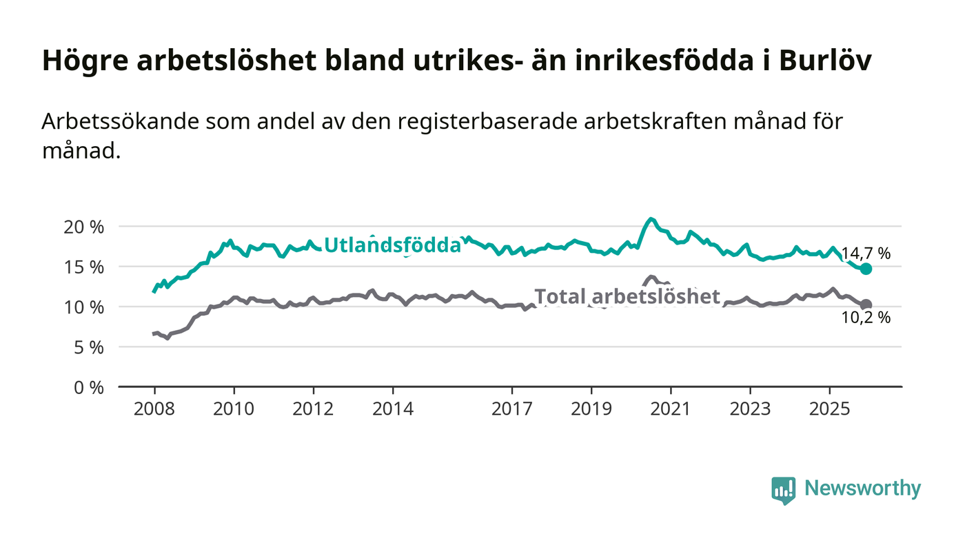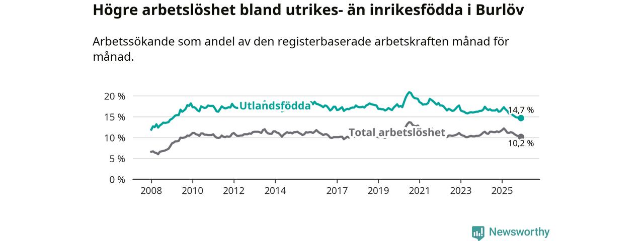 Arbetslösheten bland utlandsfödda var 14,7 procent i Burlöv under december månad, motsvarande 654 av 4 449 personer. Det är 1,6 procentenheter färre än vid samma tidpunkt i fjol (−60 om man räknar personer). Därmed är de utlandsföddas arbetslöshet lägre än vid samma tidpunkt i fjol för tionde månaden i följd. Sedan februari 2025 har arbetslösheten bland utlandsfödda minskat från 17,3 till 14,7 procent. Den nuvarande arbetslöshetsnivån är den lägsta sedan januari 2009.