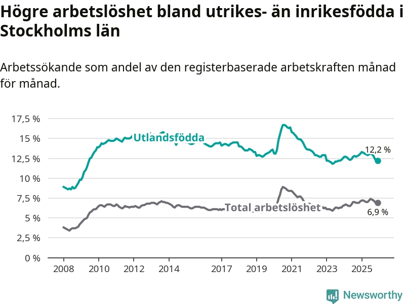 | Bland utlandsfödda | 12,2 % | −0,9 % ▼ | 14,3 % | −1,4 % ▼ |