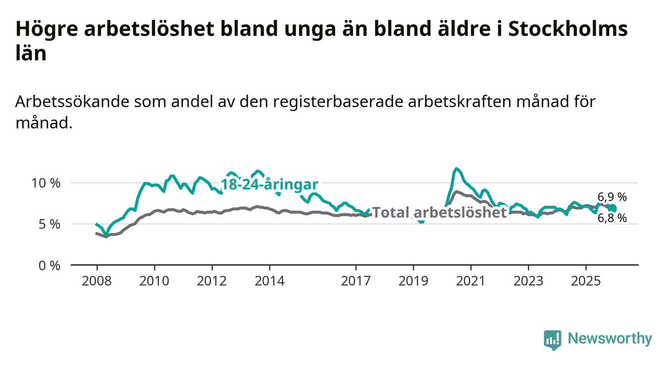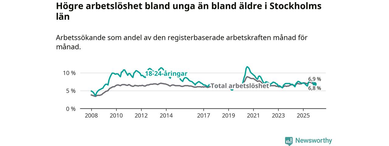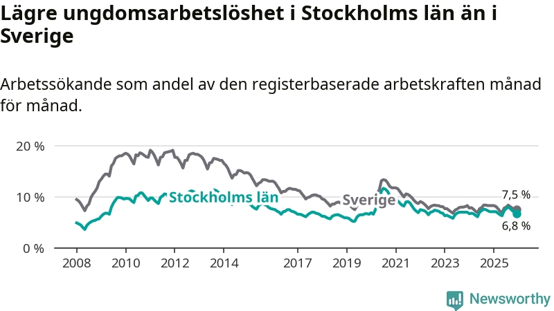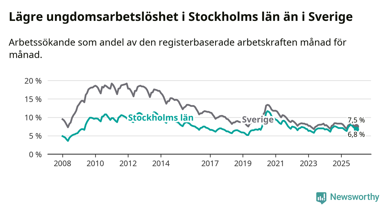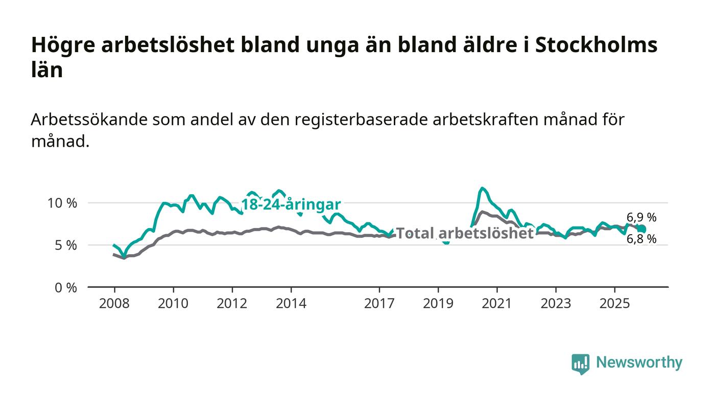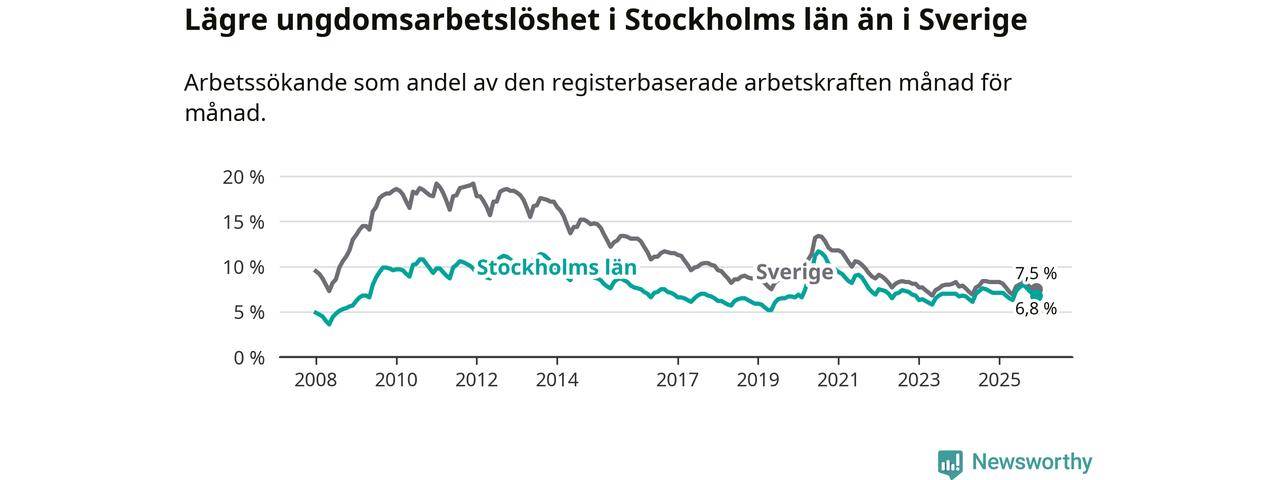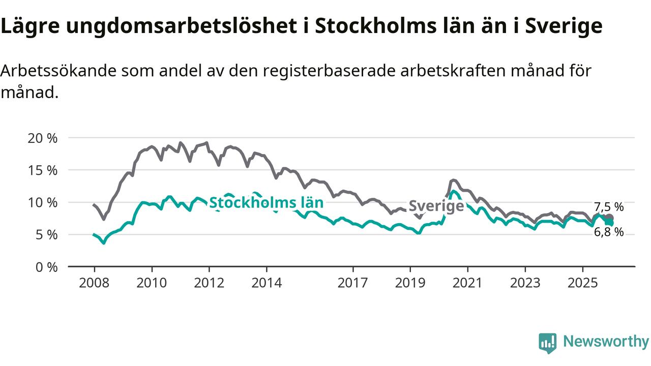 Medan Stockholms län har ungefär samma total arbetslöshet som Sverige, ligger ungdomsarbetslösheten 0,7 procentenheter lägre i Stockholm.