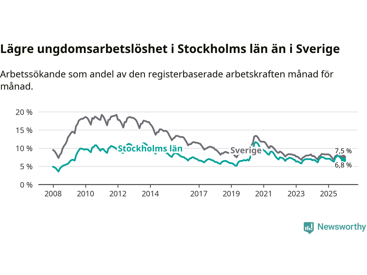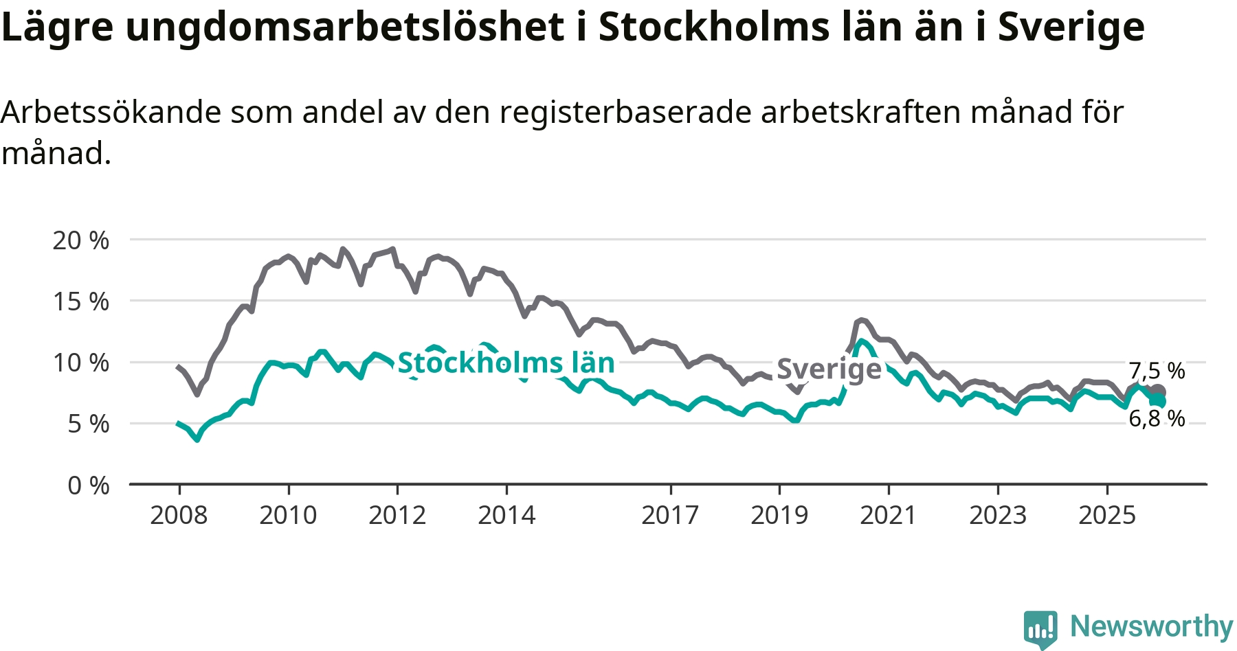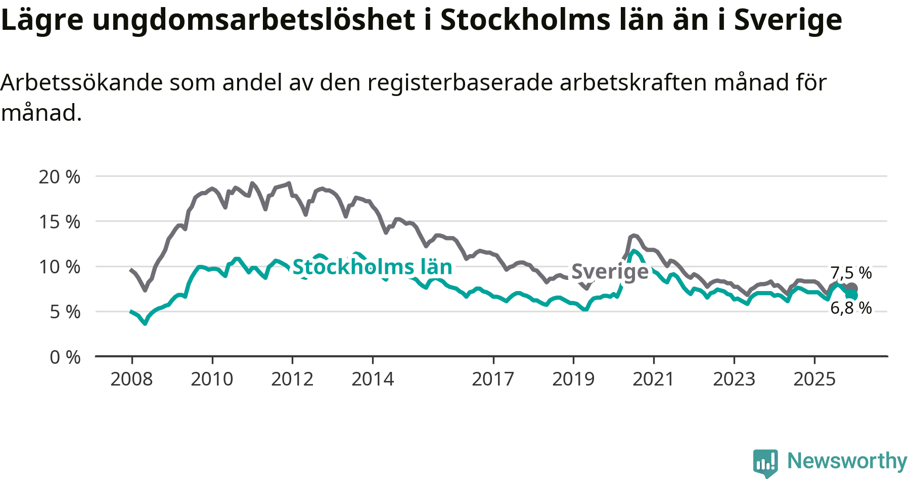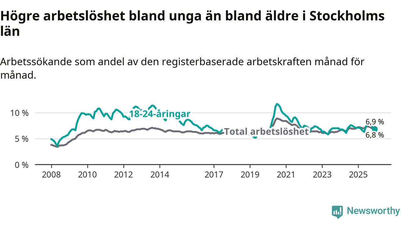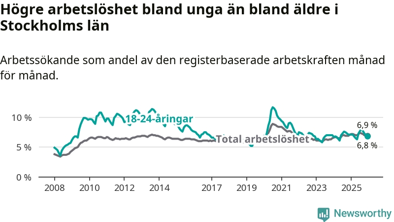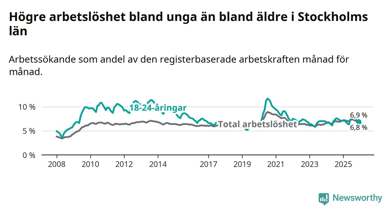 Medan Stockholms län har ungefär samma total arbetslöshet som Sverige, ligger ungdomsarbetslösheten 0,7 procentenheter lägre i Stockholm.