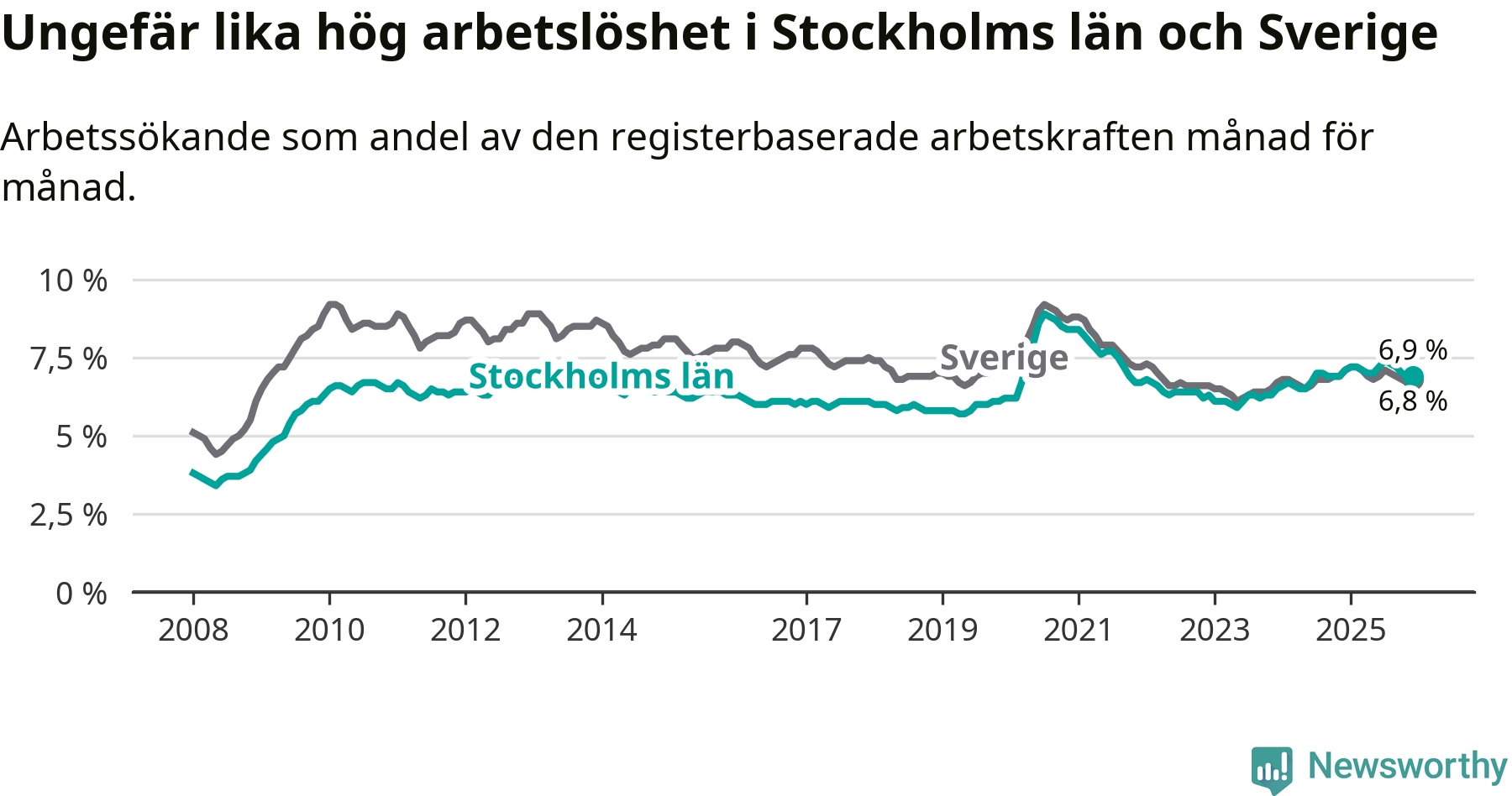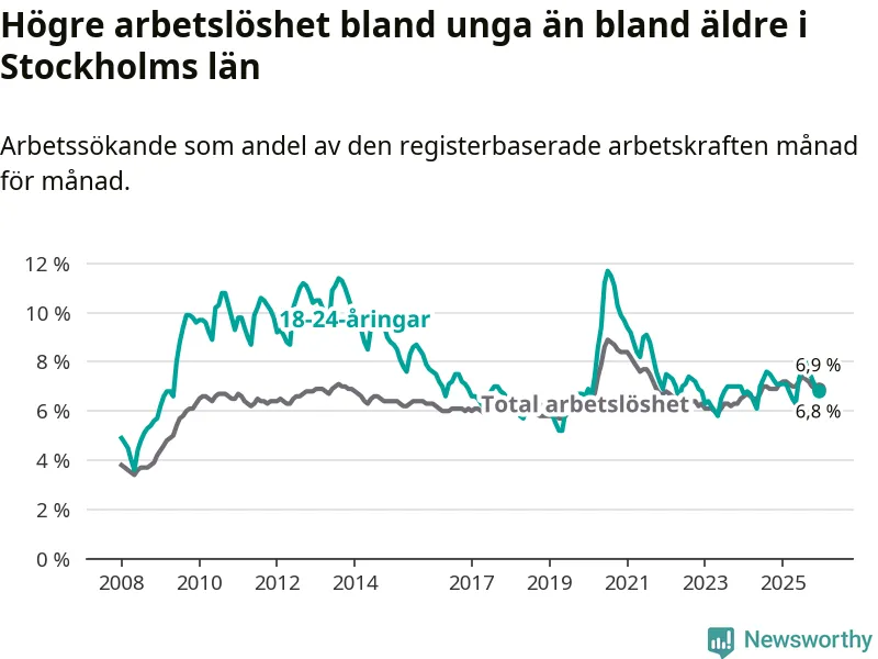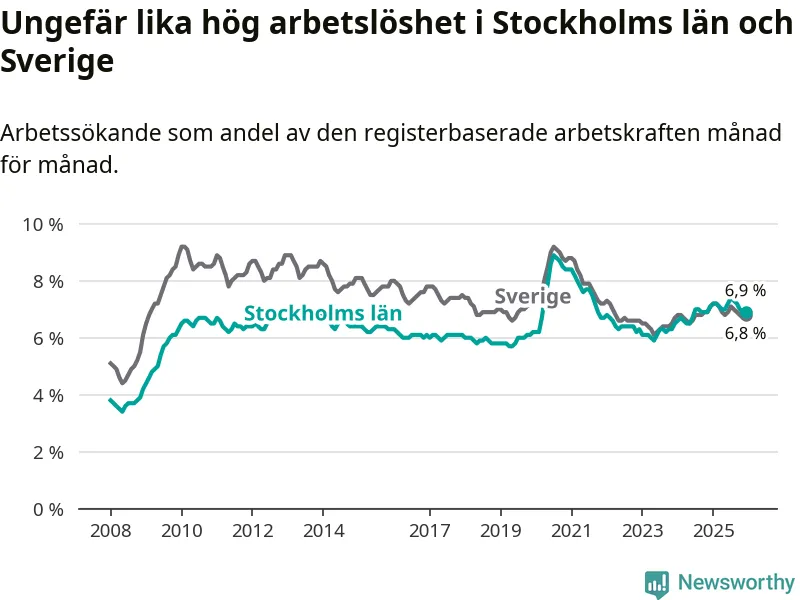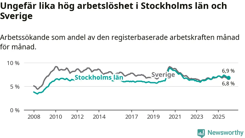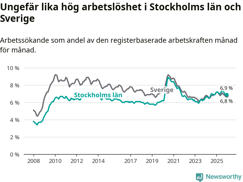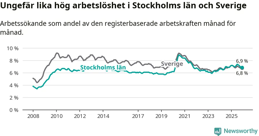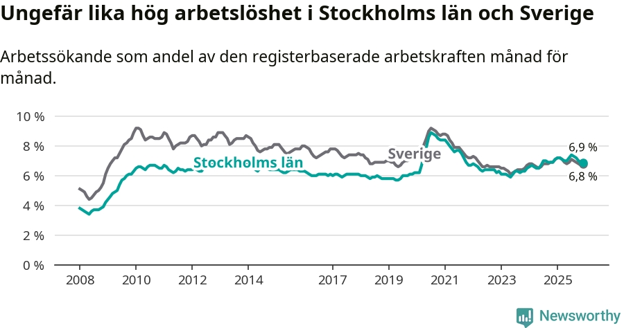 | Hela arbetskraften | 6,9 % | −0,2 % ▼ | 6,8 % | −0,3 % ▼ |