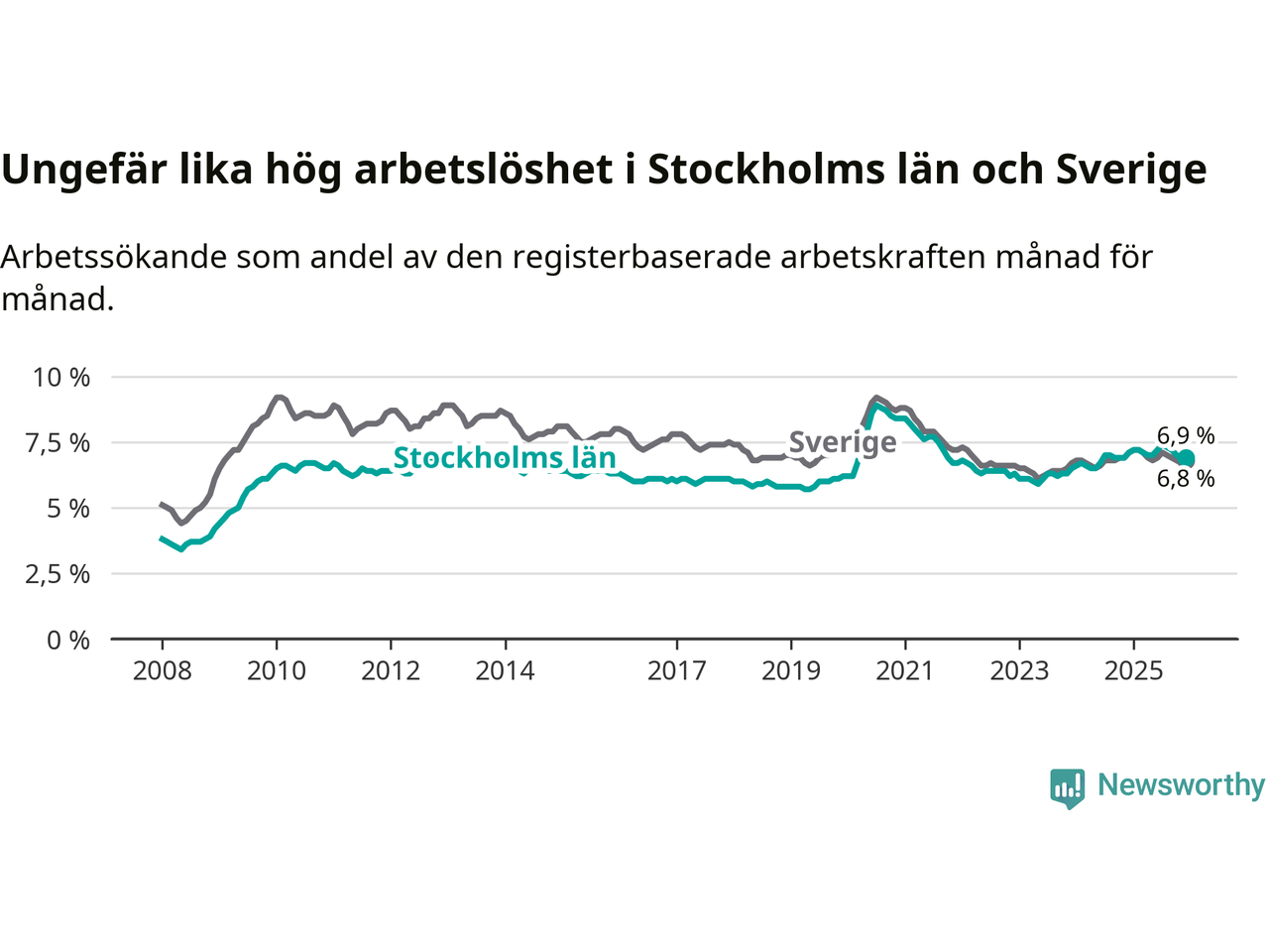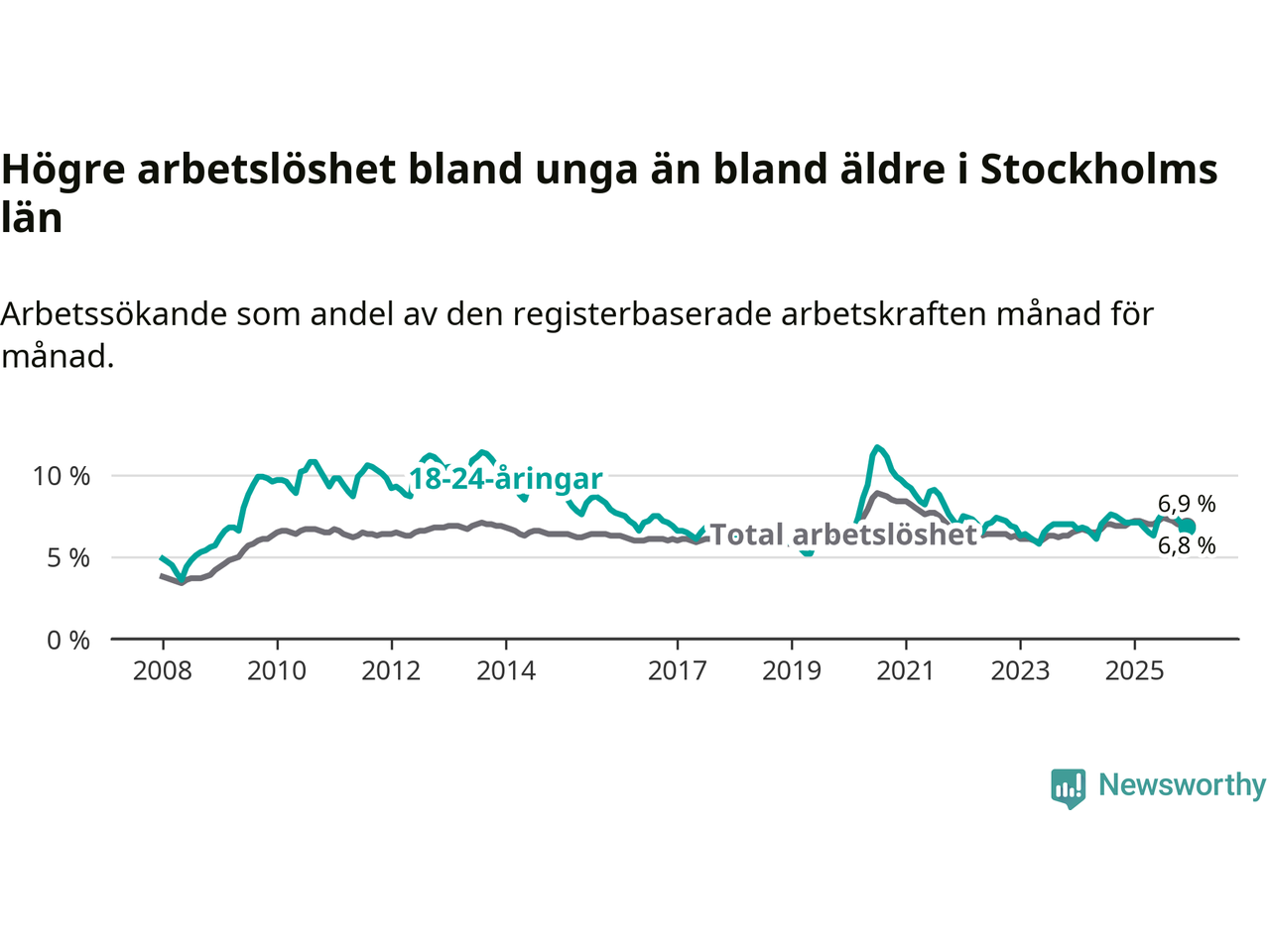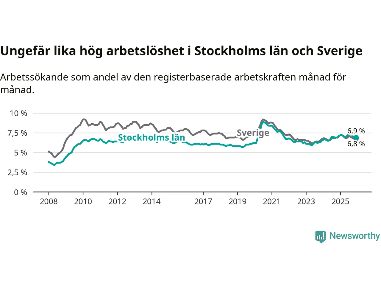| Hela arbetskraften | 6,9 % | −0,2 % ▼ | 6,8 % | −0,3 % ▼ |