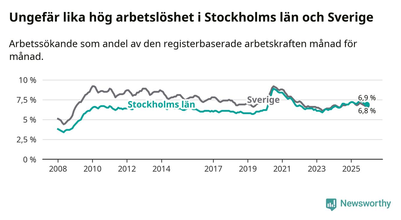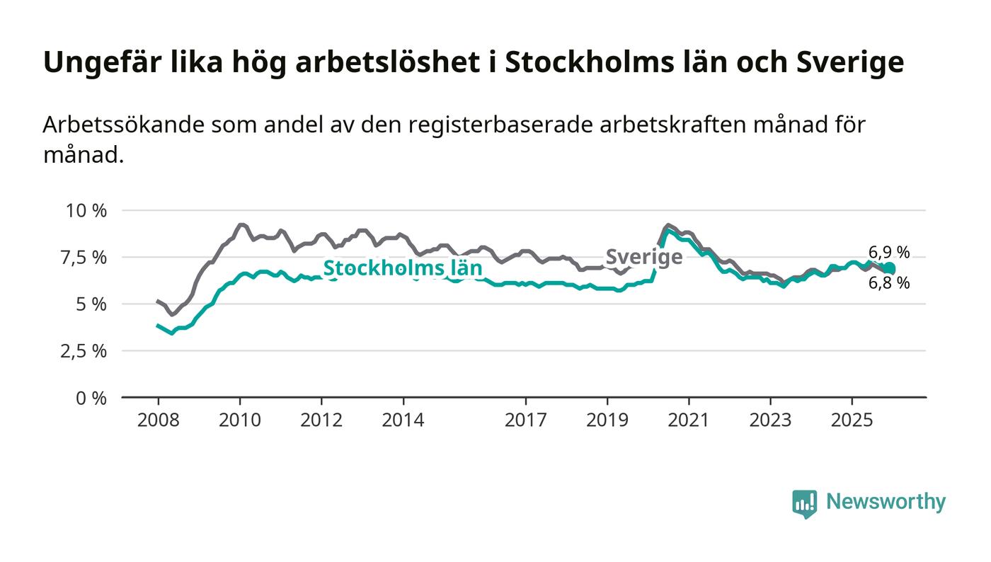 Den minskande arbetslösheten gör att Stockholms län nu har i stort sett samma arbetslöshetsnivå som hela Sverige. Norrbotten har den lägsta arbetslösheten i riket (3,8 procent), medan Skåne har den högsta (8,9 procent). För att Stockholms län skulle komma ner i samma arbetslöshetsnivå som Norrbotten skulle 40 432 personer behöva sysselsättas.