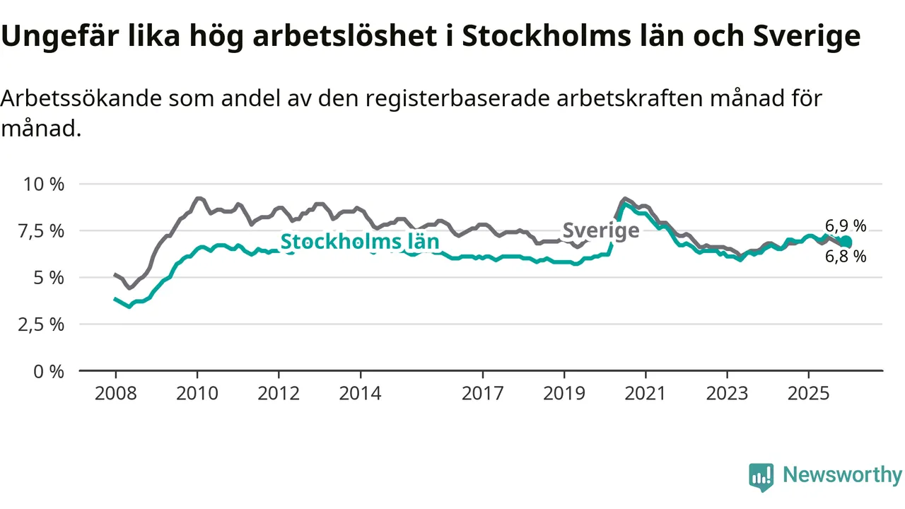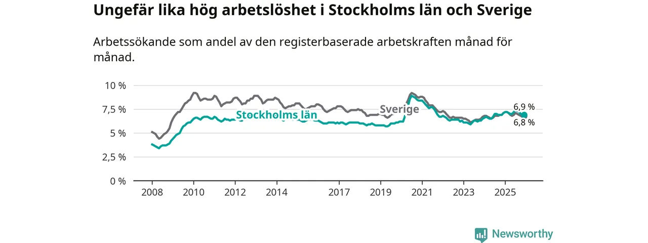 Under december månad rapporterade Stockholms län en total arbetslöshet på 6,9 procent. Det är en minskning jämfört med samma tidpunkt i fjol (−0,2 procentenheter). Även i Sverige sjunker arbetslösheten .