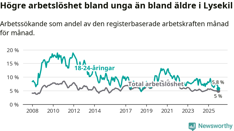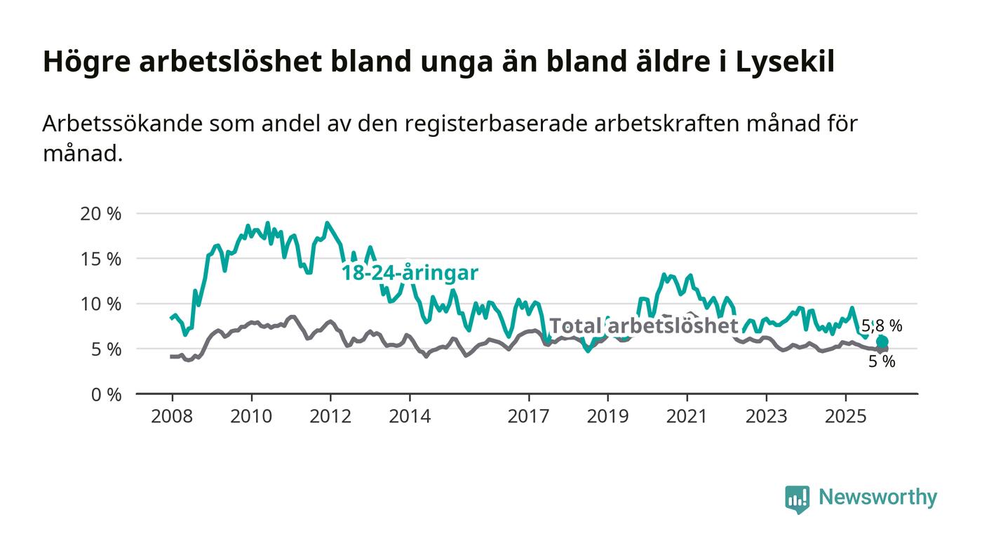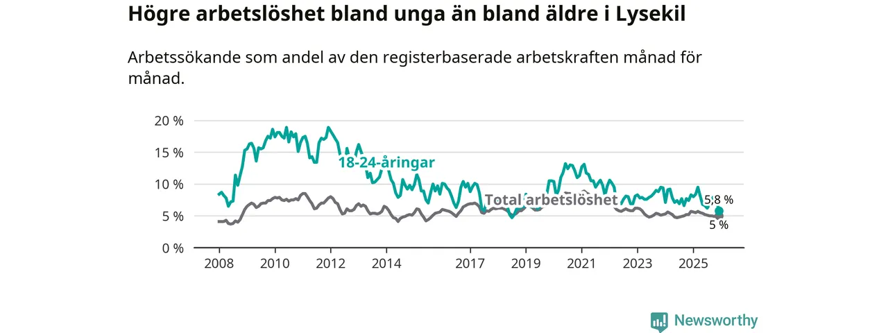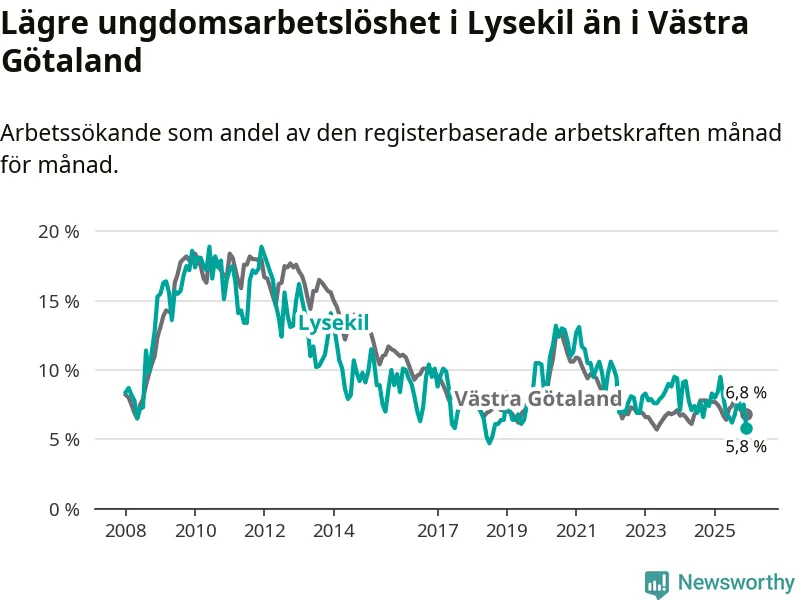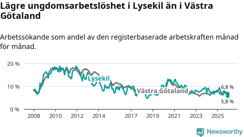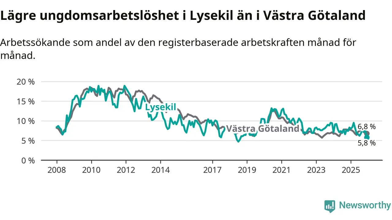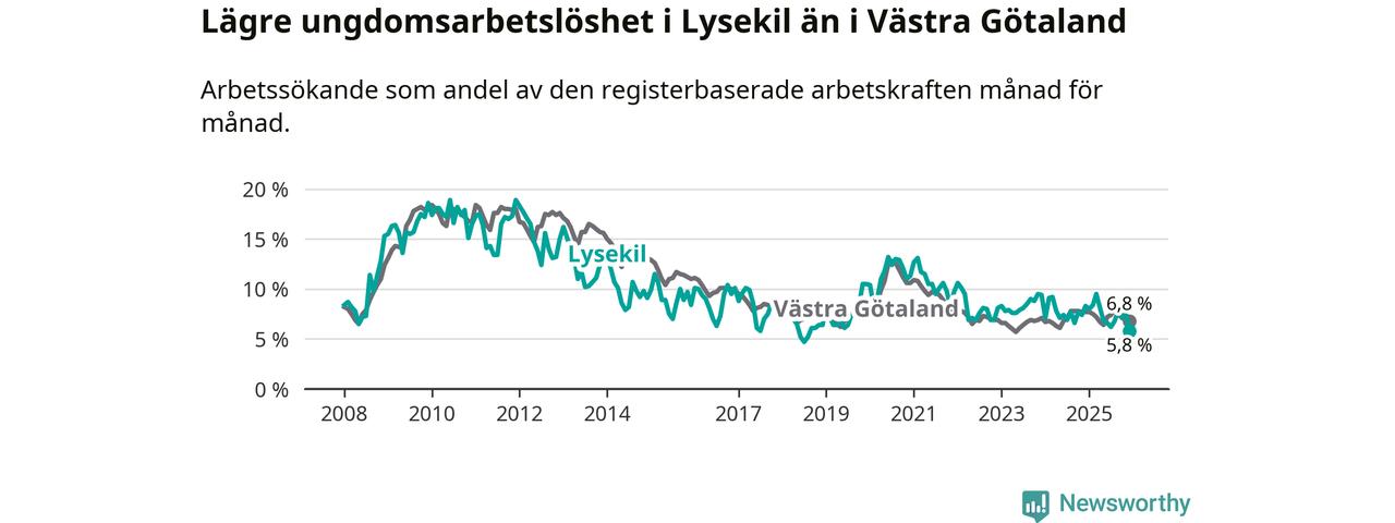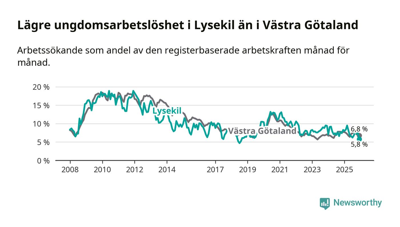 Precis som den totala arbetslösheten ligger ungdomsarbetslösheten i Lysekil lägre än i Västra Götaland som helhet. Skillnaden mellan kommunen och länet är 1,0 procentenheter.