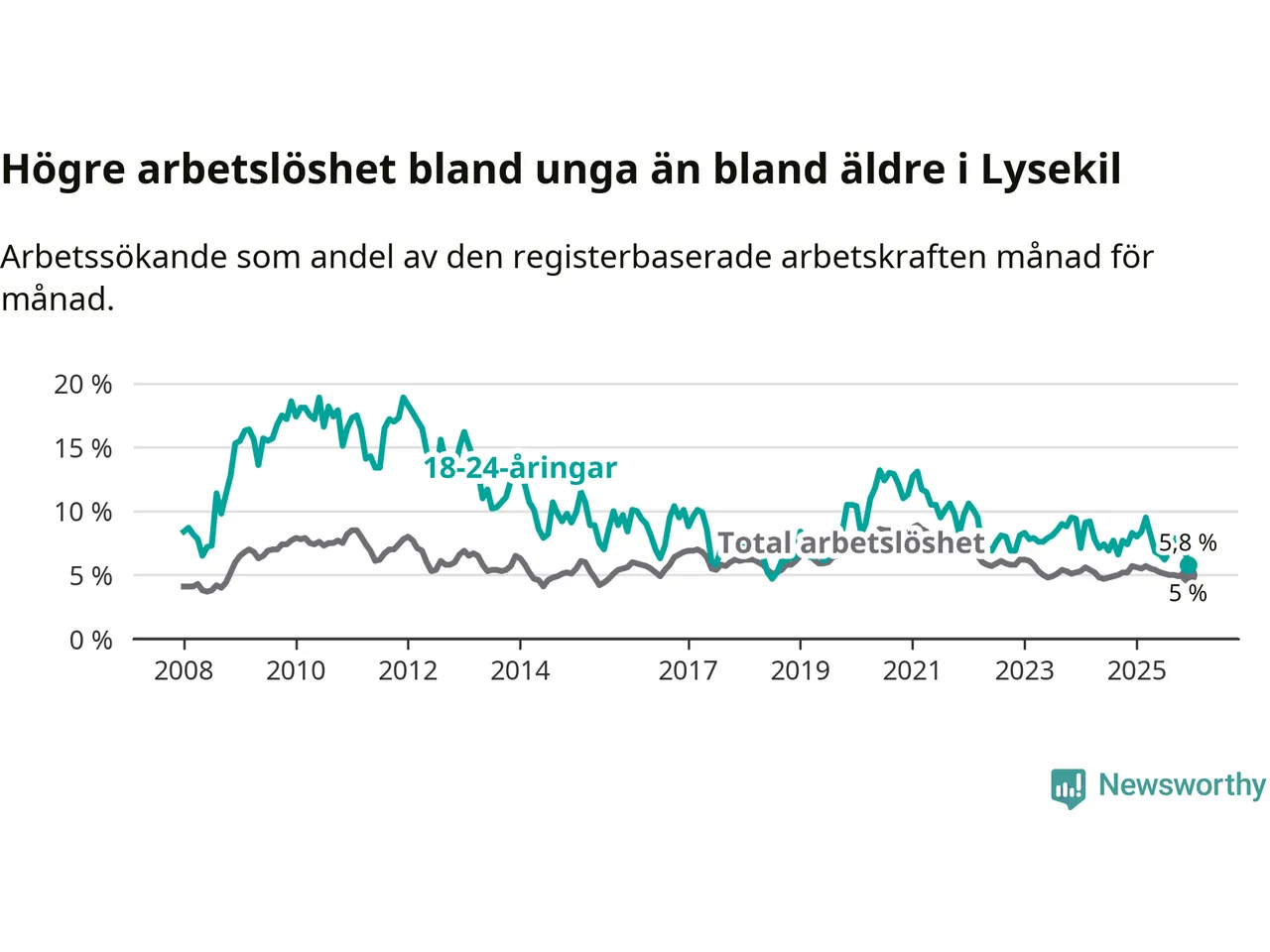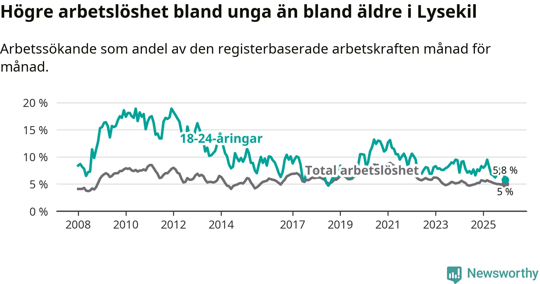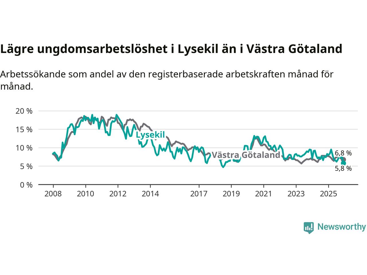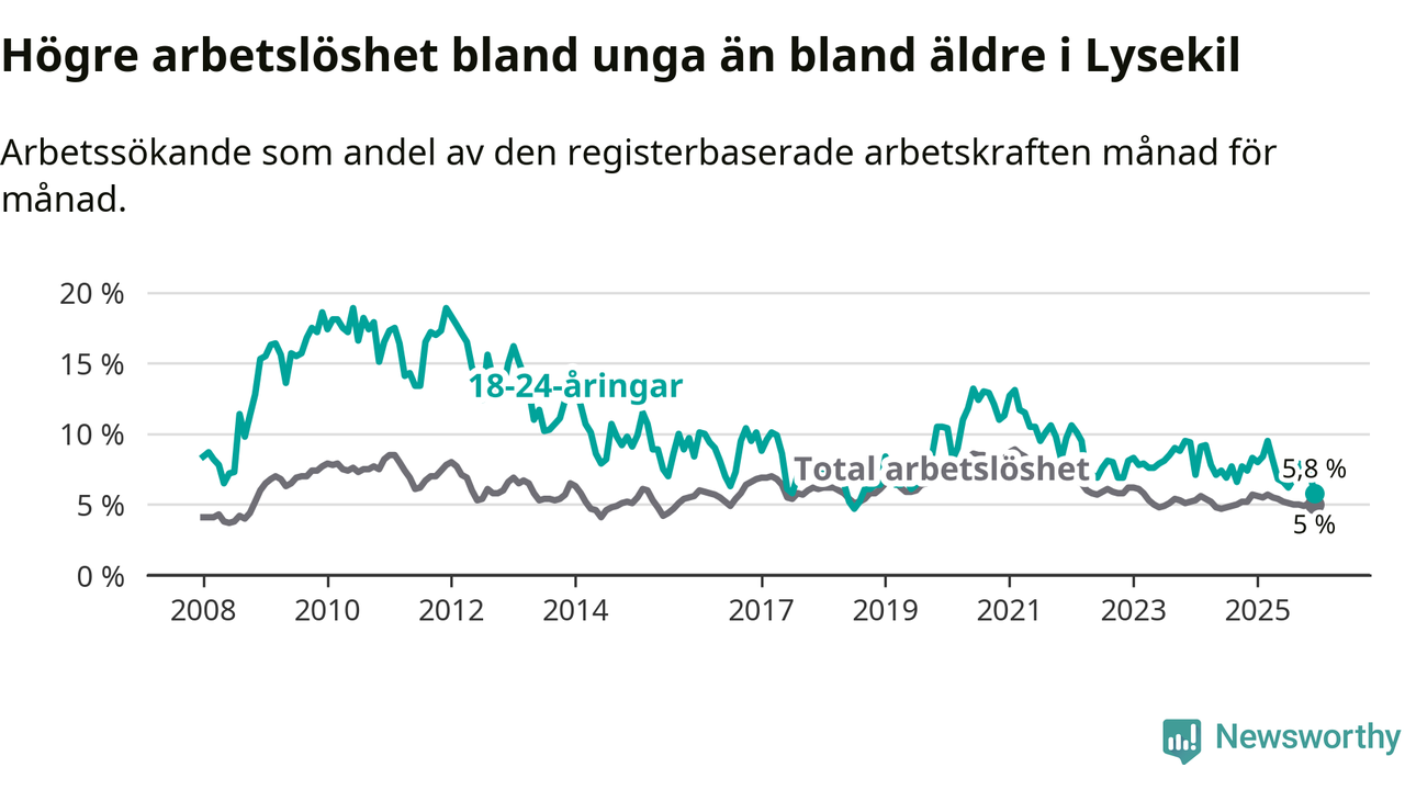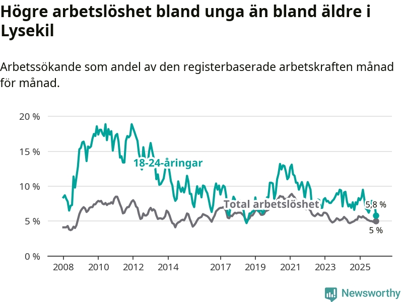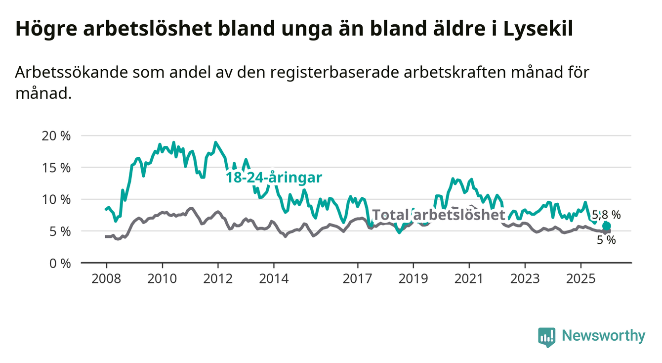 Precis som den totala arbetslösheten ligger ungdomsarbetslösheten i Lysekil lägre än i Västra Götaland som helhet. Skillnaden mellan kommunen och länet är 1,0 procentenheter.