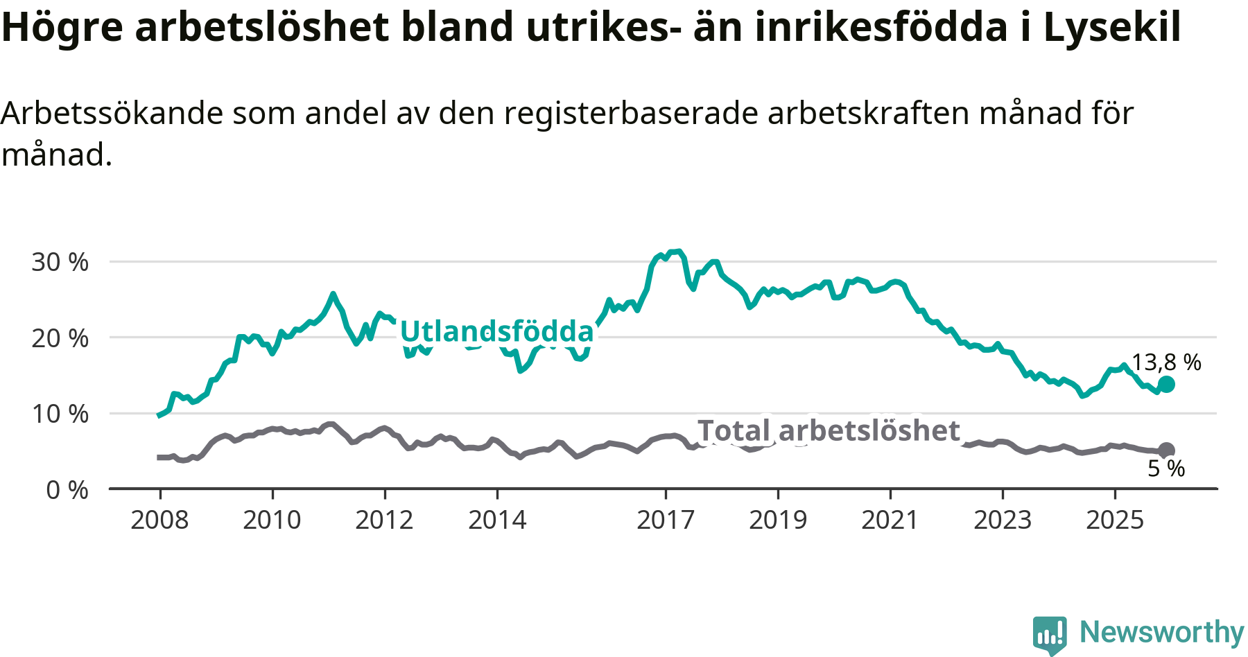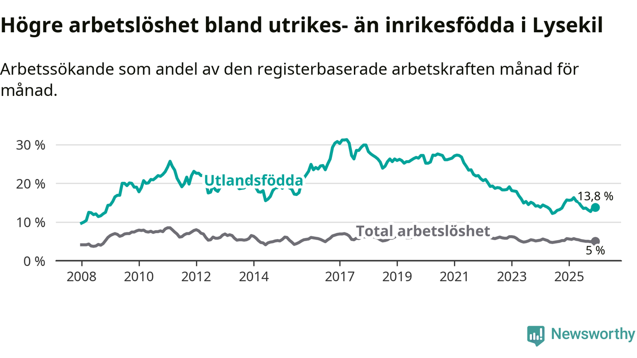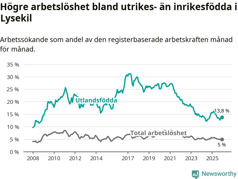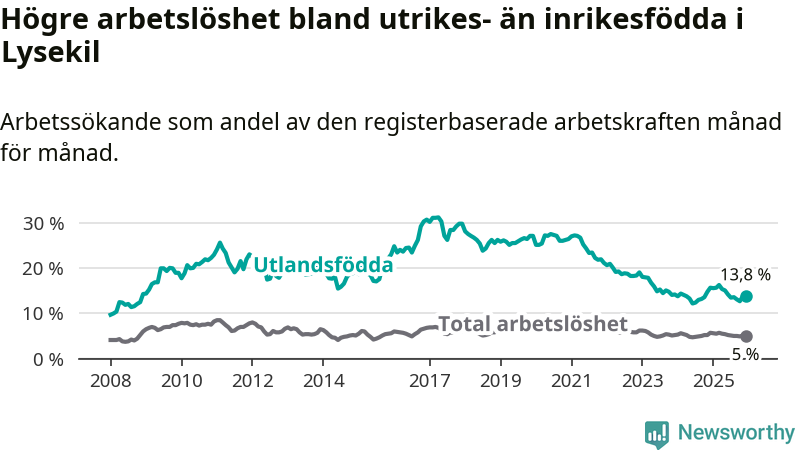 Arbetslösheten bland utlandsfödda var 13,8 procent i Lysekil under december månad, motsvarande 147 av 1 065 personer. Det är 1,9 procentenheter färre än vid samma tidpunkt i fjol (−16 om man räknar personer).