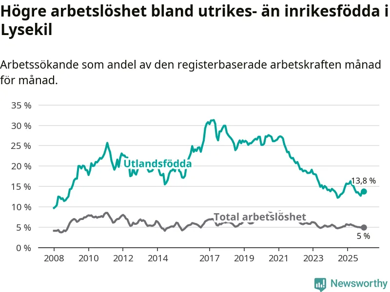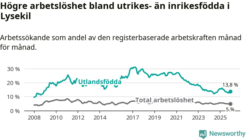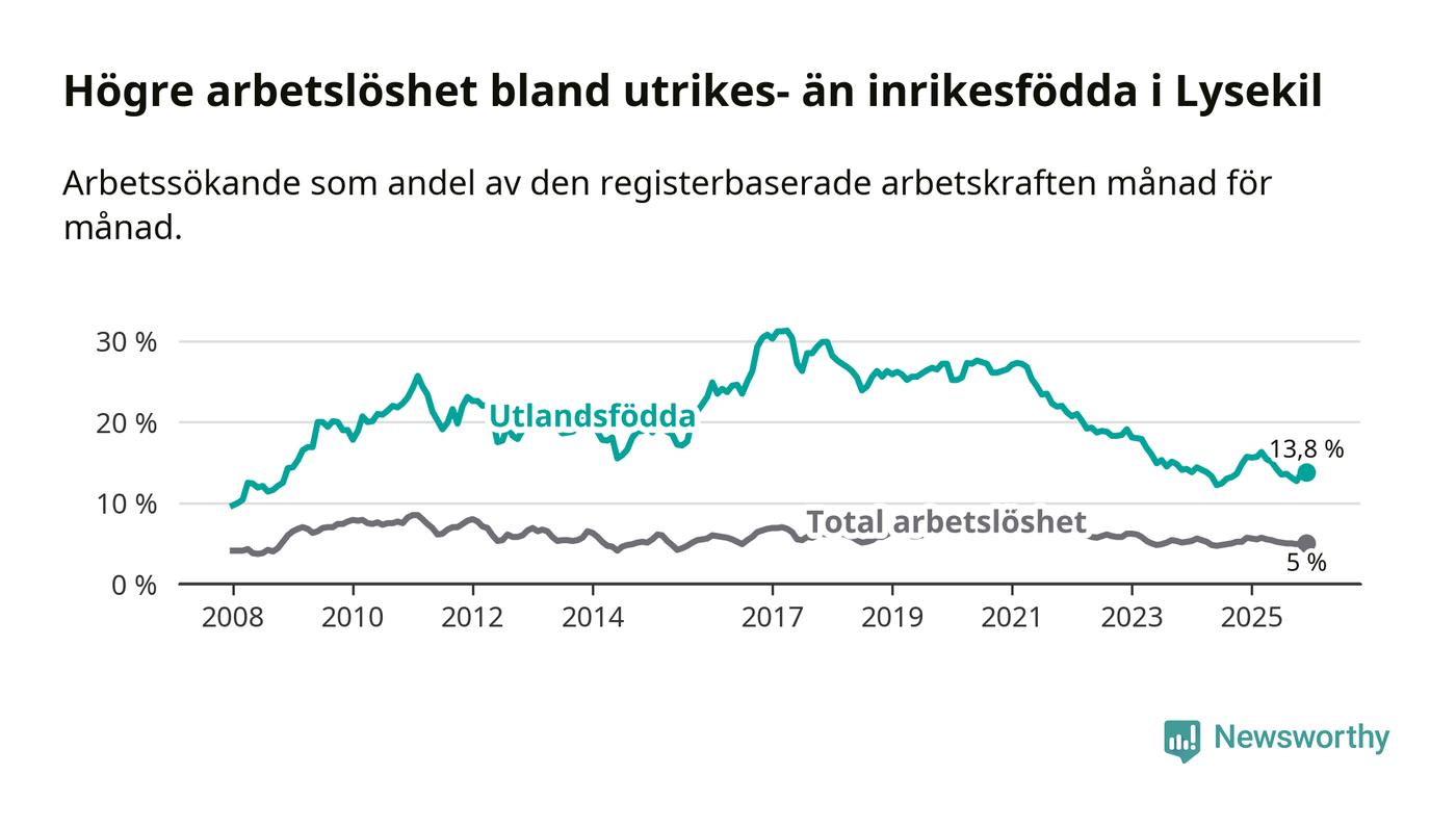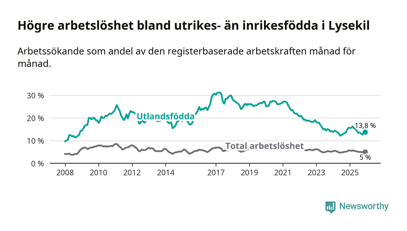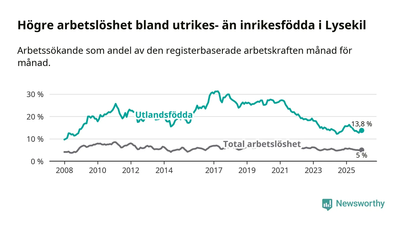 Skillnaden i arbetslöshet mellan utrikesfödda och hela befolkningen är 8,8 procentenheter i Lysekil. Det är en mindre skillnad än för ett år sedan (−1,2 procentenheter).