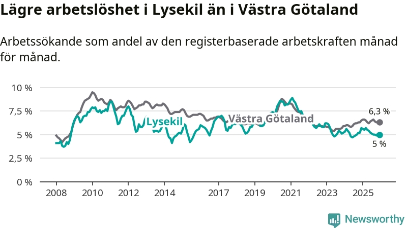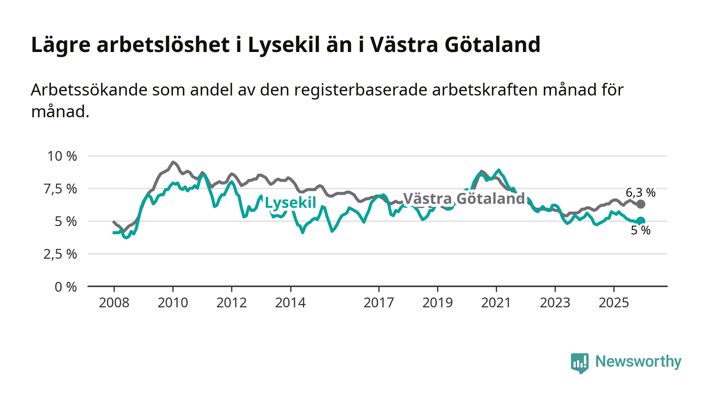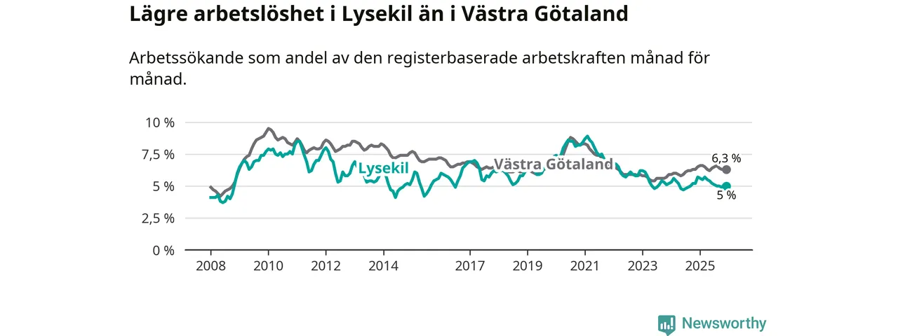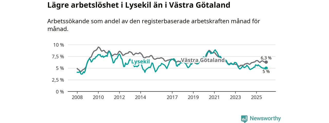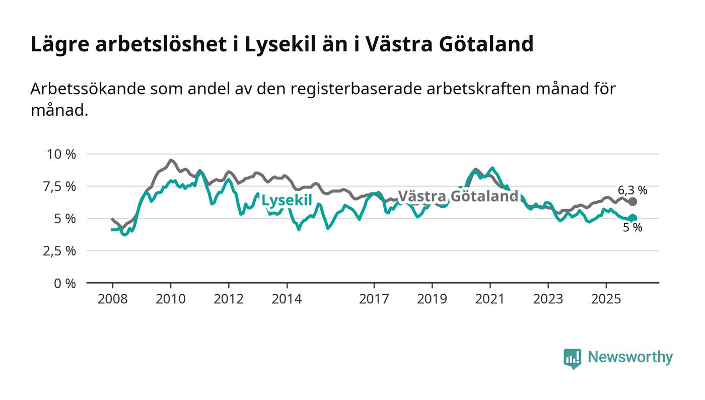 Lysekil hade redan tidigare lägre arbetslöshet än snittet i hela Västra Götalands län och nu växer klyftan (5,0 procent i kommunen, jämfört med 6,3 procent i hela länet). Öckerö har den lägsta arbetslösheten i länet (3,0 procent), medan Gullspång har den högsta (8,8 procent). För att Lysekil skulle komma ner i samma arbetslöshetsnivå som Öckerö skulle 121 personer behöva sysselsättas.
