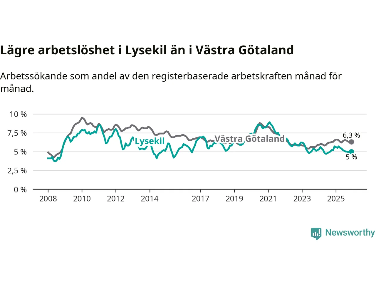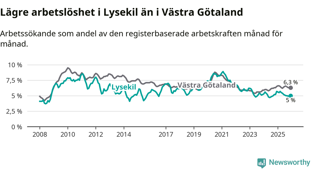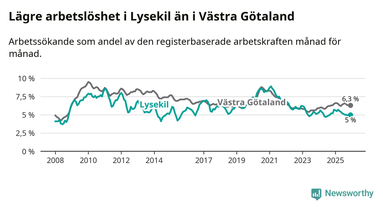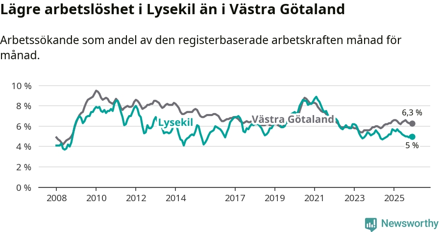 Lysekil hade redan tidigare lägre arbetslöshet än snittet i hela Västra Götalands län och nu växer klyftan (5,0 procent i kommunen, jämfört med 6,3 procent i hela länet). Öckerö har den lägsta arbetslösheten i länet (3,0 procent), medan Gullspång har den högsta (8,8 procent). För att Lysekil skulle komma ner i samma arbetslöshetsnivå som Öckerö skulle 121 personer behöva sysselsättas.