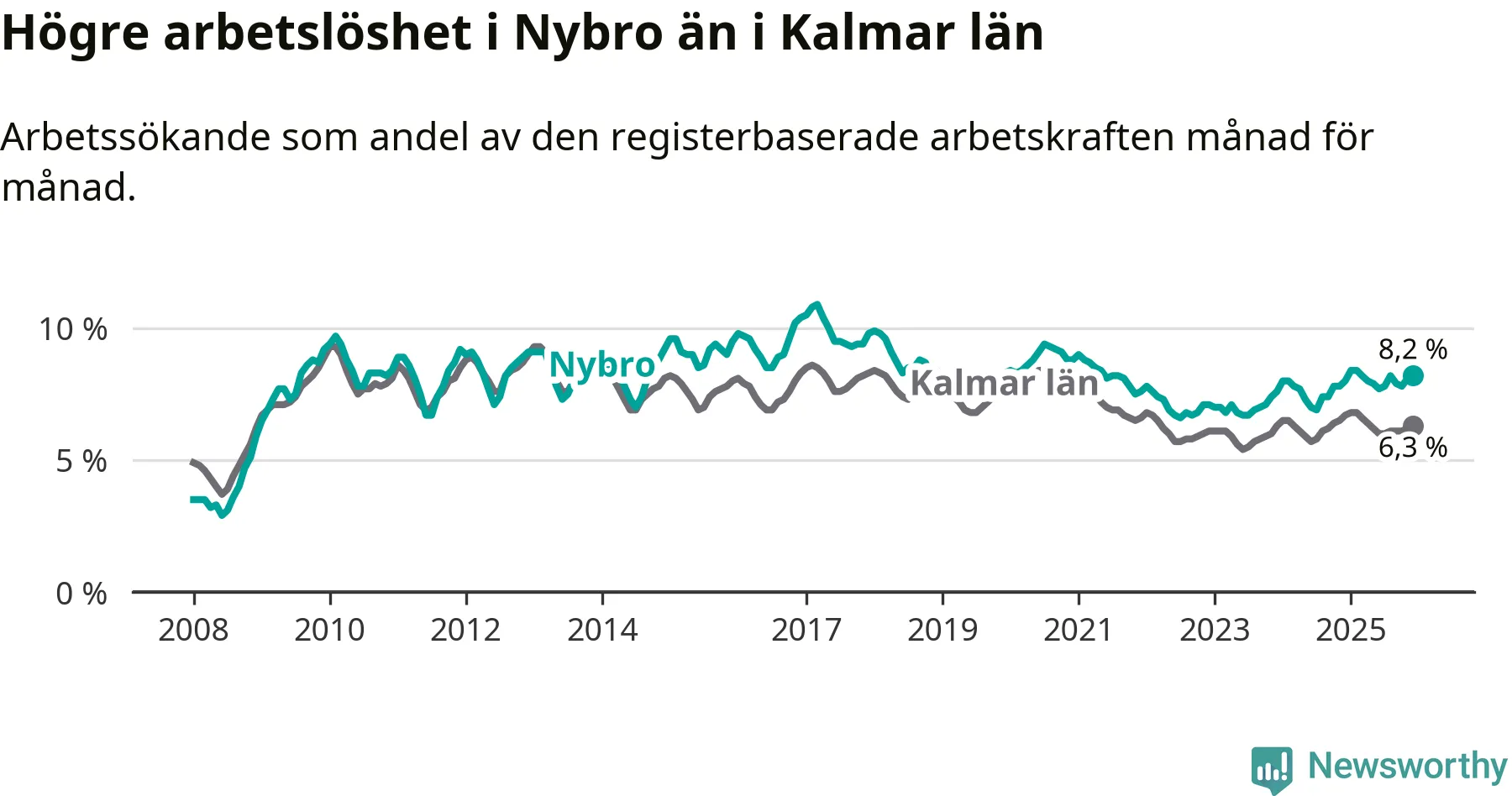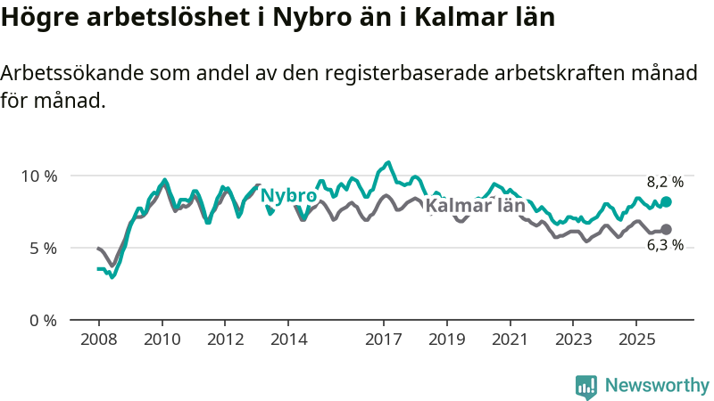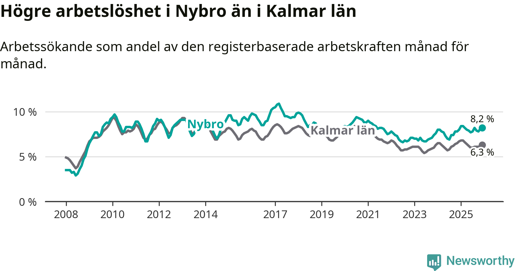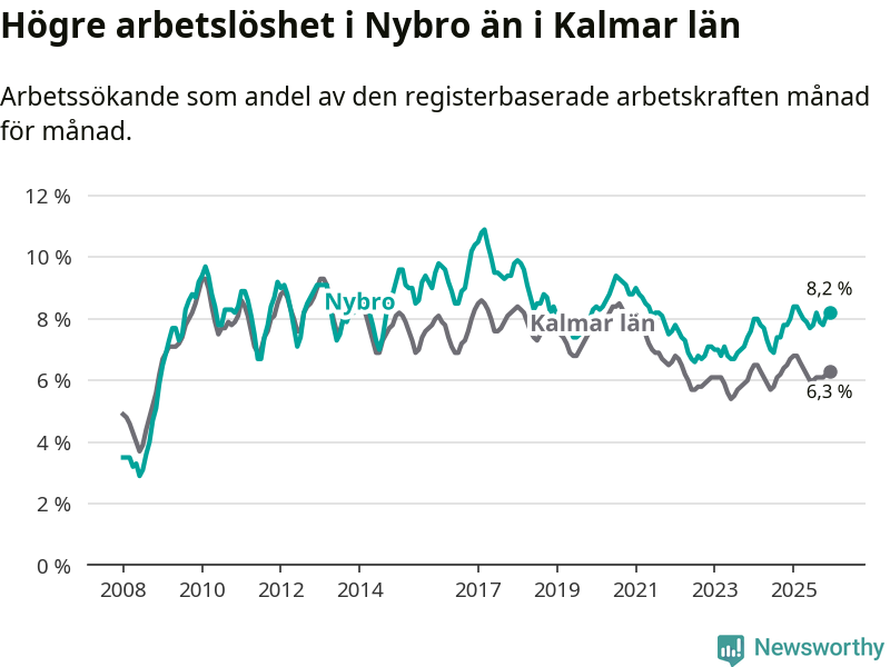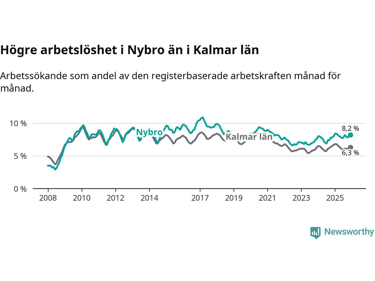 Under december månad rapporterade Nybro kommun en total arbetslöshet på 8,2 procent. Det är en ökning jämfört med samma tidpunkt i fjol (+0,2 procentenheter). I Kalmar län däremot sjunker arbetslösheten .