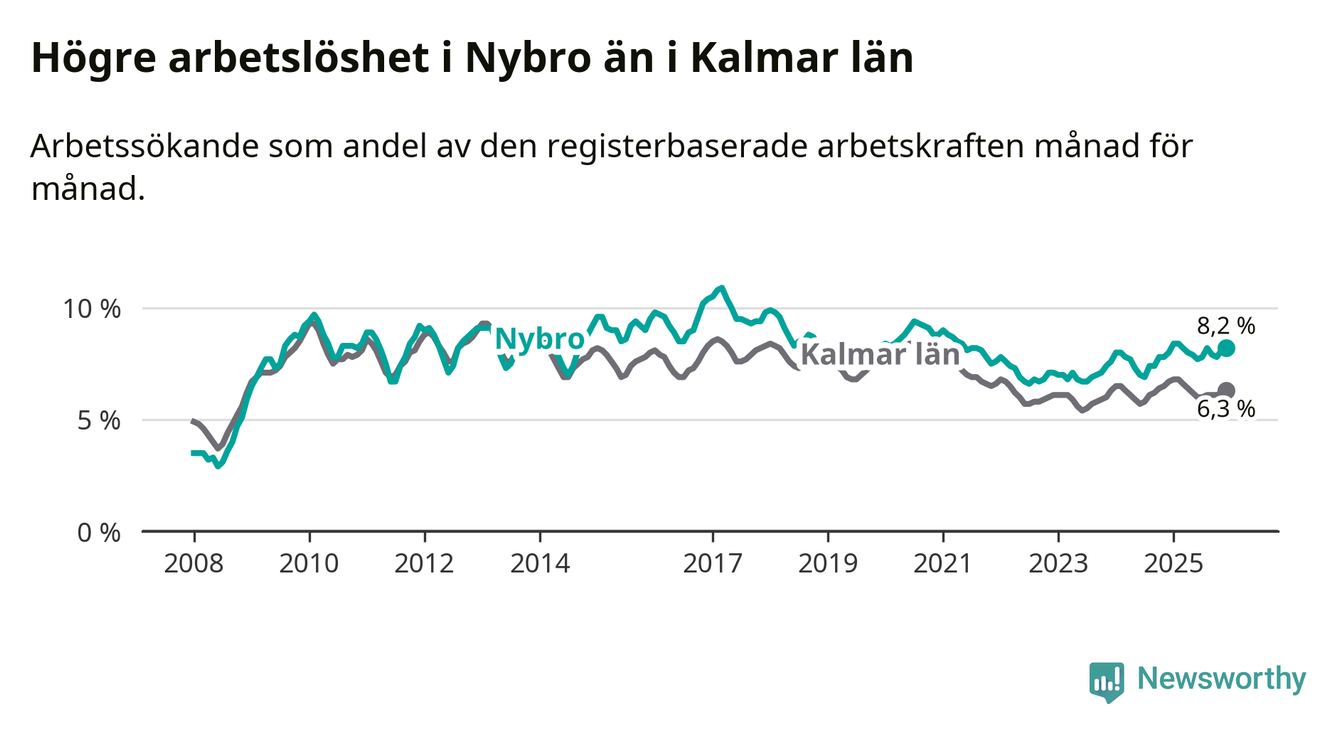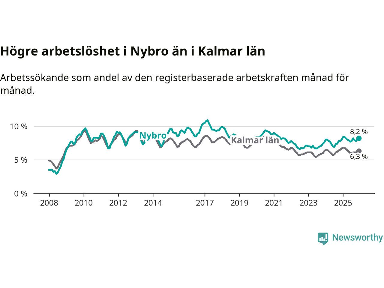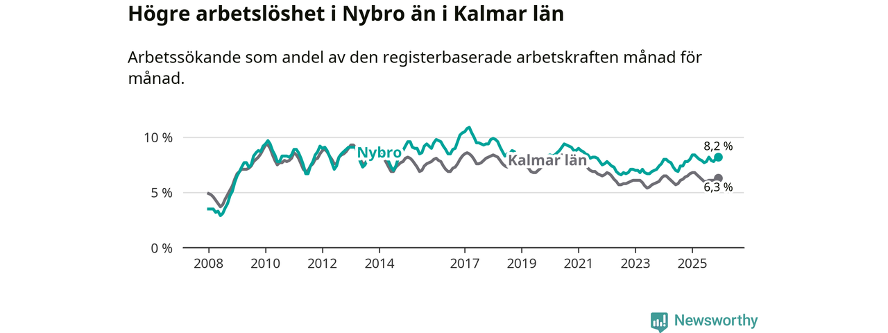 Nybro går därmed mot strömmen i förhållande till andra kommuner i Kalmar län. I de flesta andra kommuner i länet går arbetslösheten nedåt. Störst är minskningen i Vimmerby, där arbetslösheten sjunker med 1,5 procentenheter. I tabellen längre ner ser du utvecklingen i samtliga kommuner i länet.
