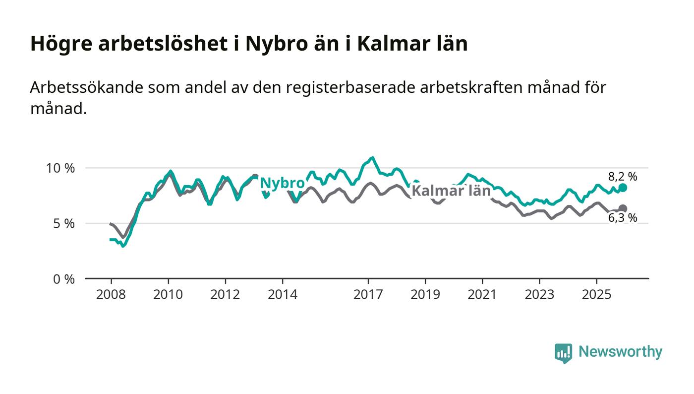 Nybro hade redan tidigare högre arbetslöshet än snittet i hela Kalmar län och nu växer klyftan (8,2 procent i kommunen, jämfört med 6,3 procent i hela länet). Mörbylånga har den lägsta arbetslösheten i länet (3,8 procent), medan Högsby har den högsta (8,5 procent). För att Nybro skulle komma ner i samma arbetslöshetsnivå som Mörbylånga skulle 400 personer behöva sysselsättas.