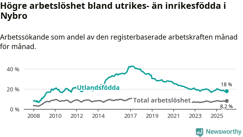 Arbetslösheten bland utlandsfödda var 18,0 procent i Nybro under december månad, motsvarande 388 av 2 156 personer. Det är 0,9 procentenheter färre än vid samma tidpunkt i fjol (−19 om man räknar personer).