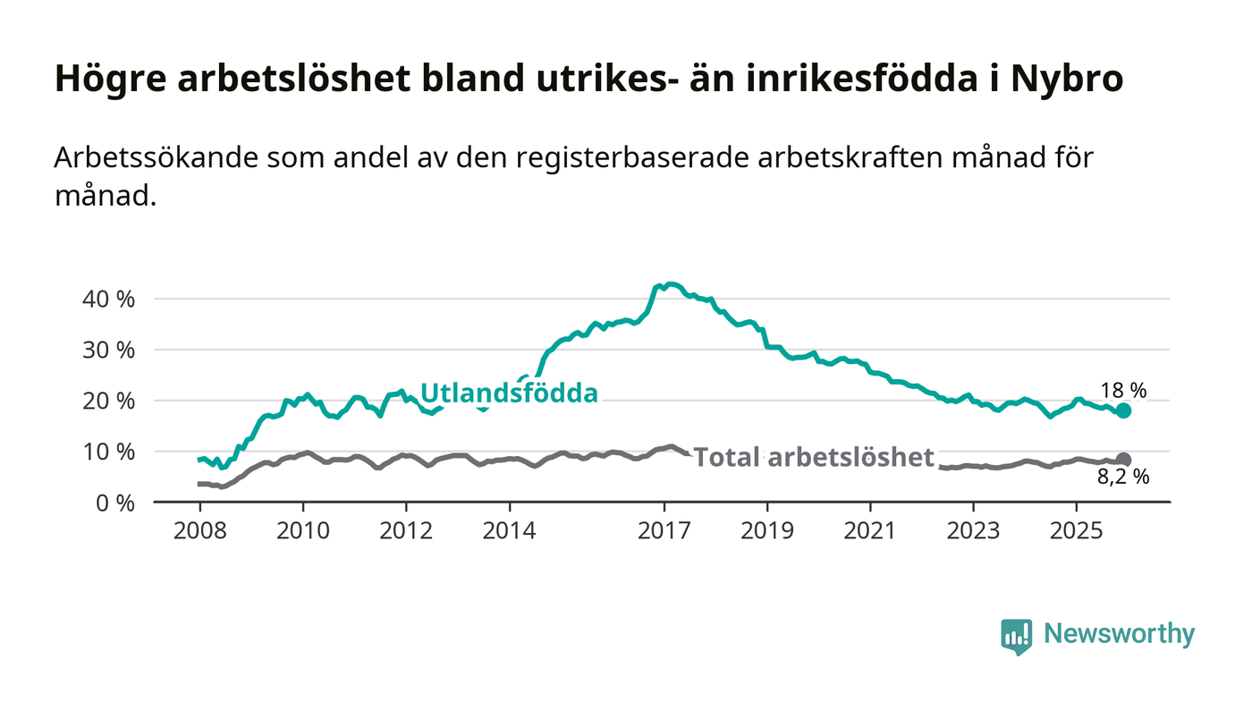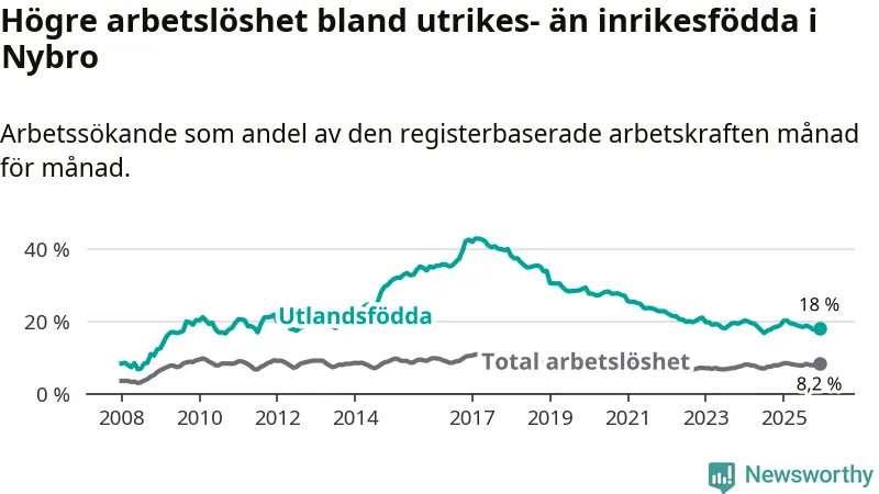 Skillnaden i arbetslöshet mellan utrikesfödda och hela befolkningen är 9,8 procentenheter i Nybro. Det är en mindre skillnad än för ett år sedan (−1,1 procentenheter).
