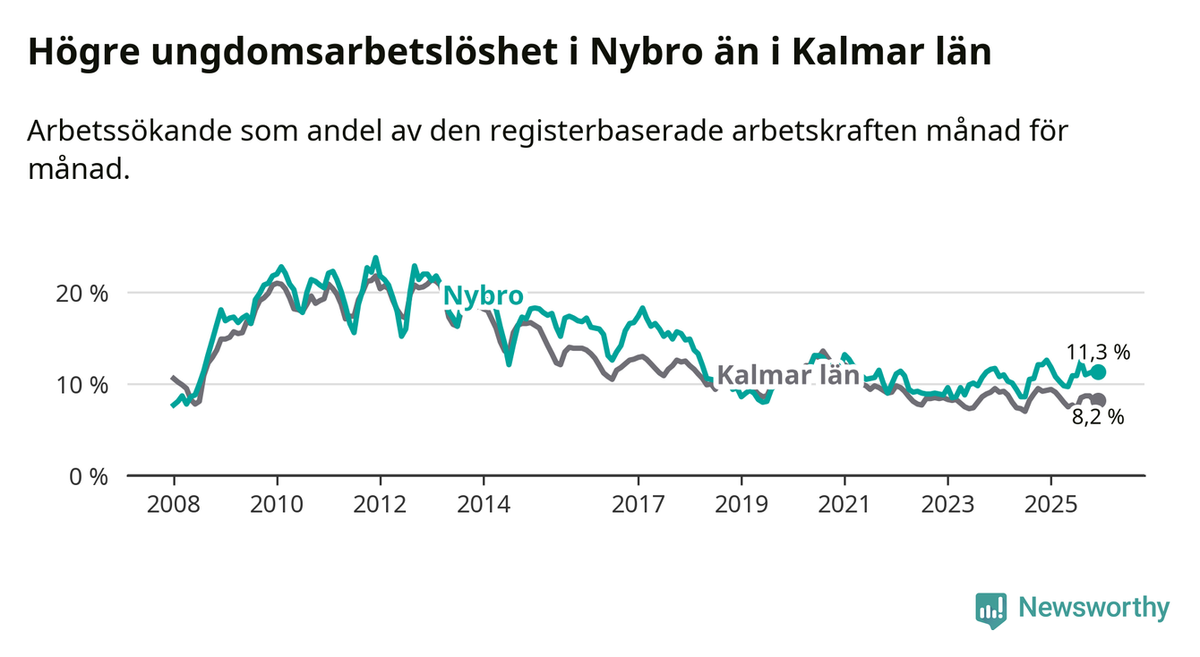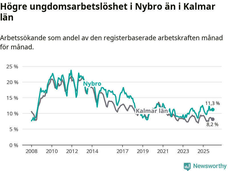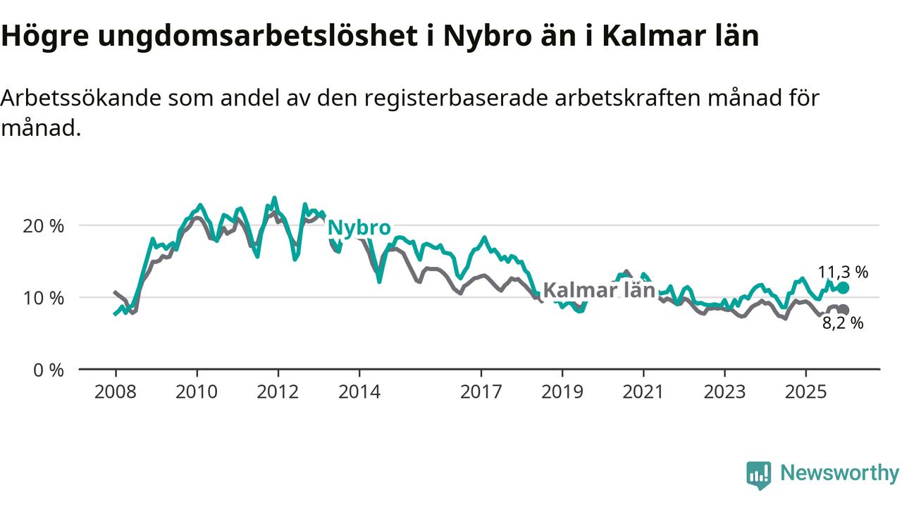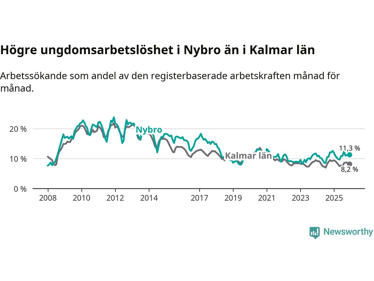 Precis som den totala arbetslösheten ligger ungdomsarbetslösheten i Nybro högre än i Kalmar län som helhet. Skillnaden mellan kommunen och länet är 3,1 procentenheter.