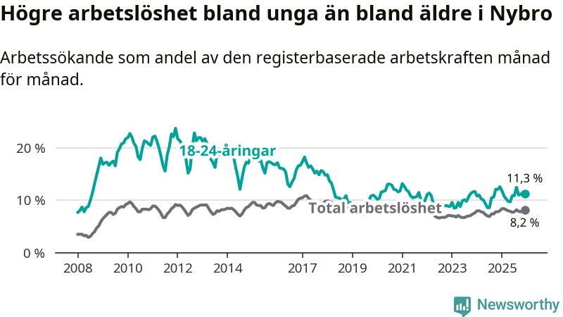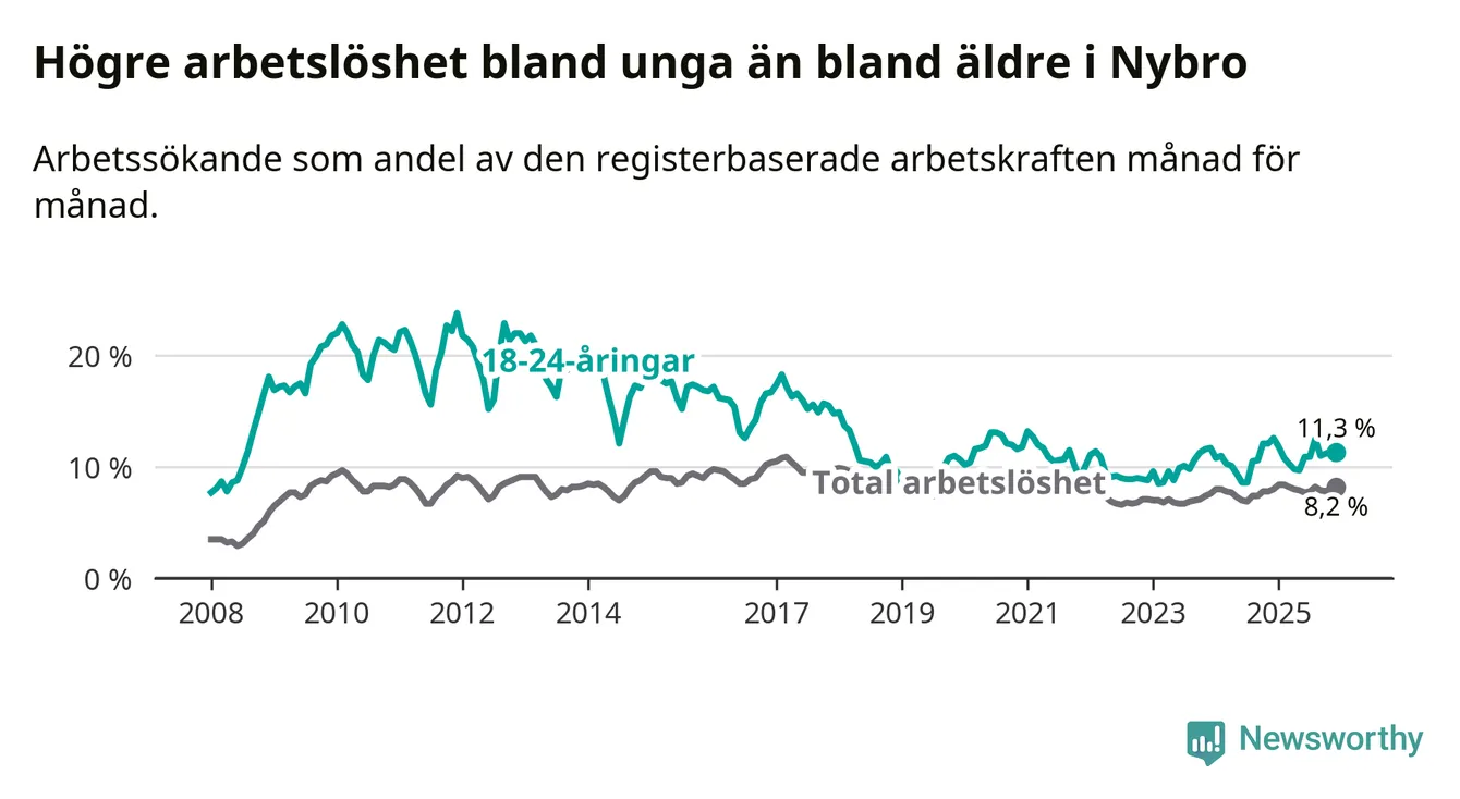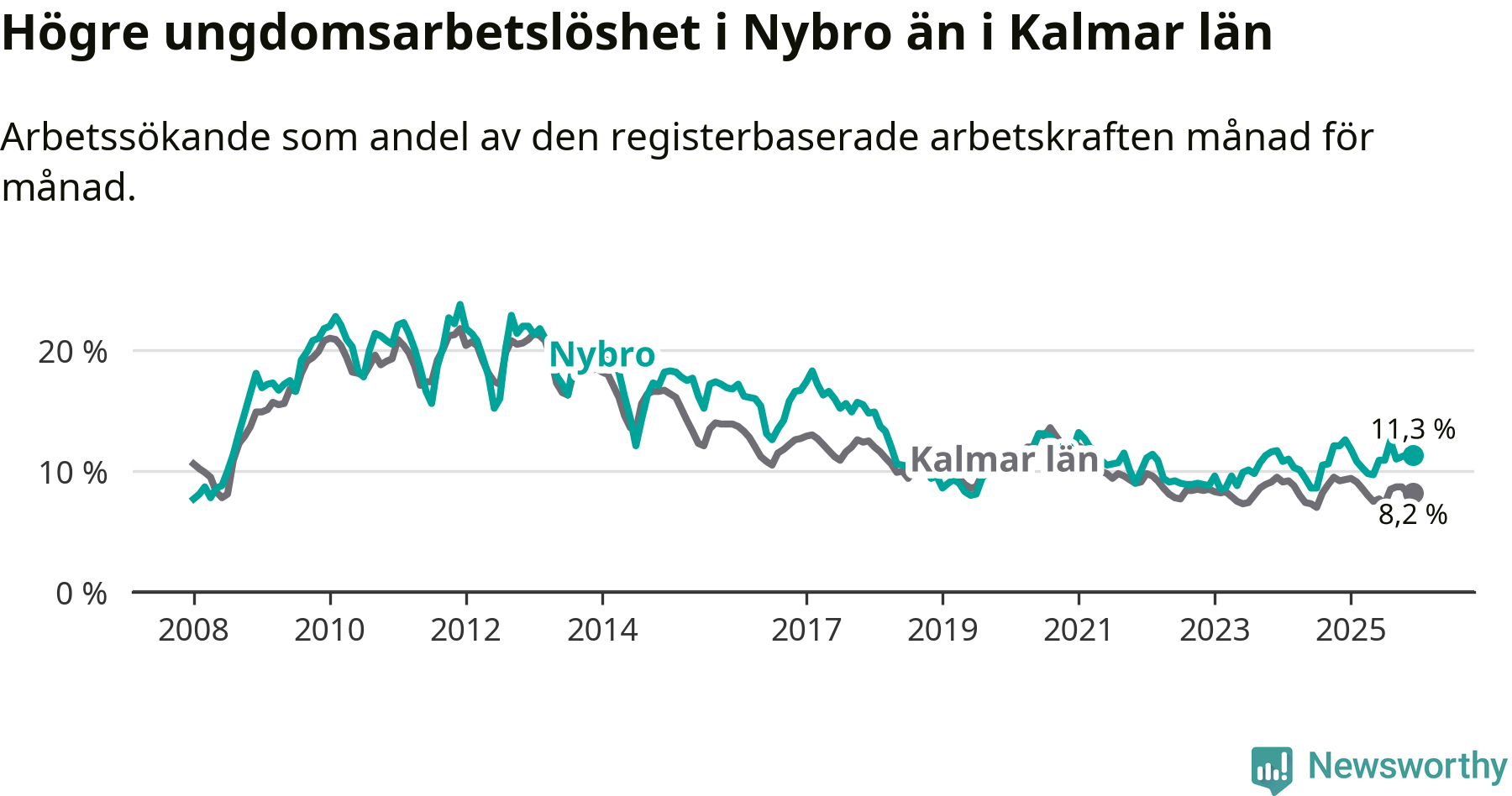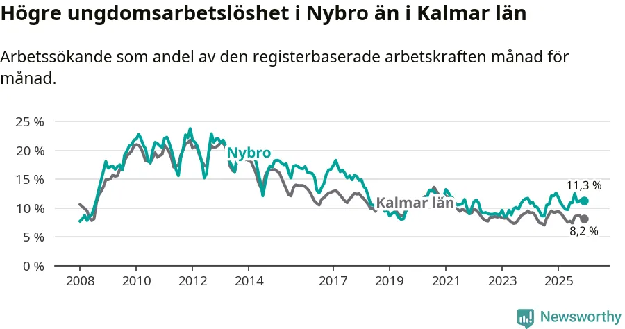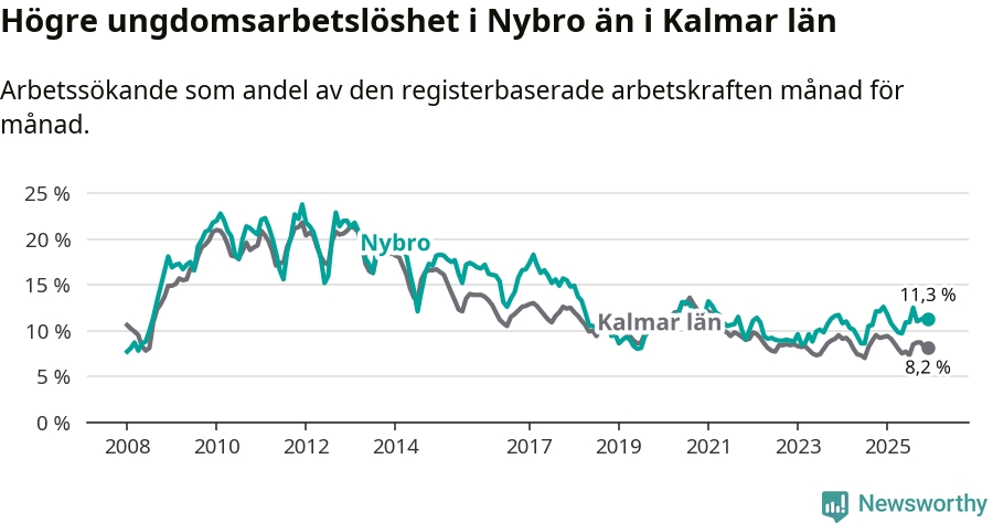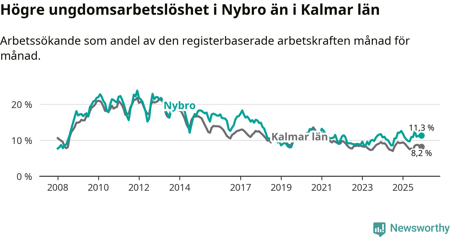 Precis som den totala arbetslösheten ligger ungdomsarbetslösheten i Nybro högre än i Kalmar län som helhet. Skillnaden mellan kommunen och länet är 3,1 procentenheter.