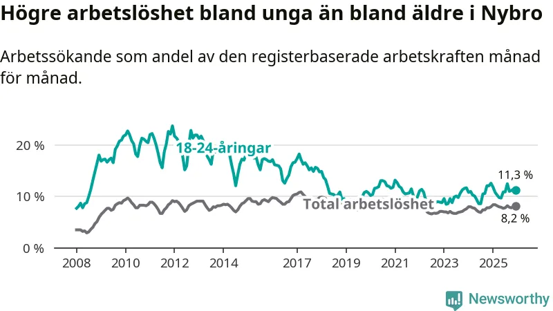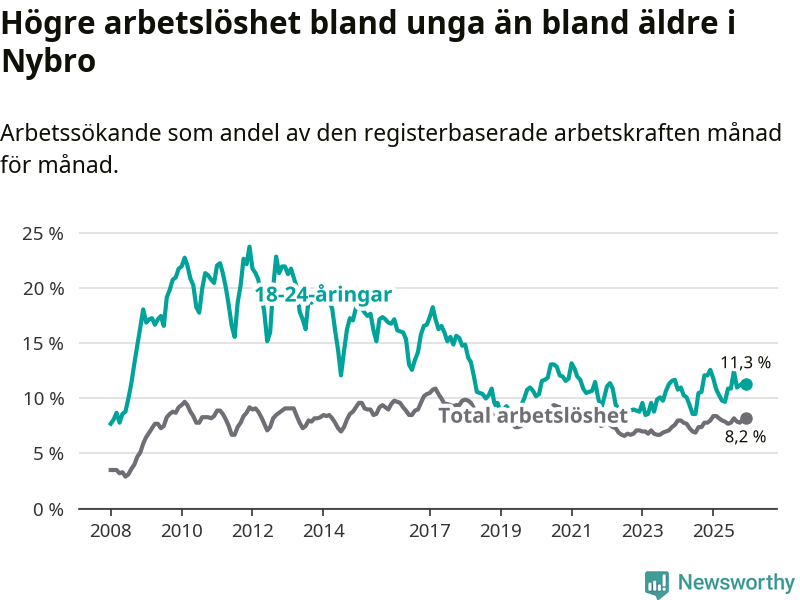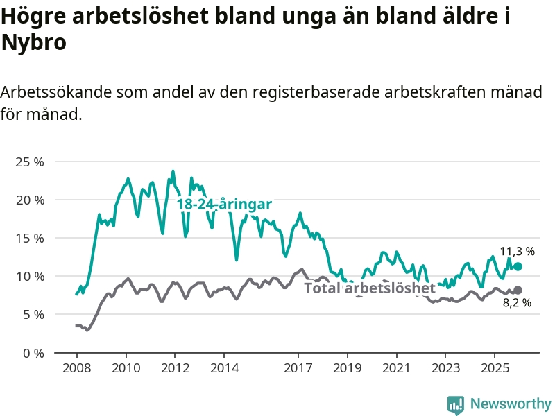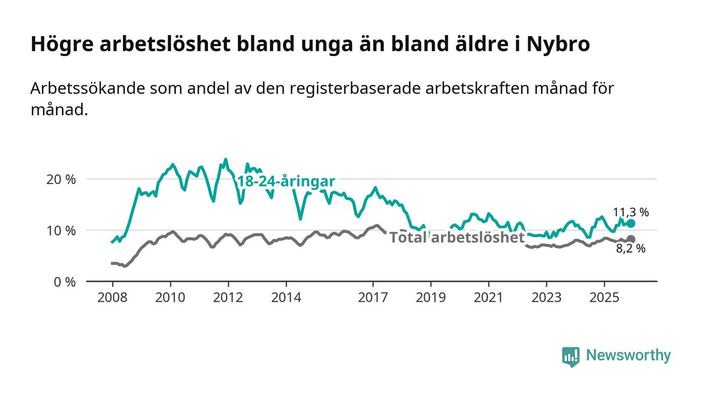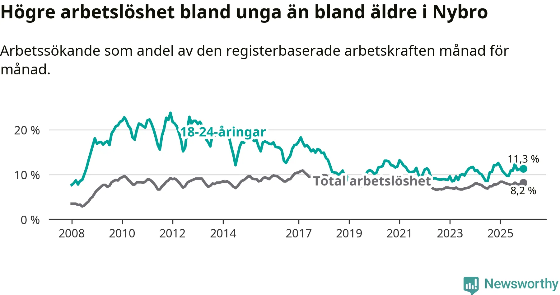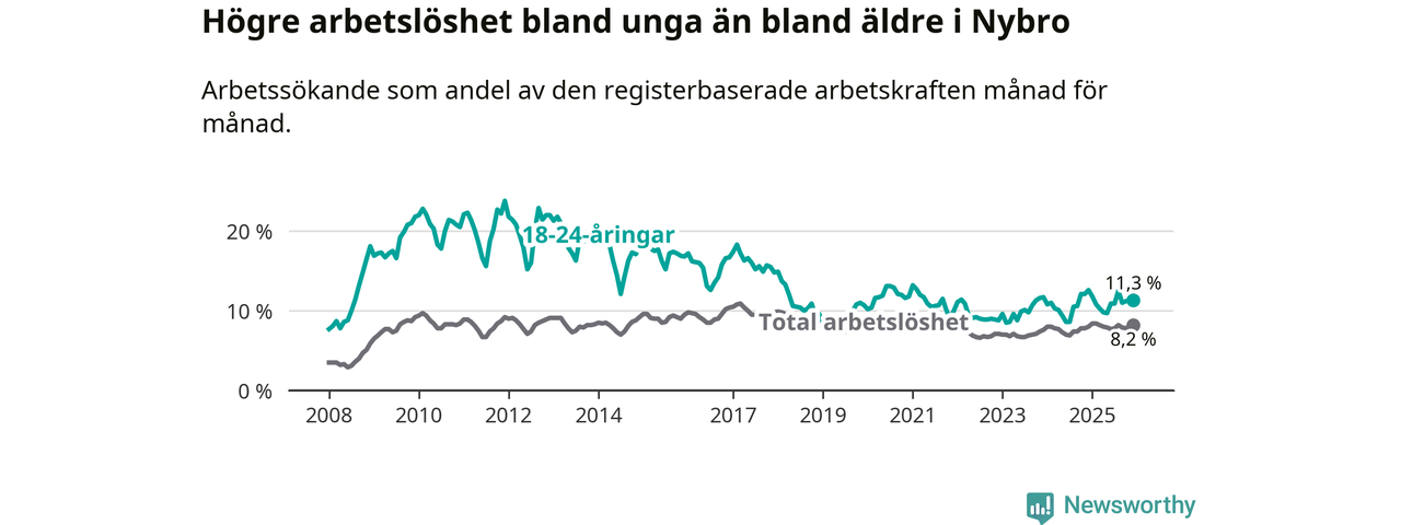 Precis som den totala arbetslösheten ligger ungdomsarbetslösheten i Nybro högre än i Kalmar län som helhet. Skillnaden mellan kommunen och länet är 3,1 procentenheter.