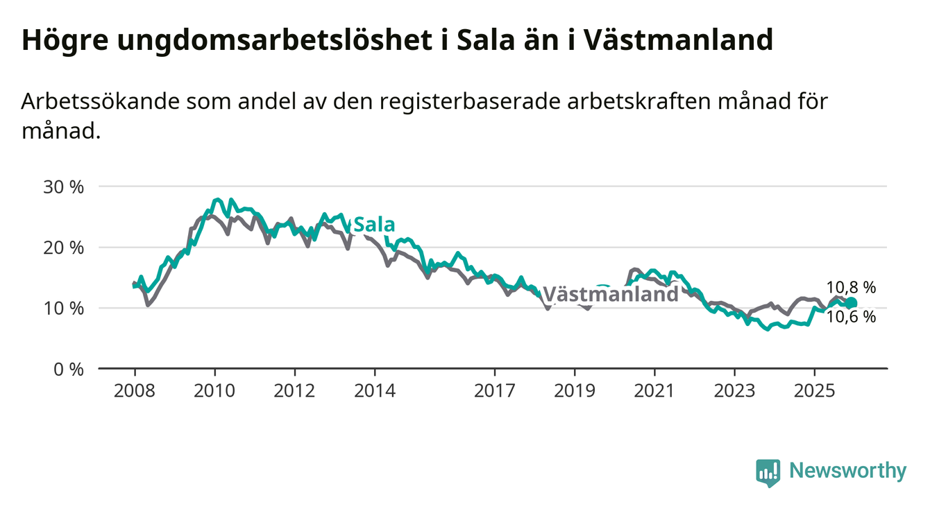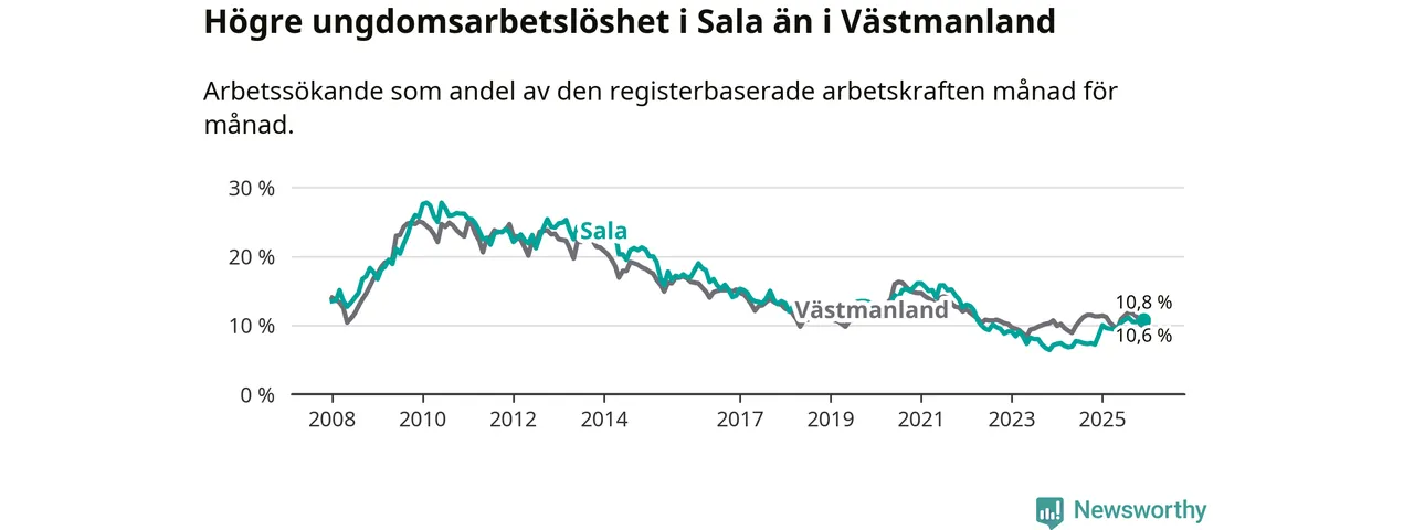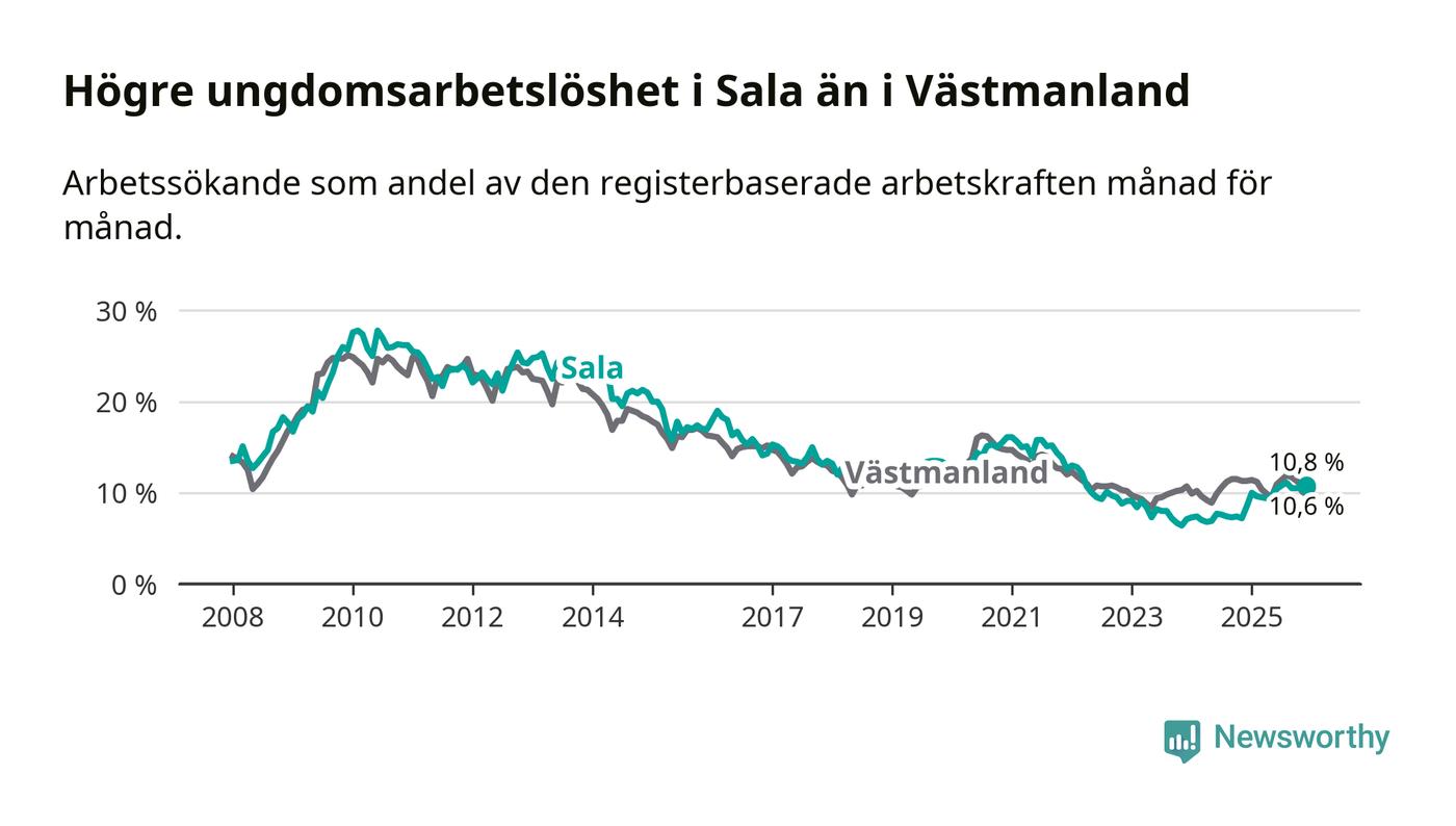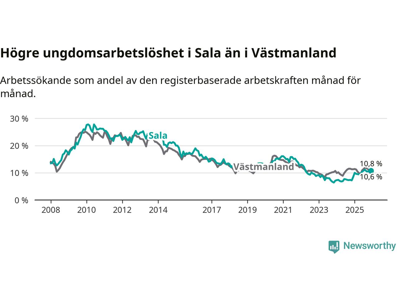 Medan Sala har lägre total arbetslöshet än Västmanland, ligger ungdomsarbetslösheten 0,2 procentenheter högre i Sala.