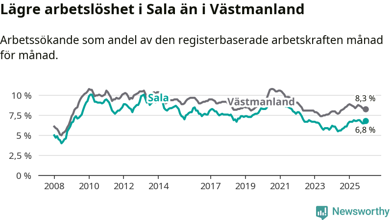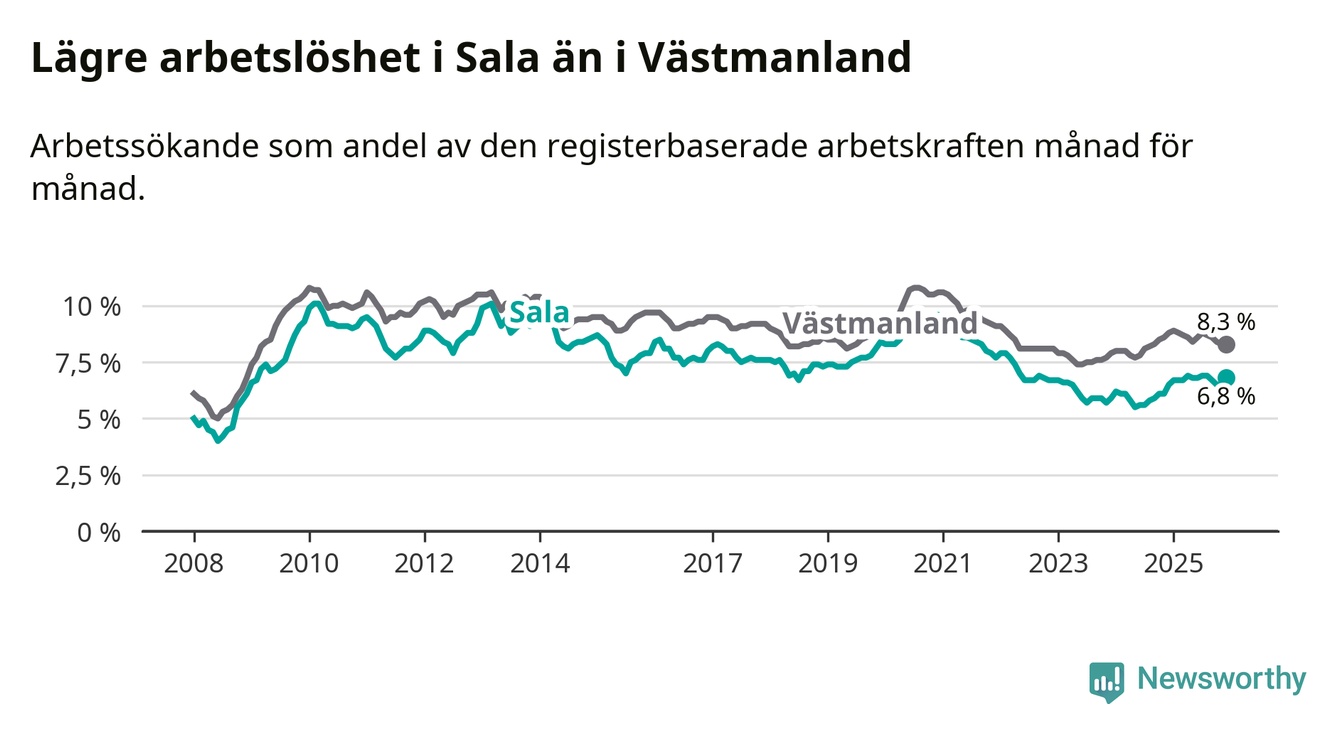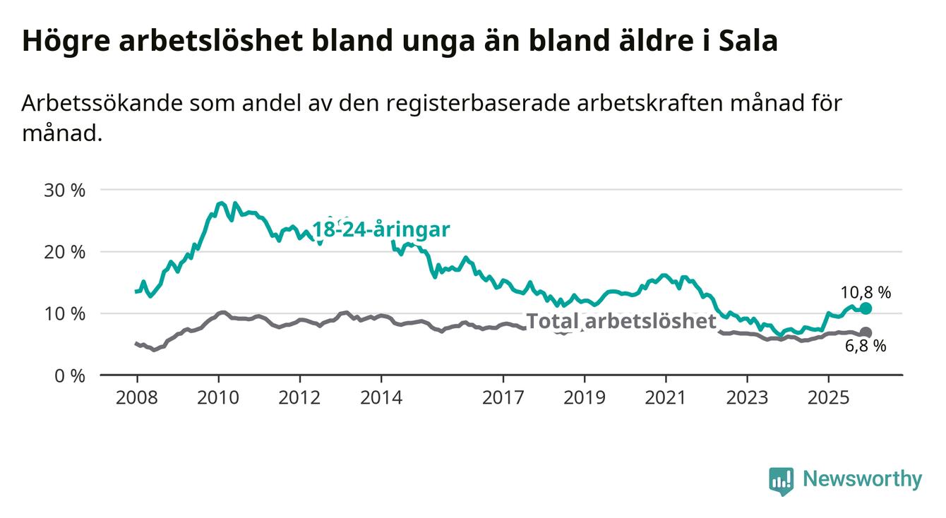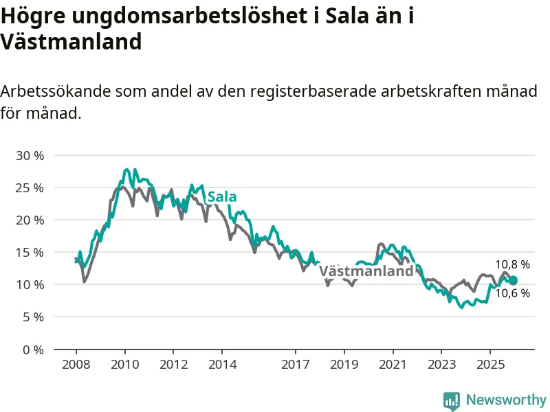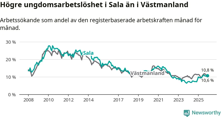 Medan Sala har lägre total arbetslöshet än Västmanland, ligger ungdomsarbetslösheten 0,2 procentenheter högre i Sala.