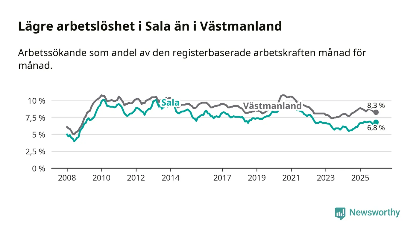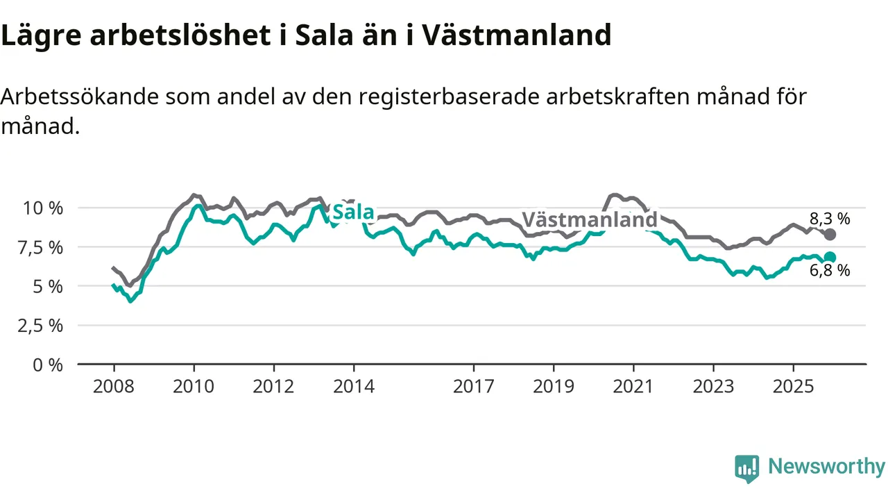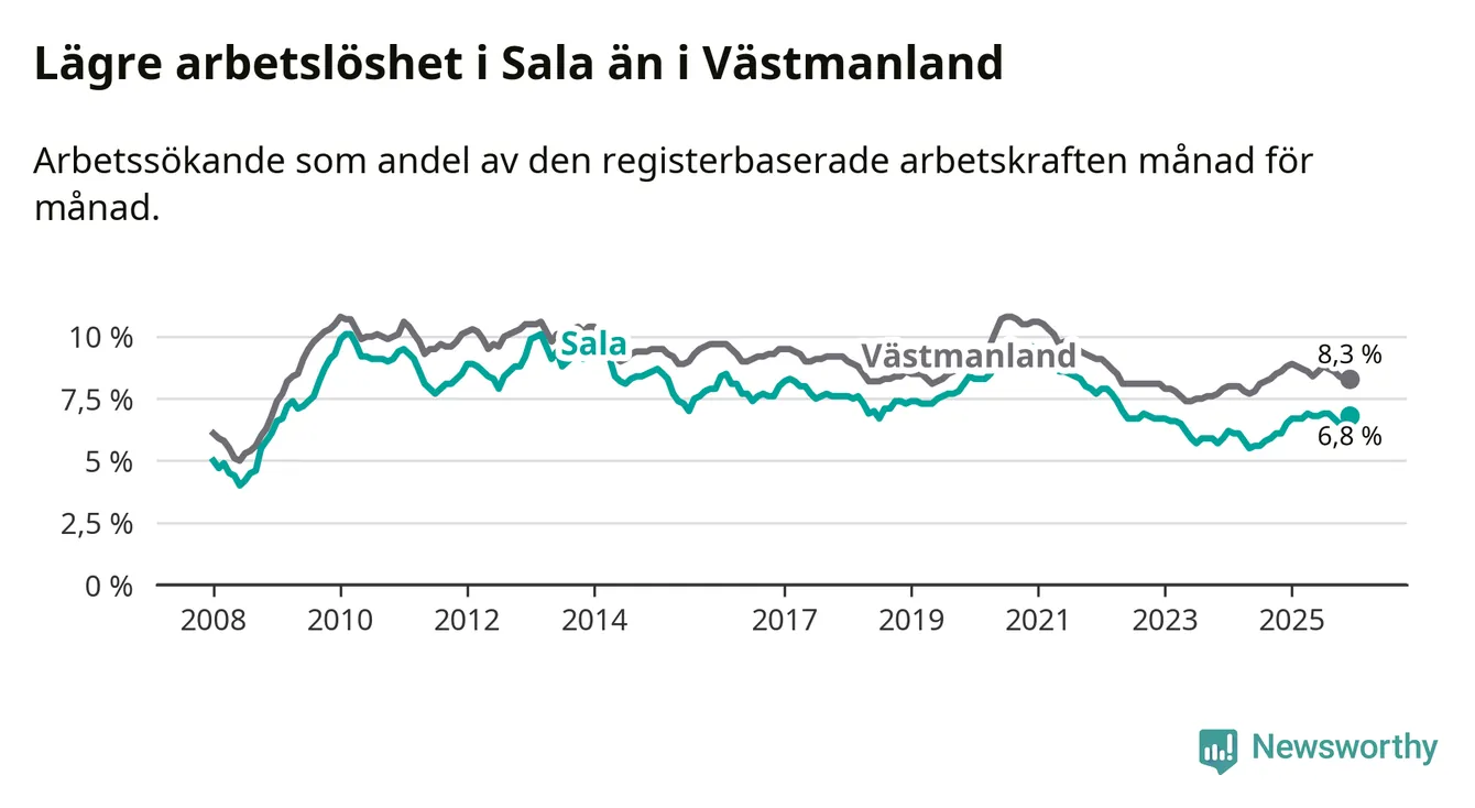 Sala går därmed mot strömmen i förhållande till andra kommuner i Västmanlands län. I de flesta andra kommuner i länet går arbetslösheten nedåt. Störst är minskningen i Arboga, där arbetslösheten sjunker med 1,3 procentenheter. I tabellen längre ner ser du utvecklingen i samtliga kommuner i länet.
