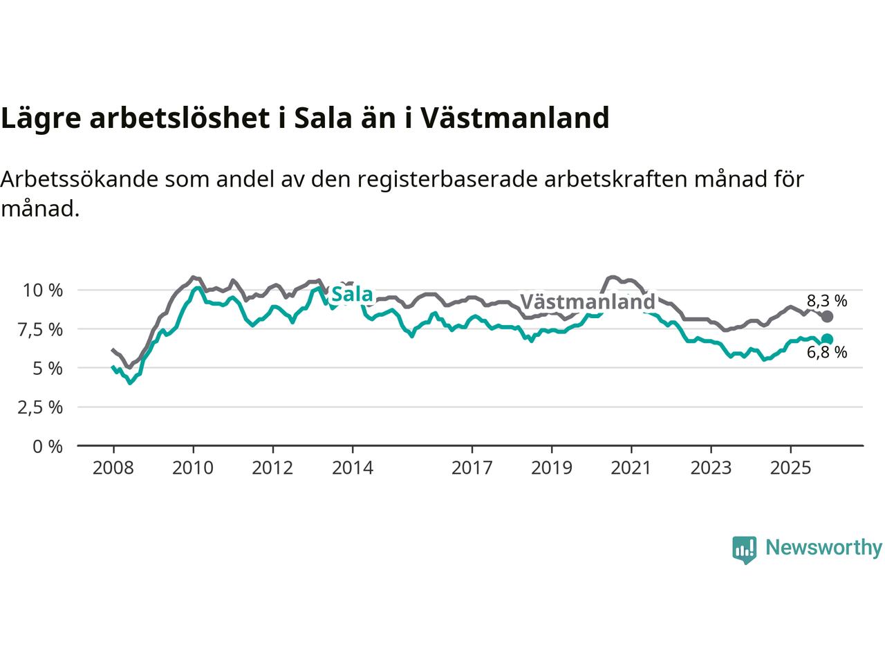 Även om arbetslösheten i Sala alltså ökar, så ligger den fortfarande under snittet i hela Västmanlands län (6,8 procent i kommunen, jämfört med 8,3 procent i hela länet). Surahammar har den lägsta arbetslösheten i länet (6,5 procent), medan Fagersta har den högsta (9,8 procent). För att Sala skulle komma ner i samma arbetslöshetsnivå som Surahammar skulle 32 personer behöva sysselsättas.