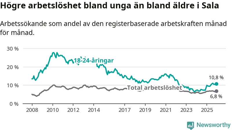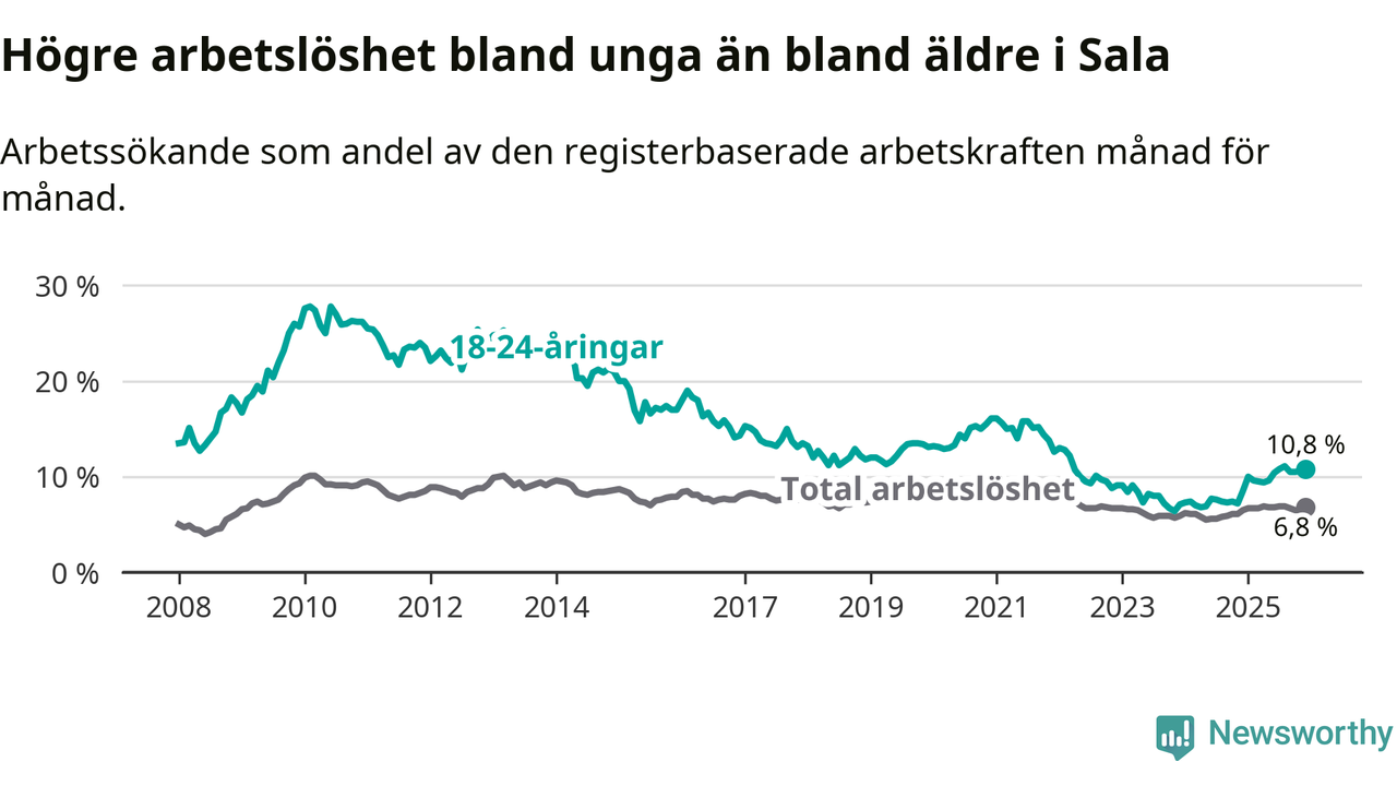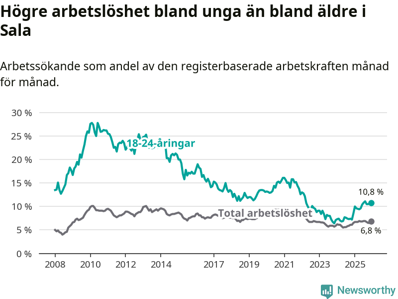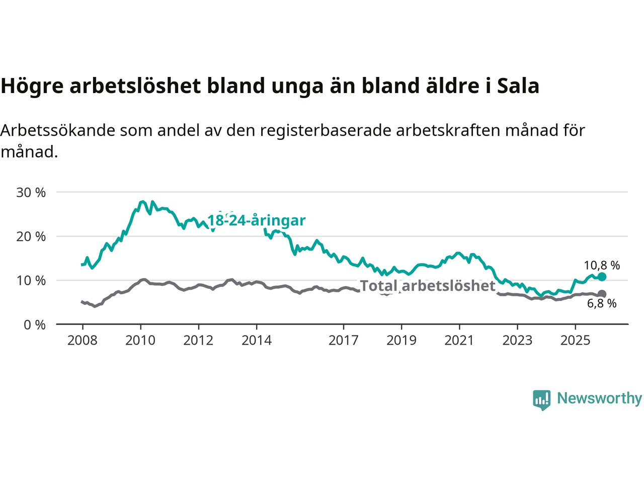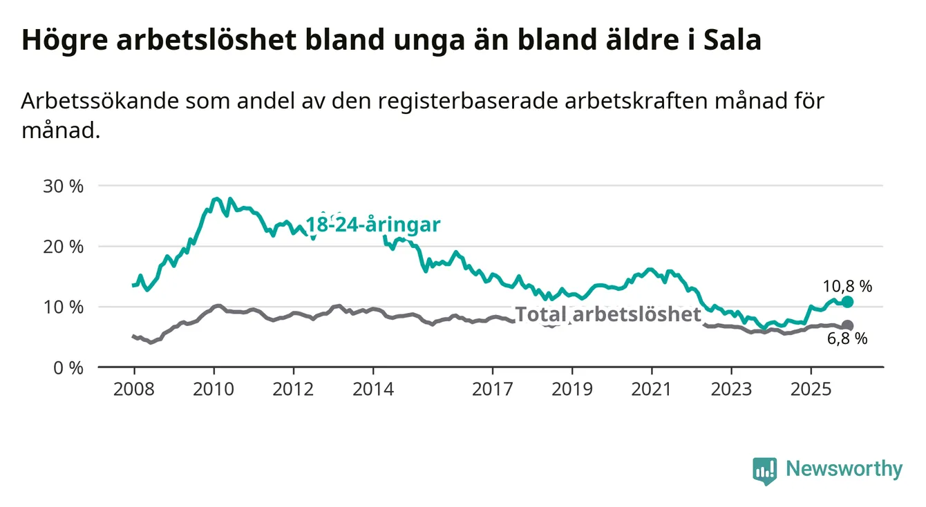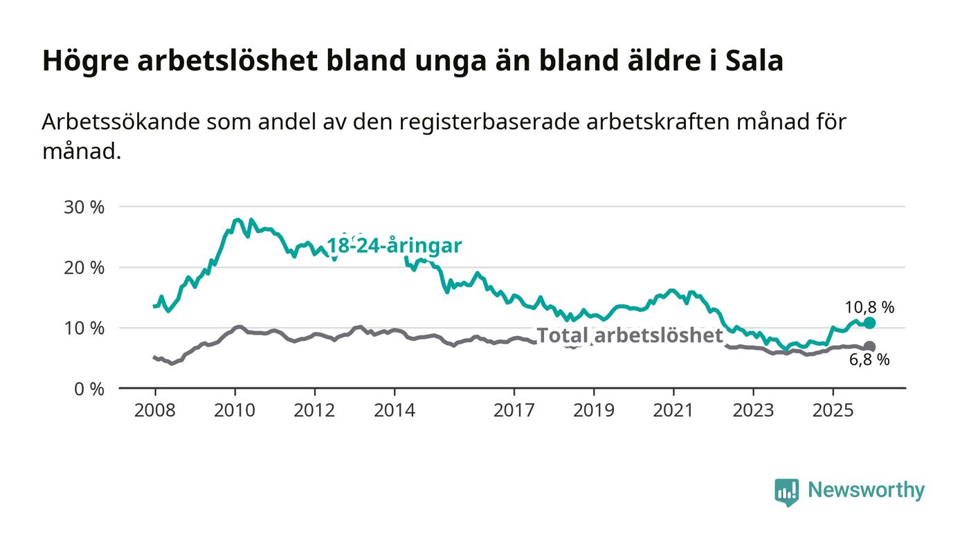 I och med den senaste månadens uppgång har de ungas arbetslöshet i Sala stigit 16 månader i följd (upp från 7,4 procent i augusti 2024 till 10,8 procent nu).