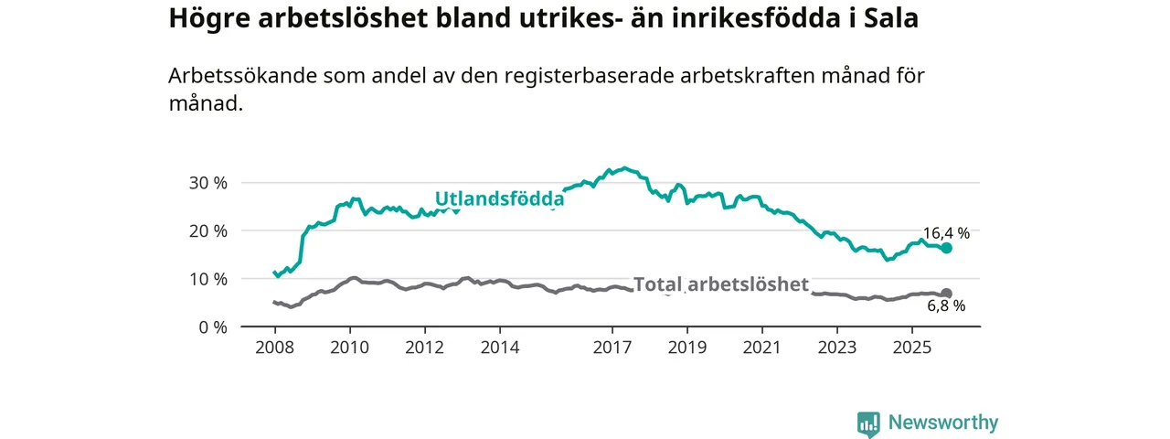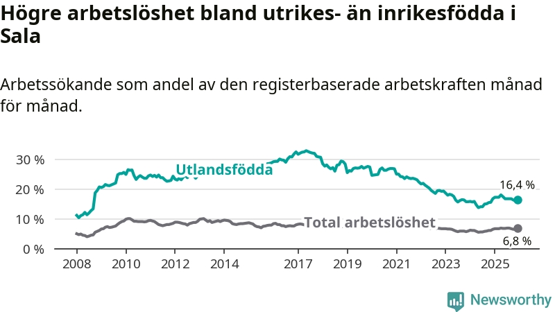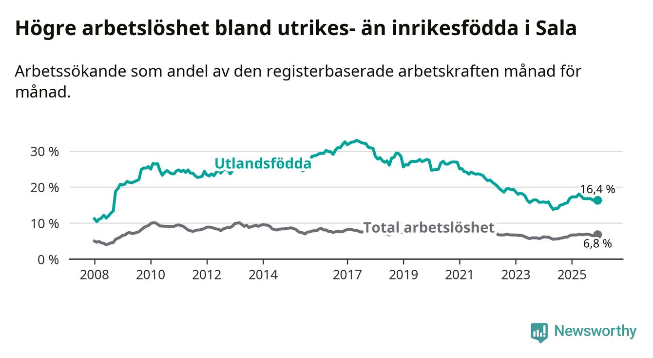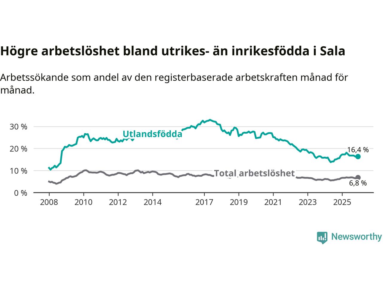 Skillnaden i arbetslöshet mellan utrikesfödda och hela befolkningen är 9,6 procentenheter i Sala. Det är en mindre skillnad än för ett år sedan (−0,7 procentenheter).