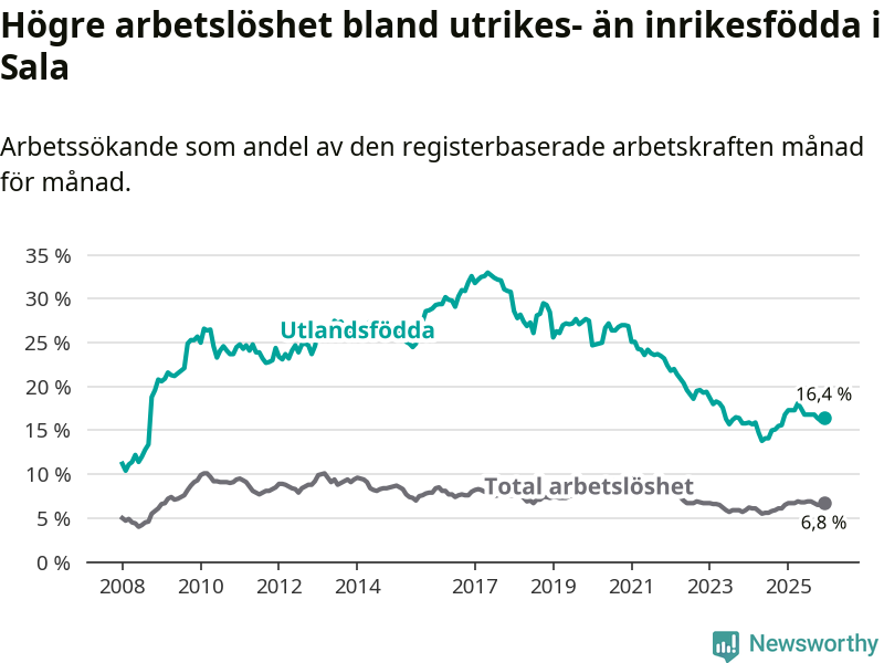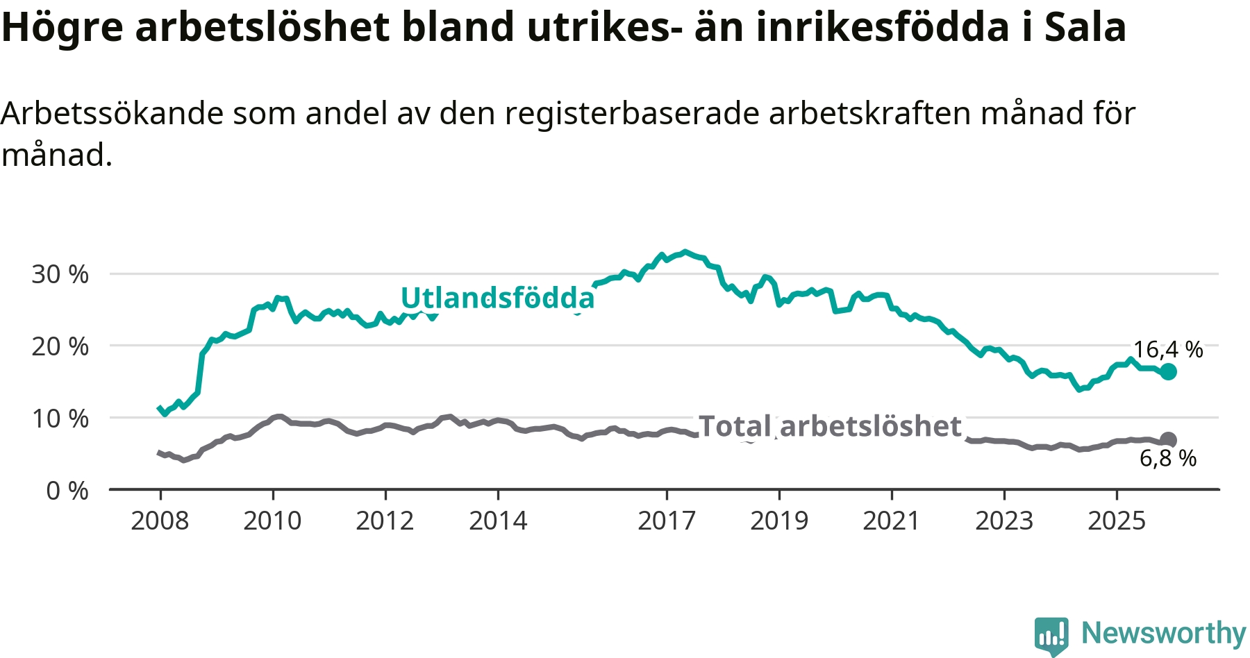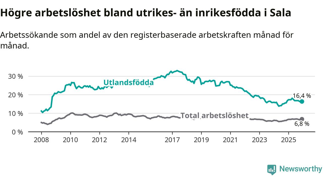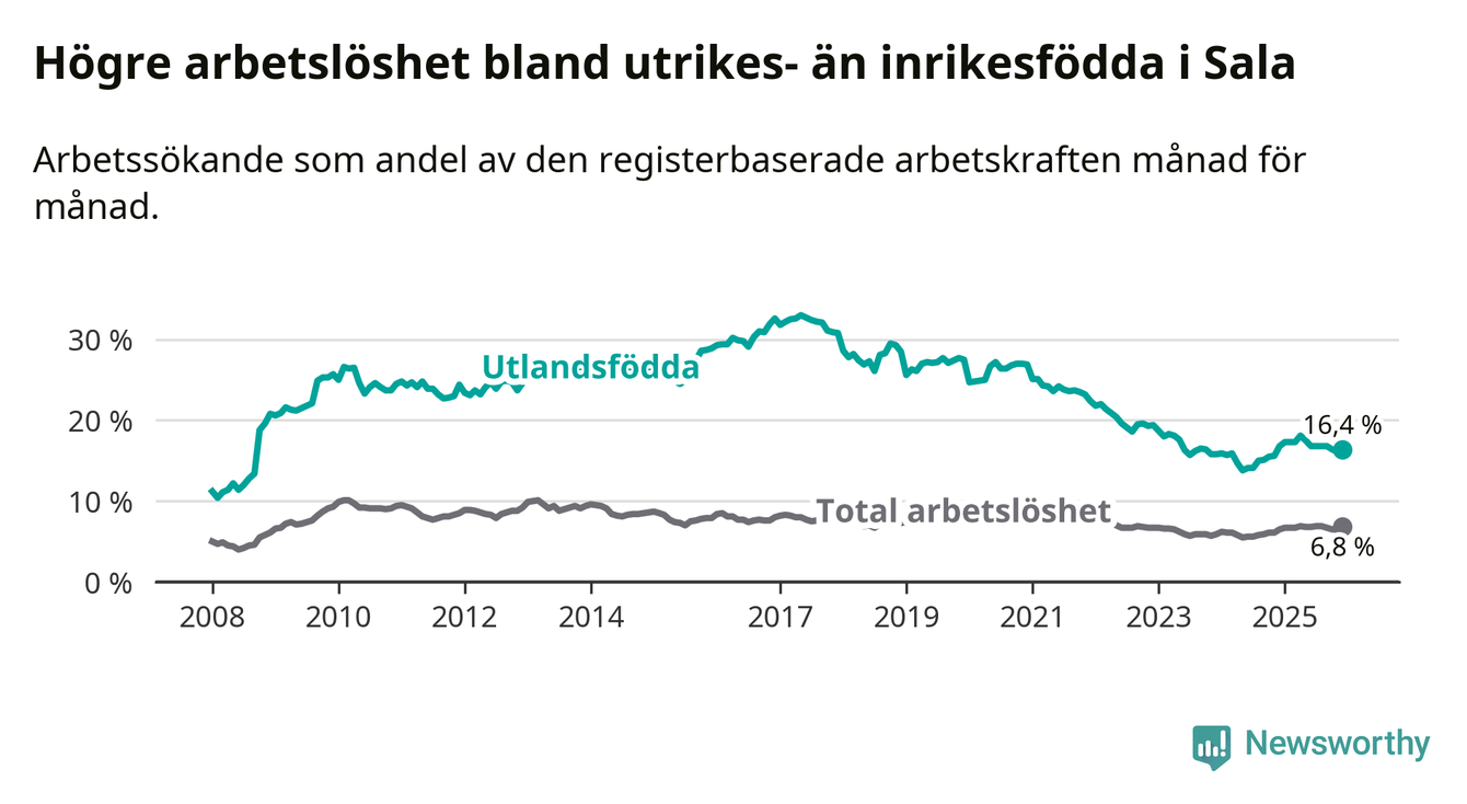 Skillnaden i arbetslöshet mellan utrikesfödda och hela befolkningen är 9,6 procentenheter i Sala. Det är en mindre skillnad än för ett år sedan (−0,7 procentenheter).