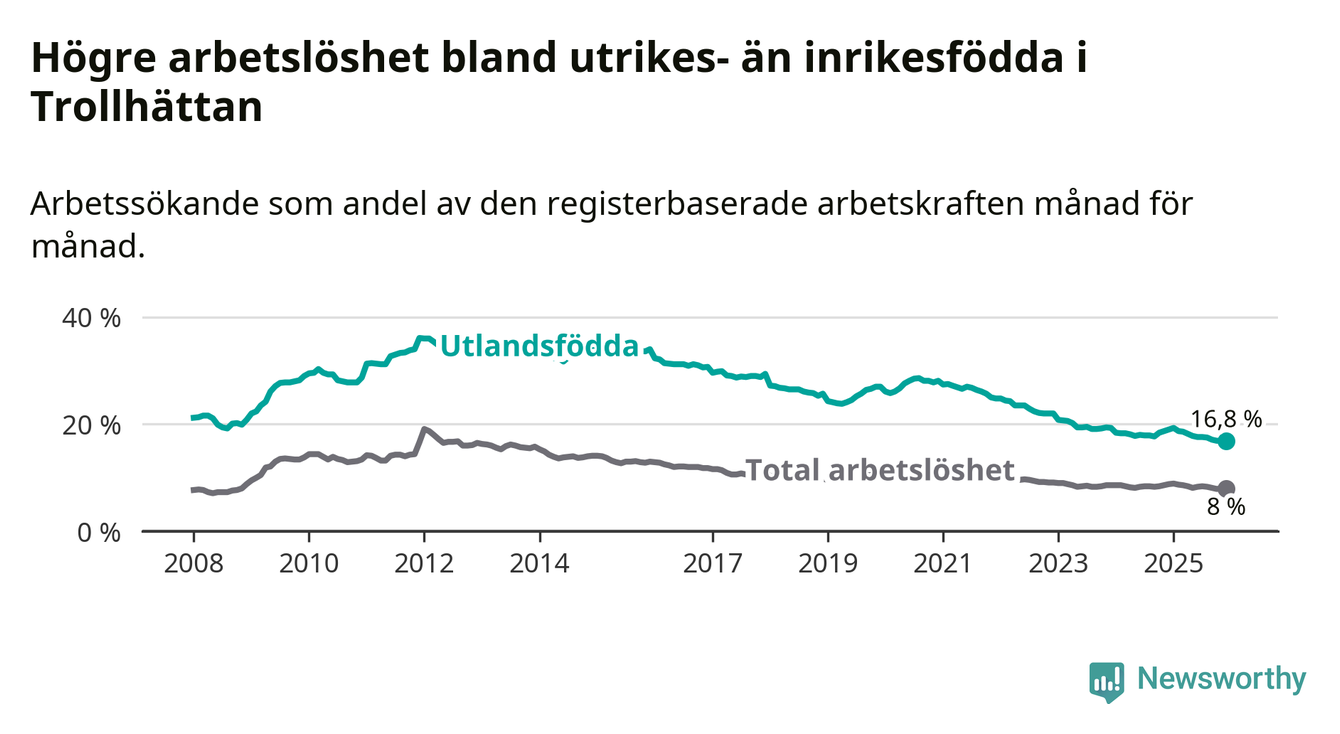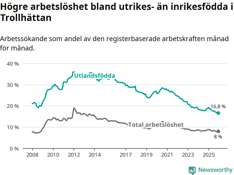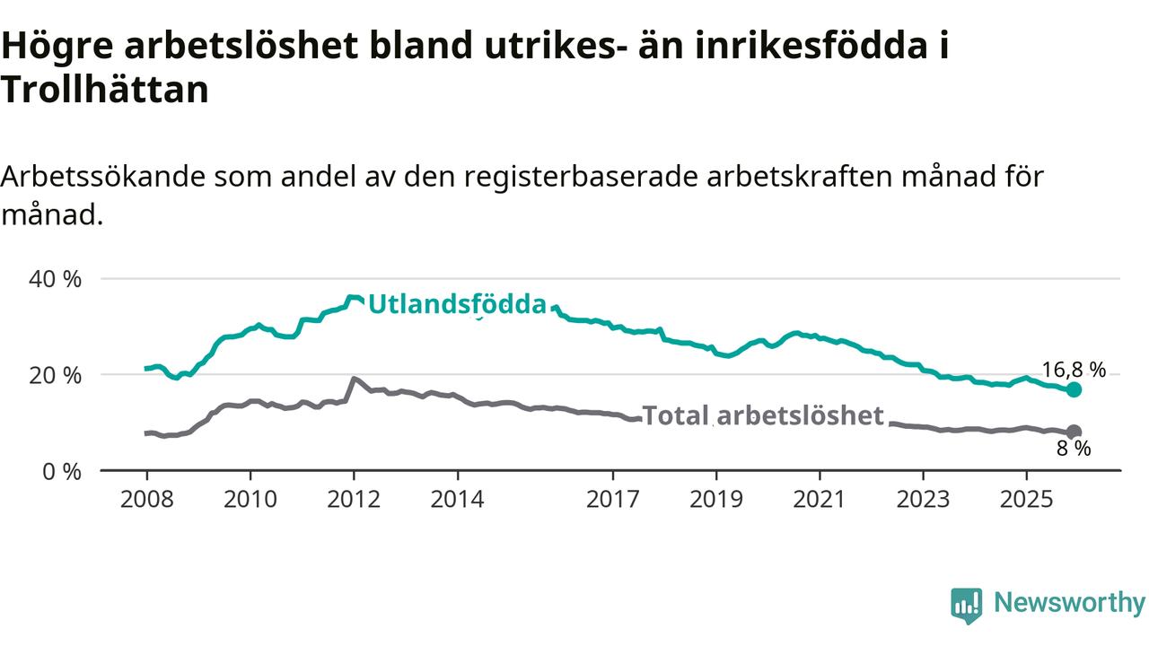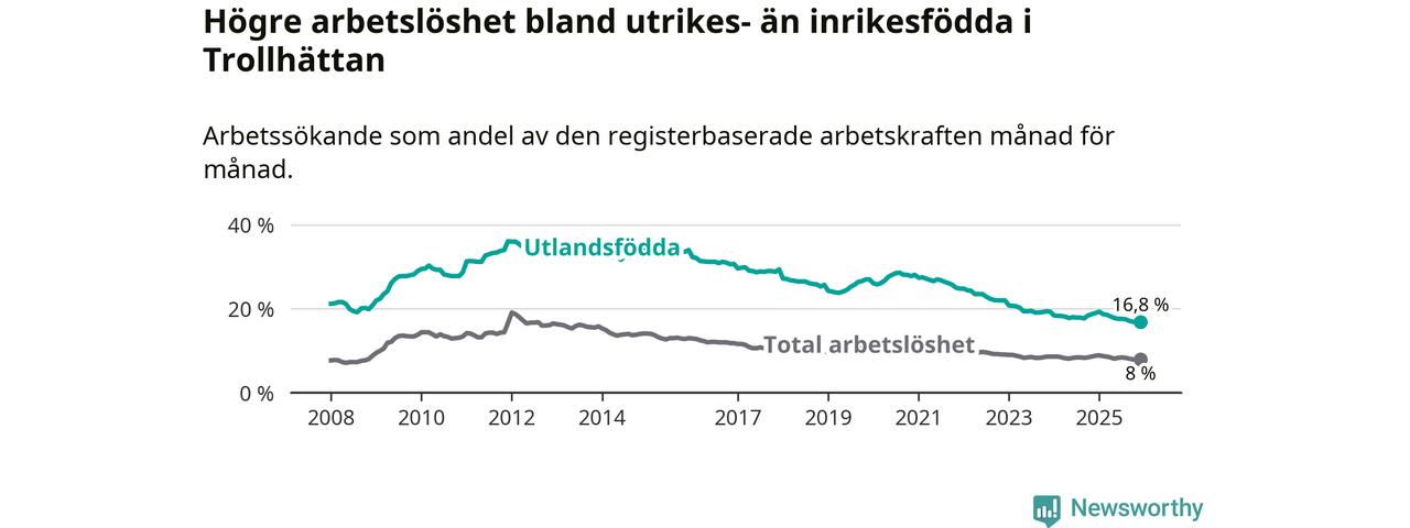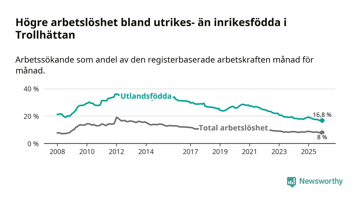 Skillnaden i arbetslöshet mellan utrikesfödda och hela befolkningen är 8,8 procentenheter i Trollhättan. Det är en mindre skillnad än för ett år sedan (−1,4 procentenheter).