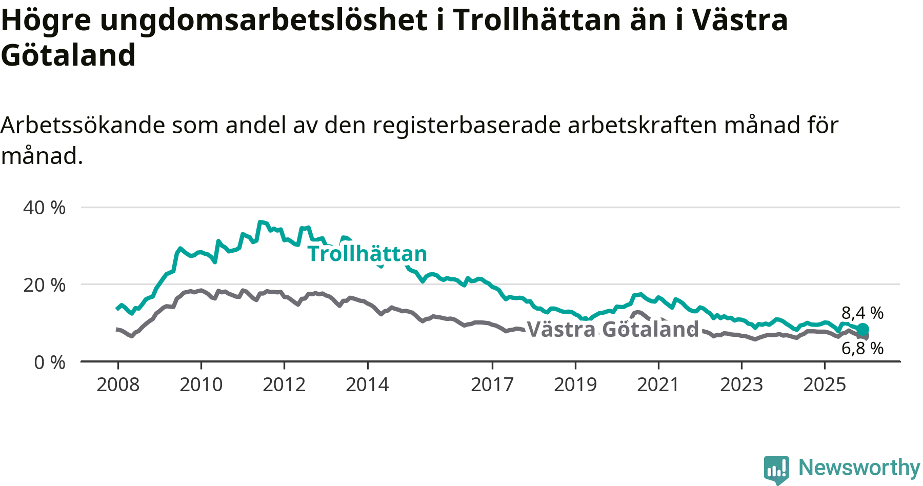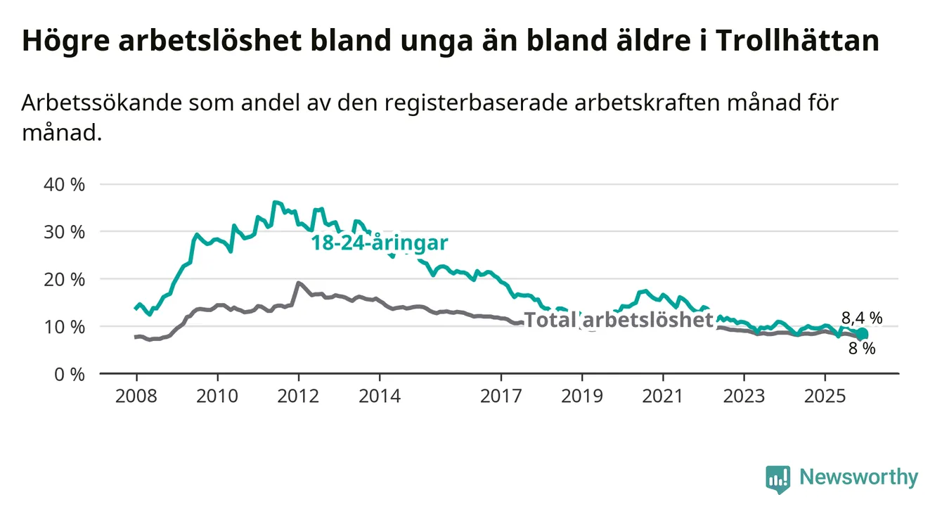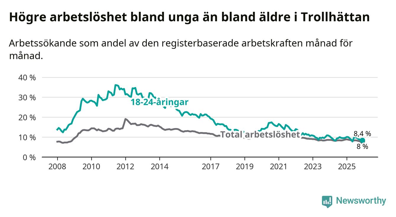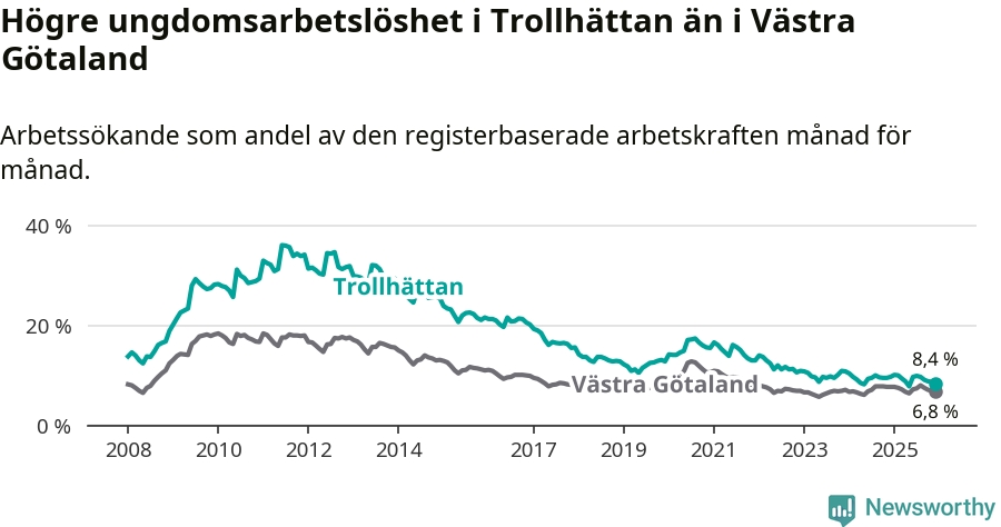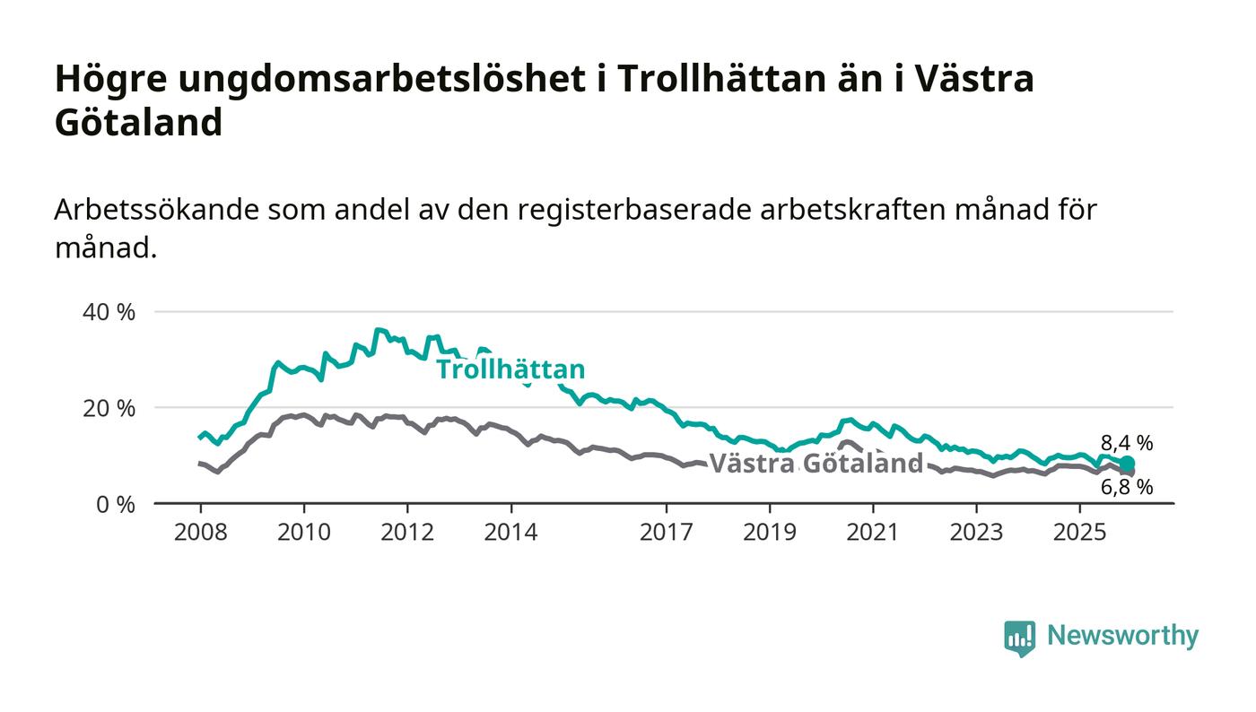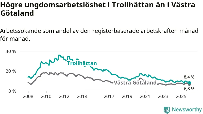 Precis som den totala arbetslösheten ligger ungdomsarbetslösheten i Trollhättan högre än i Västra Götaland som helhet. Skillnaden mellan kommunen och länet är 1,6 procentenheter.
