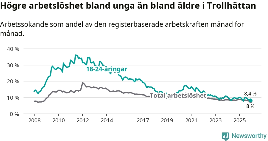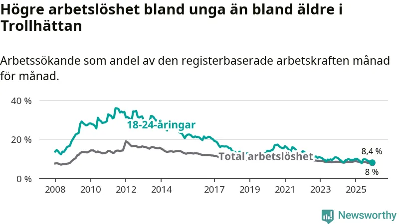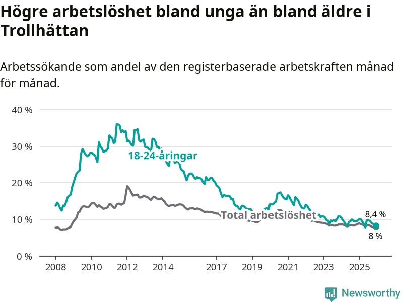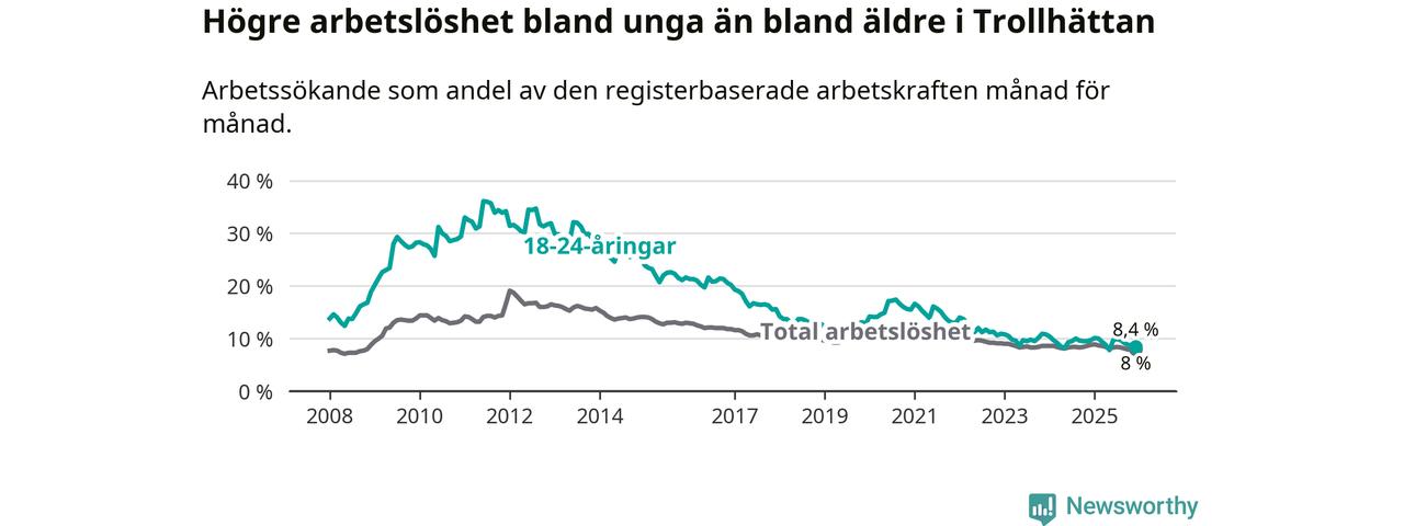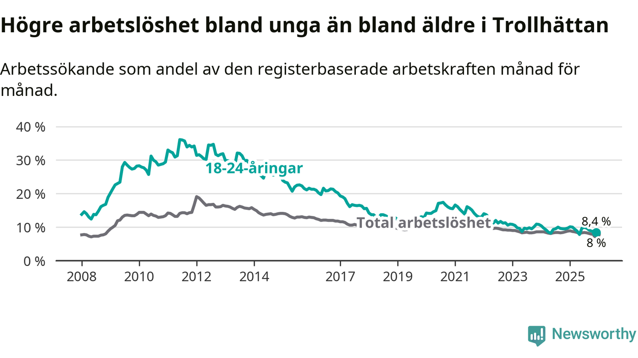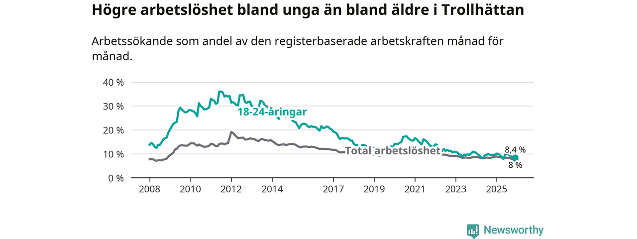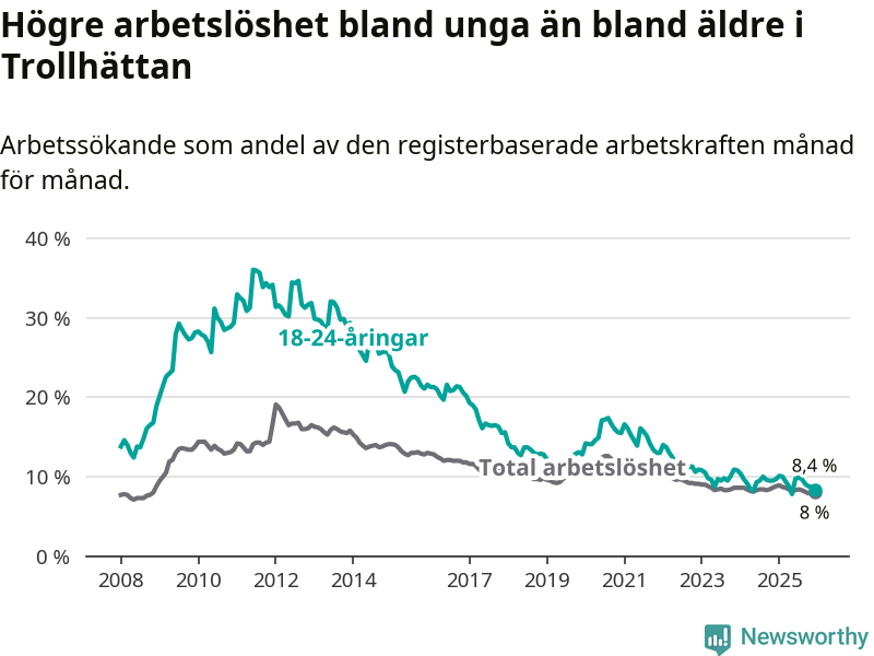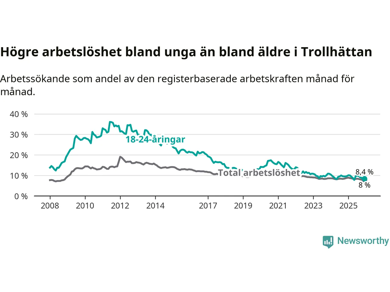Precis som den totala arbetslösheten ligger ungdomsarbetslösheten i Trollhättan högre än i Västra Götaland som helhet. Skillnaden mellan kommunen och länet är 1,6 procentenheter.