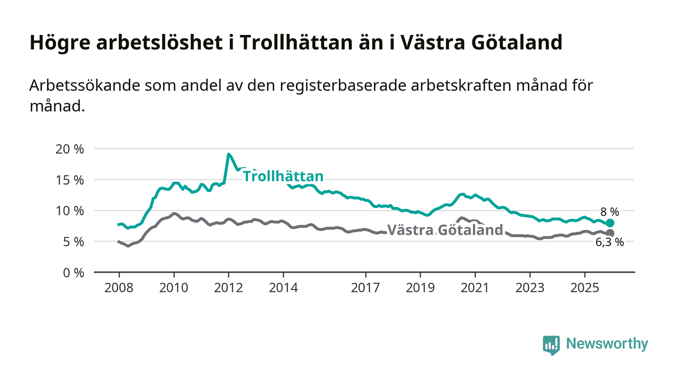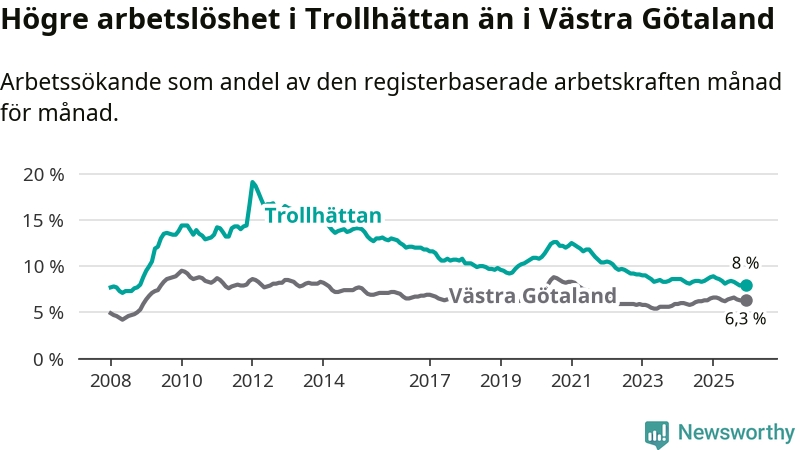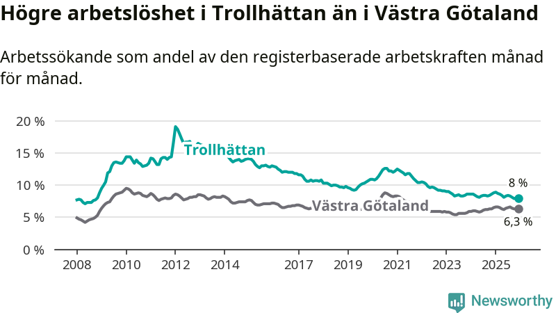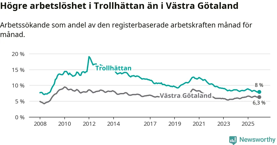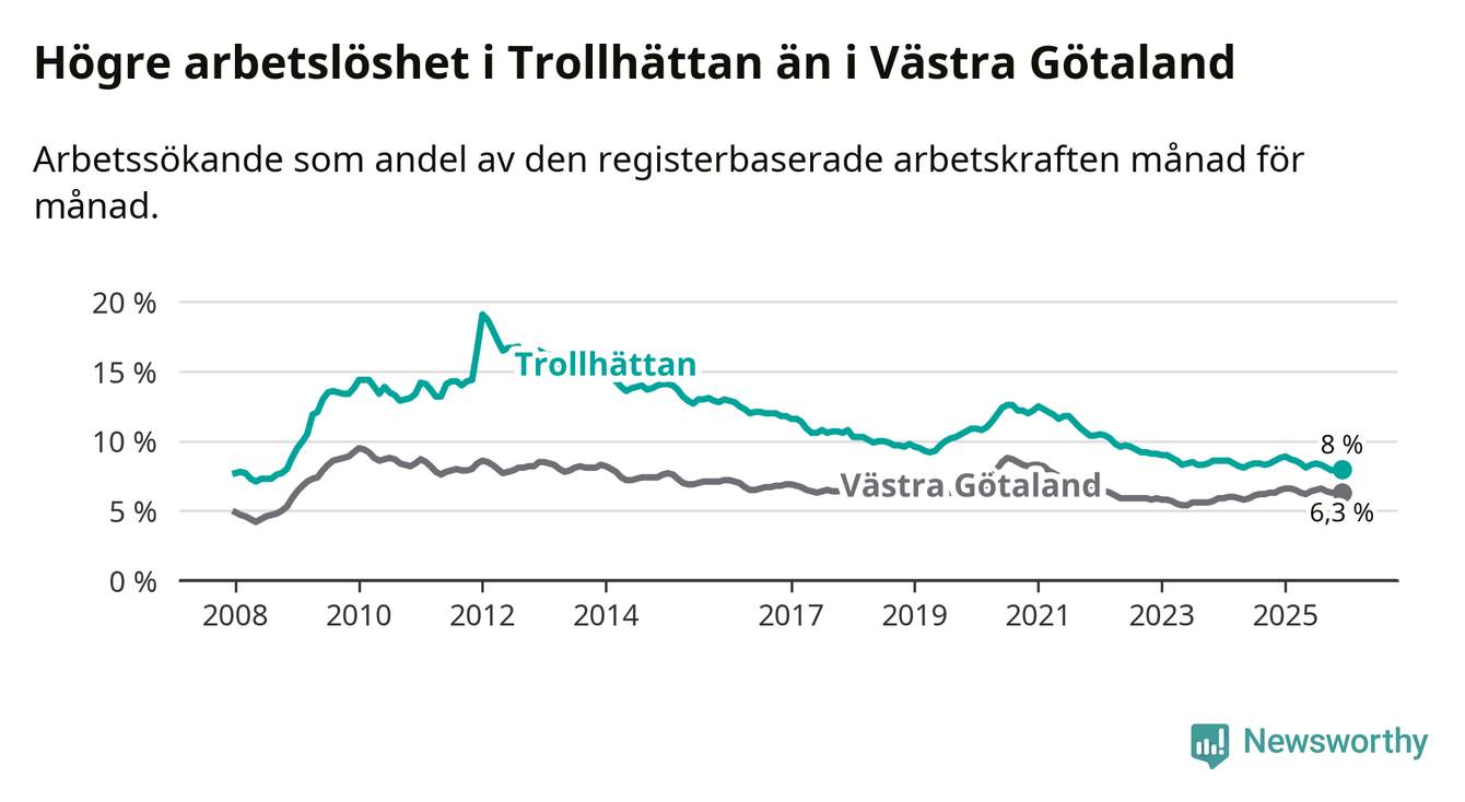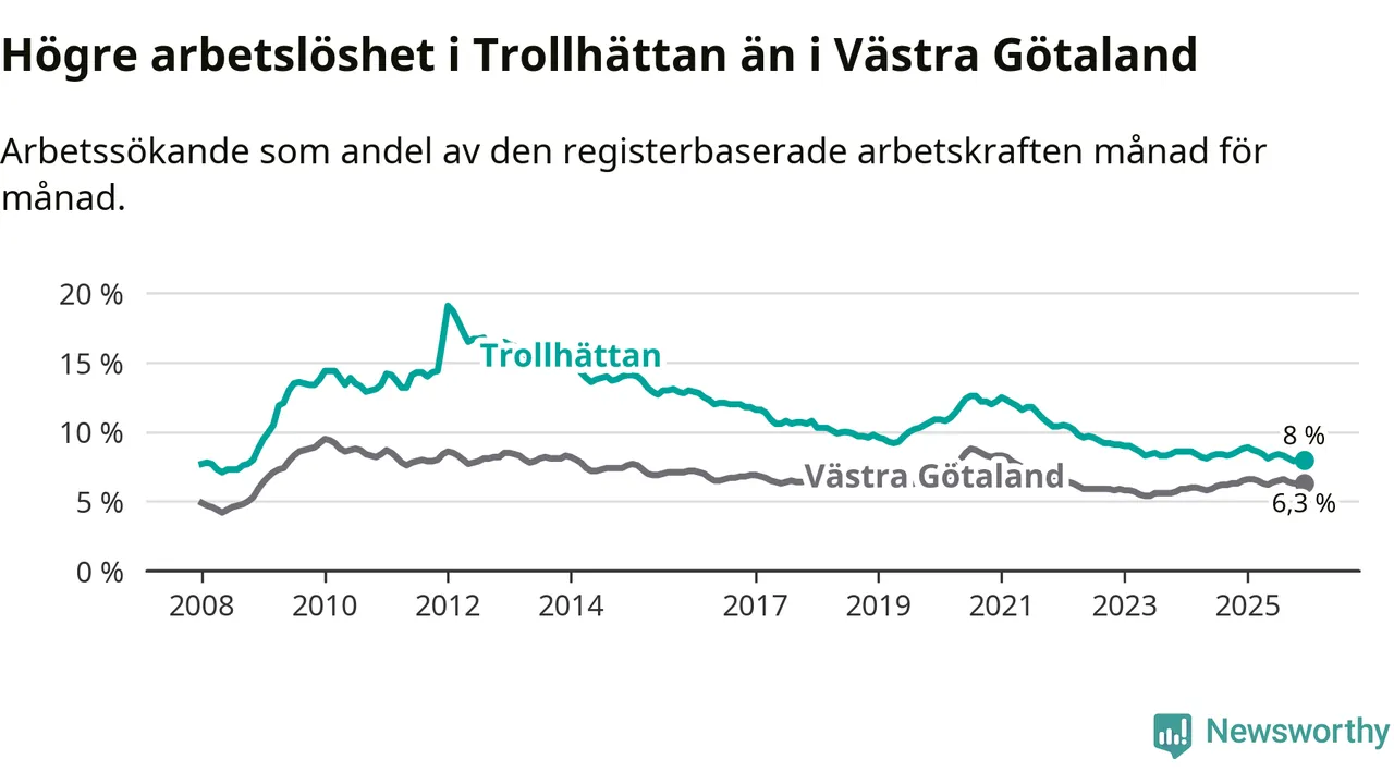 Under december månad rapporterade Trollhättans kommun en total arbetslöshet på 8,0 procent. Det är en minskning jämfört med samma tidpunkt i fjol (−0,8 procentenheter). Även i Västra Götalands län sjunker arbetslösheten .