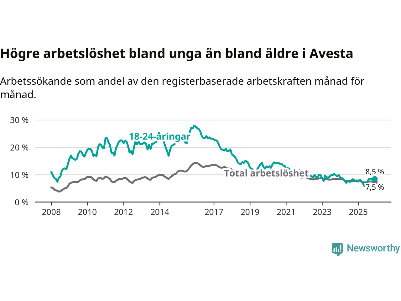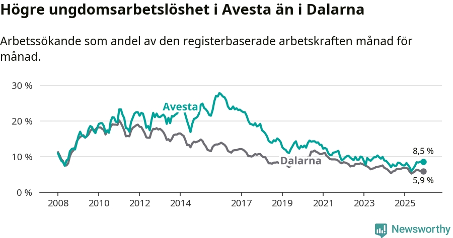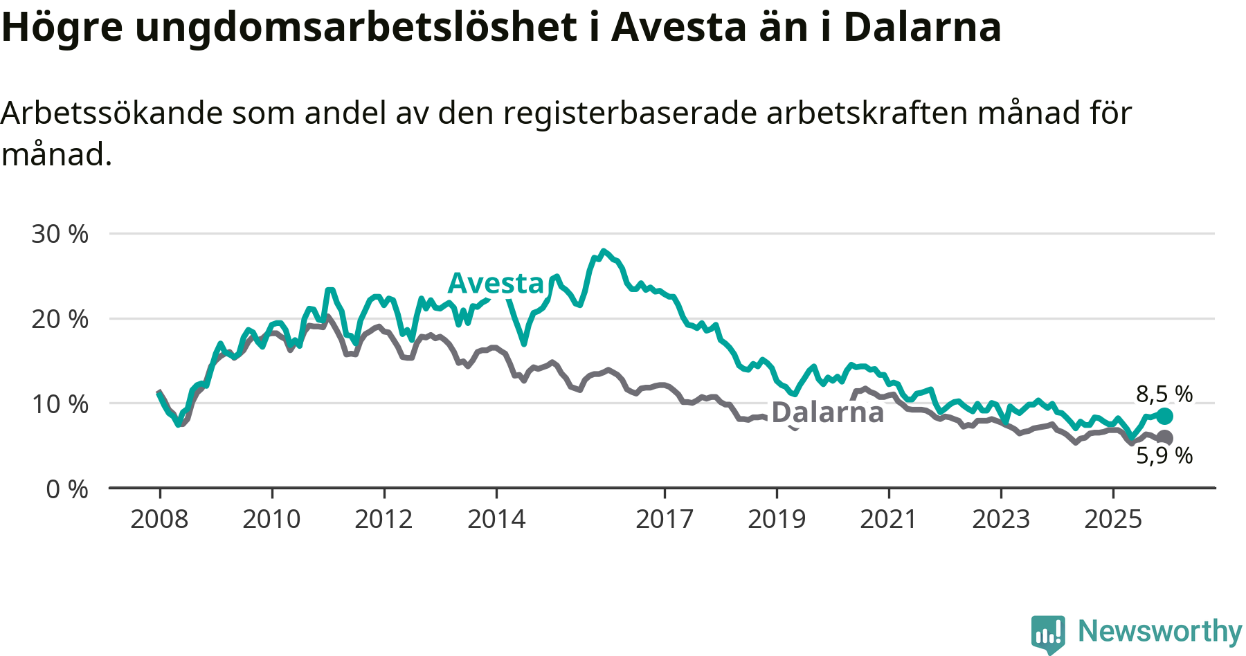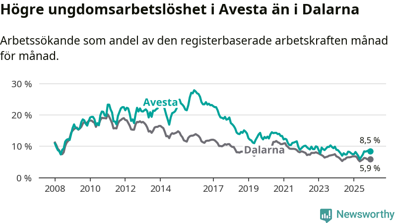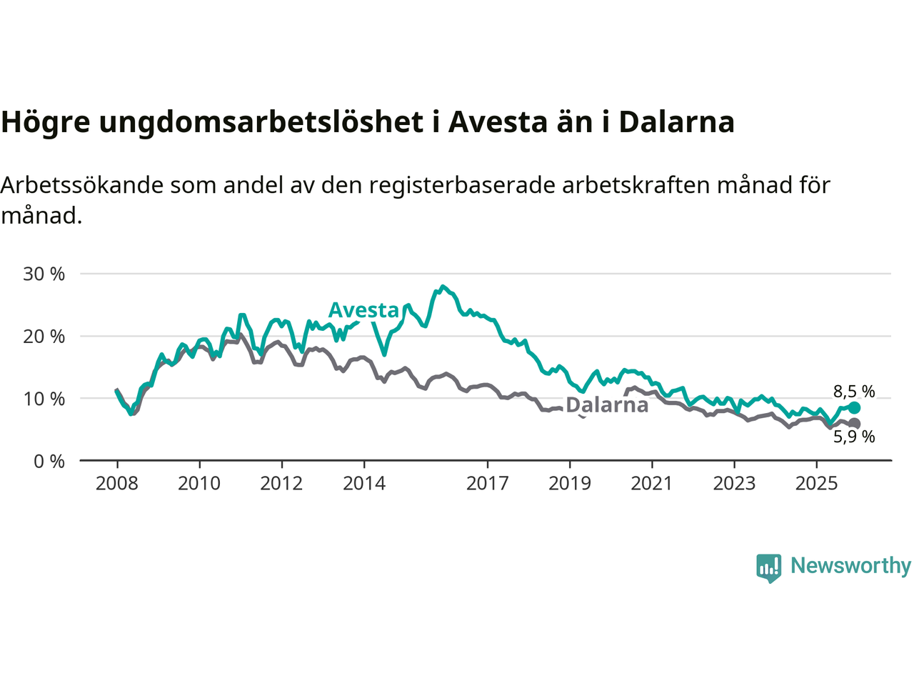 Precis som den totala arbetslösheten ligger ungdomsarbetslösheten i Avesta högre än i Dalarna som helhet. Skillnaden mellan kommunen och länet är 2,6 procentenheter.