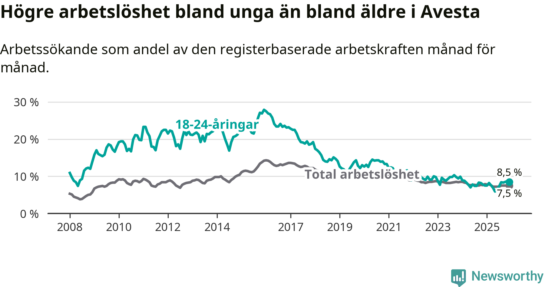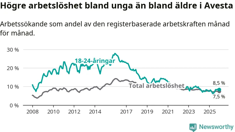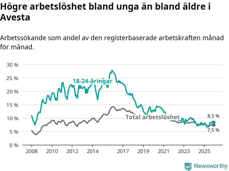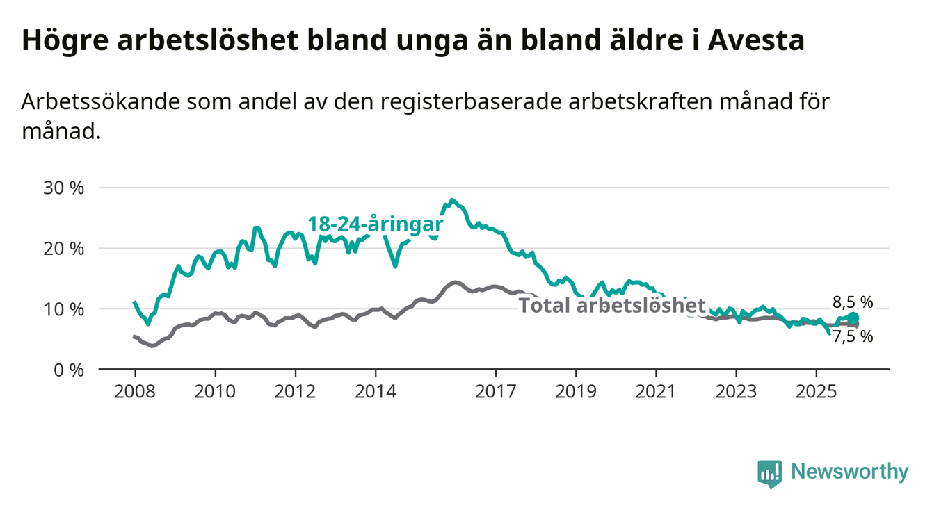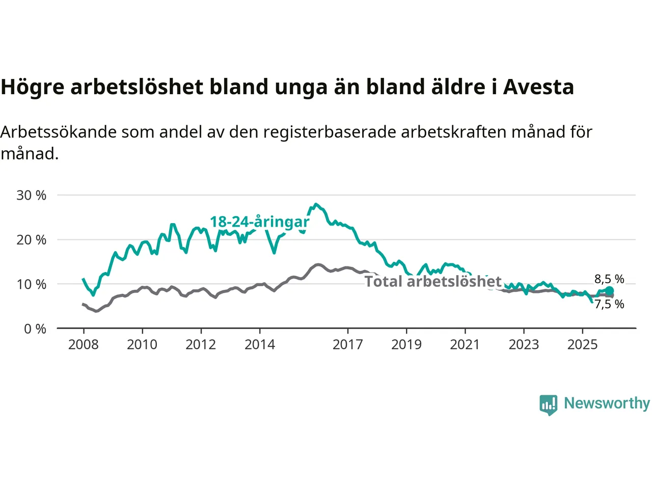 Precis som den totala arbetslösheten ligger ungdomsarbetslösheten i Avesta högre än i Dalarna som helhet. Skillnaden mellan kommunen och länet är 2,6 procentenheter.