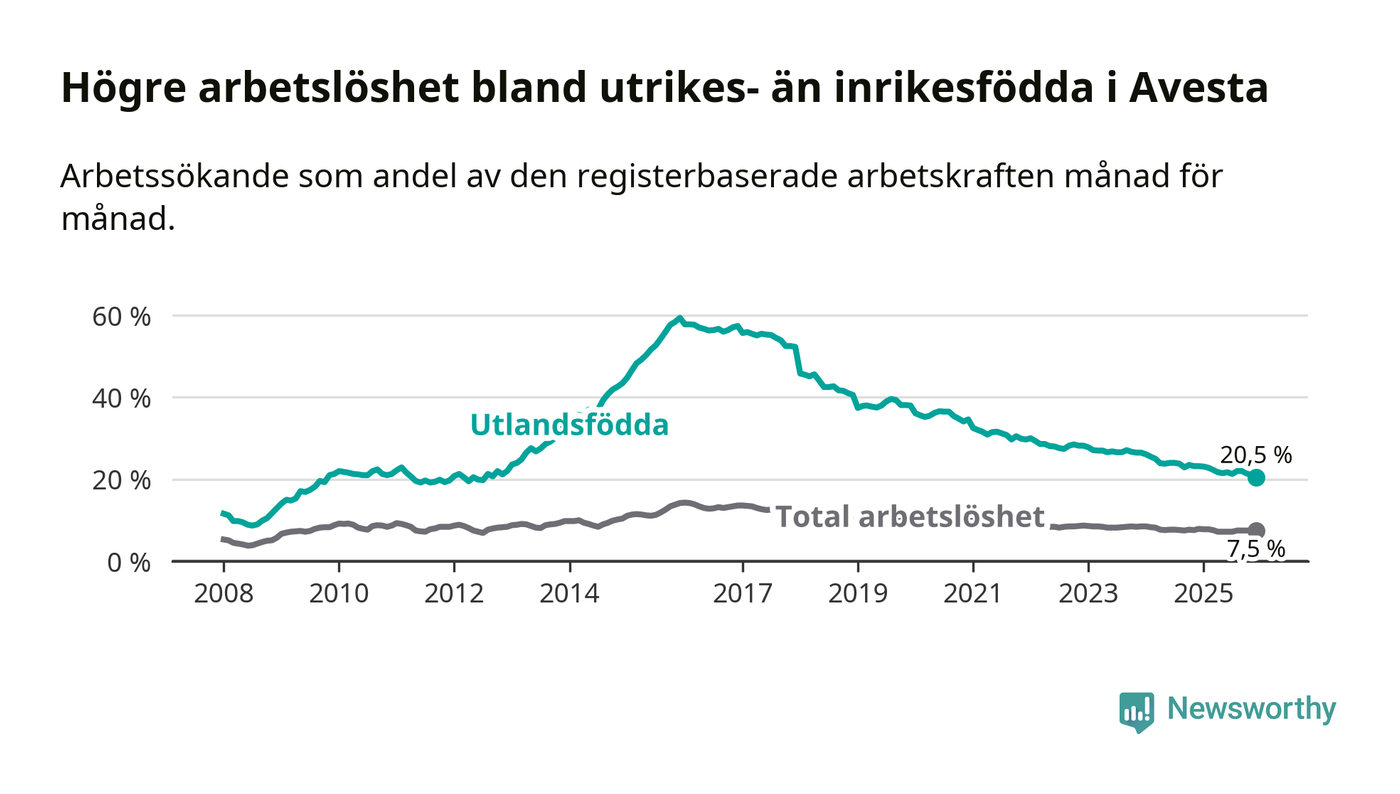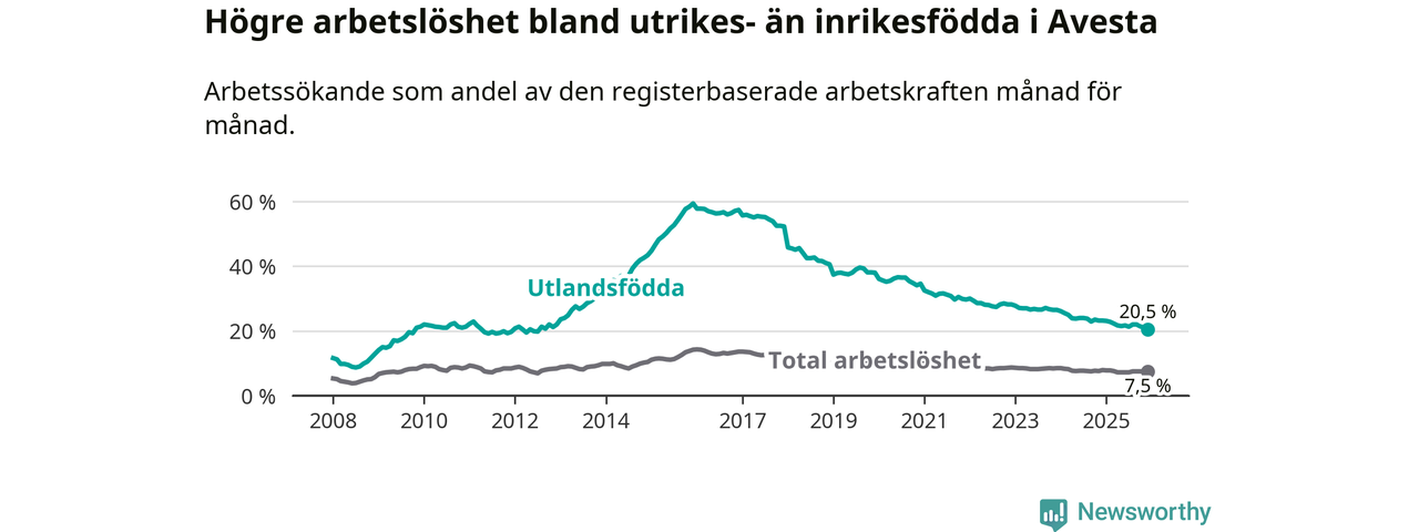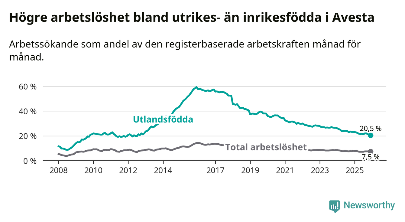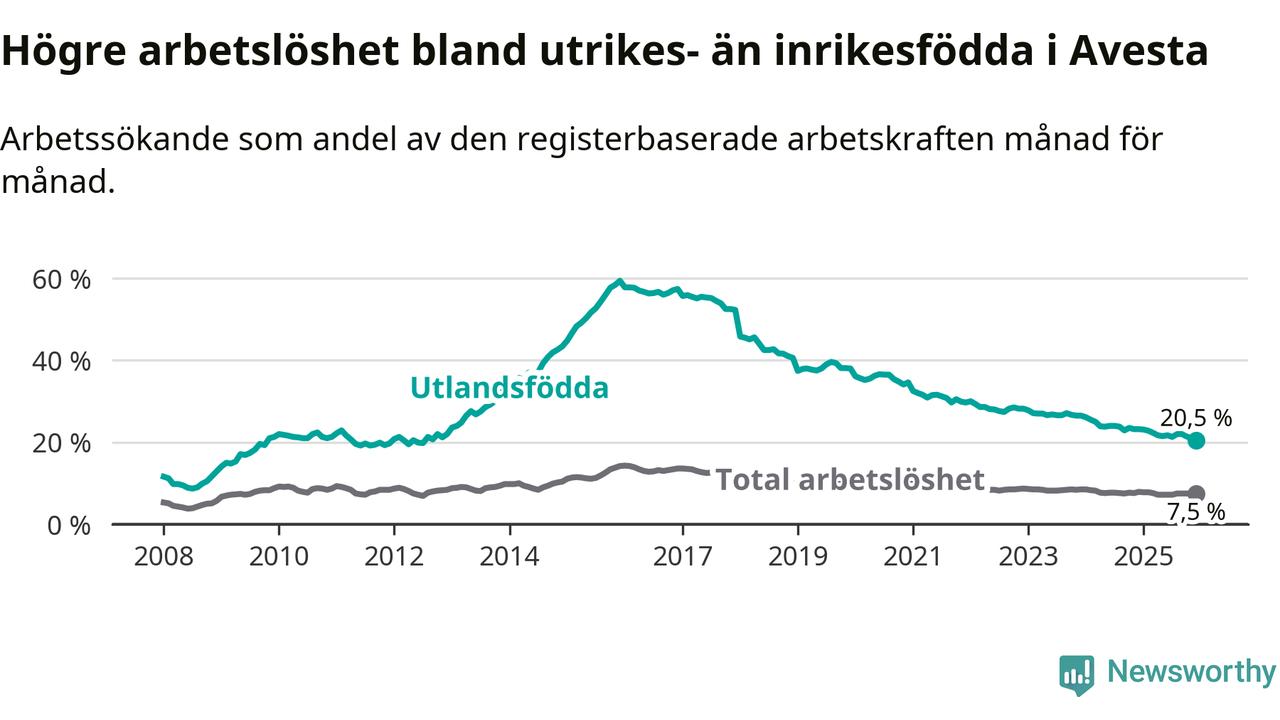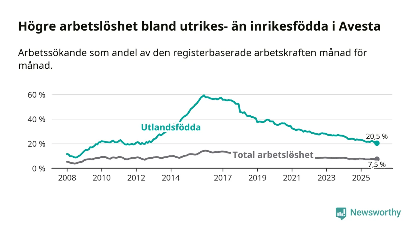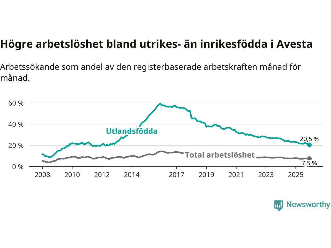 Skillnaden i arbetslöshet mellan utrikesfödda och hela befolkningen är 13,0 procentenheter i Avesta. Det är en betydligt mindre skillnad än för ett år sedan (−2,3 procentenheter).